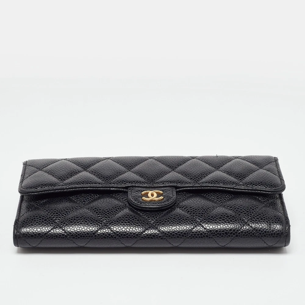 This designer wallet is an immaculate balance of sophistication and rational utility. It has been designed using prime quality materials and elevated by a sleek finish. The creation is equipped with ample space for your monetary essentials.Certified by The Luxury Closet - This item has gone through a detailed authentication process overseen by our experts. We offer a lifetime guarantee of authenticity on all our items. Import duties, taxes and charges are not included in the item price. These charges are the buyers responsibility. Please check with your country’s customs office to determine what these additional cost will be prior to buying. Our eBay Store About Us Contact Us Add to Favorite Sellers Chanel Black Caviar Quilted Leather Classic Long Flap Wallet $1107.7 This designer wallet is an immaculate balance of sophistication and rational utility. It has been designed using prime quality materials and elevated by a sleek finish. The creation is equipped with ample space for your monetary essentials. Product Details Brand Color Black Dimensions Height: 10 cm, Width: 9.5 cm, Length: 19 cm Material Leather Size Outsole Width Outsole Length Heel Height Includes The Luxury Closet Packaging Certified by The Luxury Closet This item has gone through a detailed authentication process overseen by our experts. We offer a lifetime guarantee of authenticity on all our items. How We Check The in-house team of experts at The Luxury Closet is highly trained to verify the authenticity and the condition of the luxury products. They ensure that only 100% authentic items are put on sale.The evaluation process is unique with its own mix of assessment criteria and differs according to the category. Each item is evaluated based on the following combination of hallmarks, hardware, stitching, symmetry, material, craftsmanship, stamping, codes, hologram stickers, and packaging. Our authenticators also check if the items have been modified or amended (e.g., aftermarket diamonds, replaced batteries, repaired bags, etc.) International Buyers Import duties, taxes and charges are not included in the item price. These charges are the buyers responsibility. Please check with your country’s customs office to determine what these additional cost will be prior to buying.