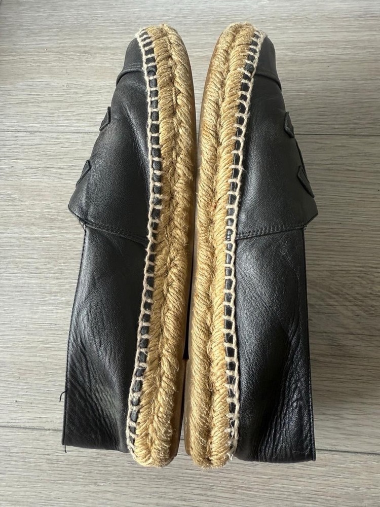 The product is a pair of Chanel Black Lambskin CC Espadrilles Cap Toe in Size 40. These stylish flat shoes feature a solid black color with a round toe and slip-on closure for easy wear. Made of leather with a lambskin leather lining, they are designed for casual occasions and have a minimal cushioning level for comfort. The iconic CC logo is featured on the toe, adding a touch of luxury to the design. Crafted in Italy, these 2019 Chanel flats are a chic addition to any woman's shoe collection.