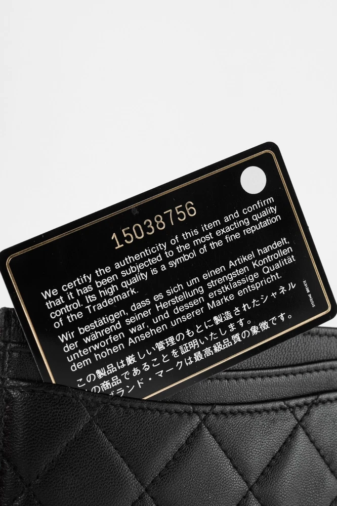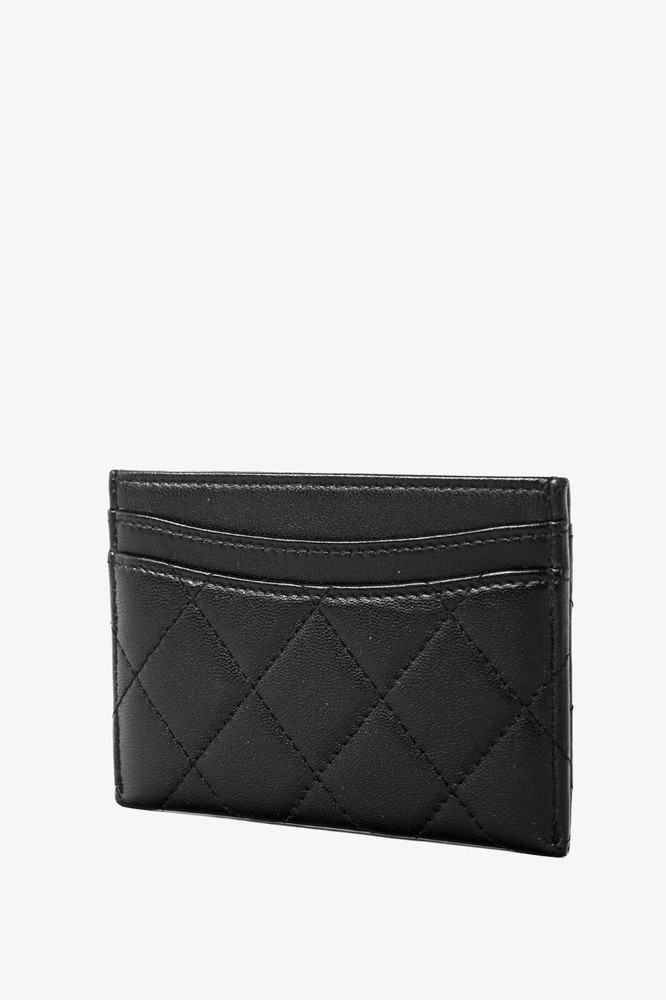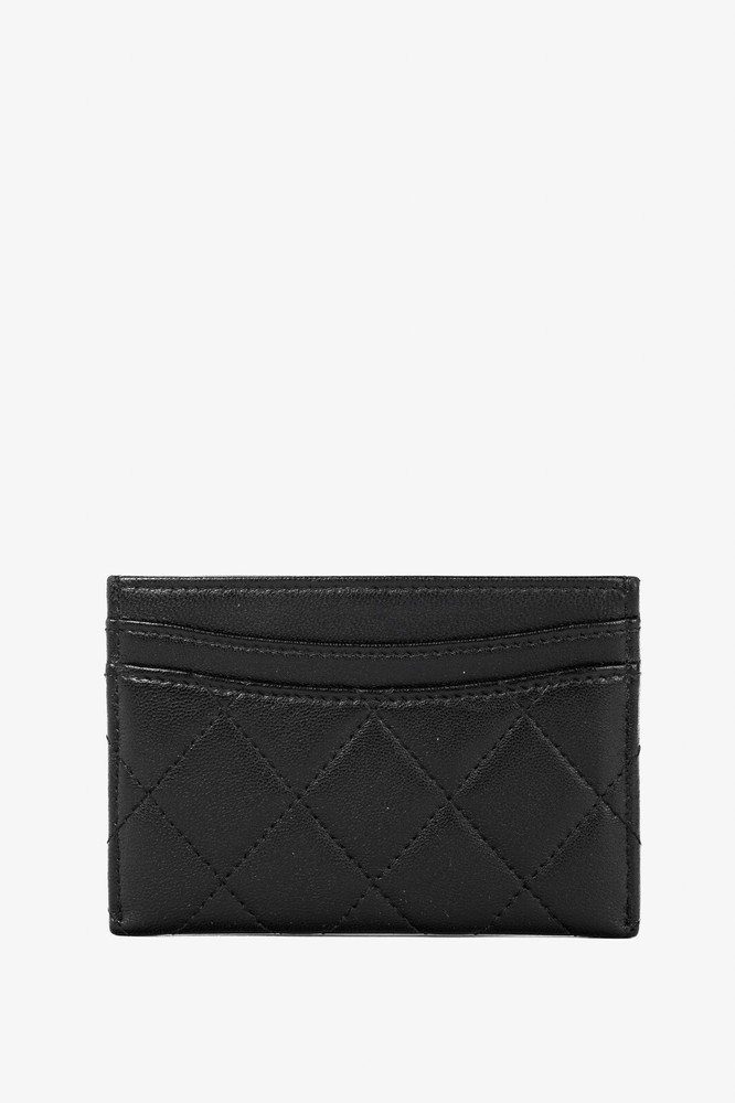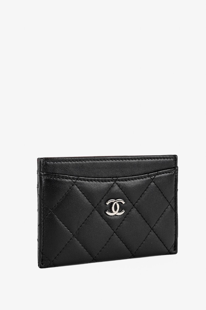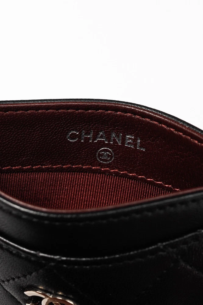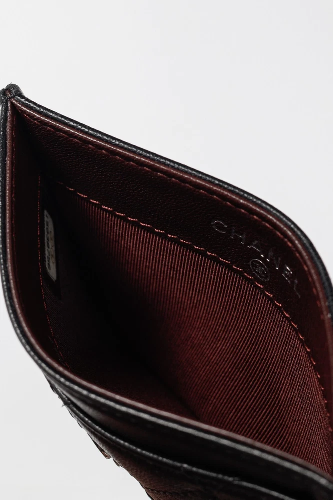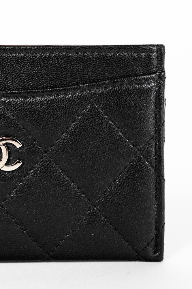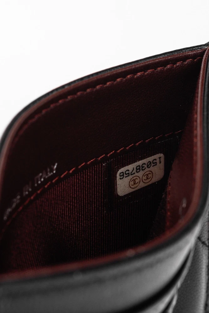 Made in Italy, this card holder from Chanel is crafted in a black lambskin leather with diamond quilting throughout, and features a silver-tone interlocking CC logo on the front, three card slots, and a burgundy textile-lined slot in the middle. Condition: Excellent; very faint scratching on exterior, hairline scratching on logo. Comes with authenticity card, care booklets, and box. Approximate measurements: Height: 3" (7.5 cm) Width: 4.25" (11 cm) Composition: Leather, textile lining, metal hardware.