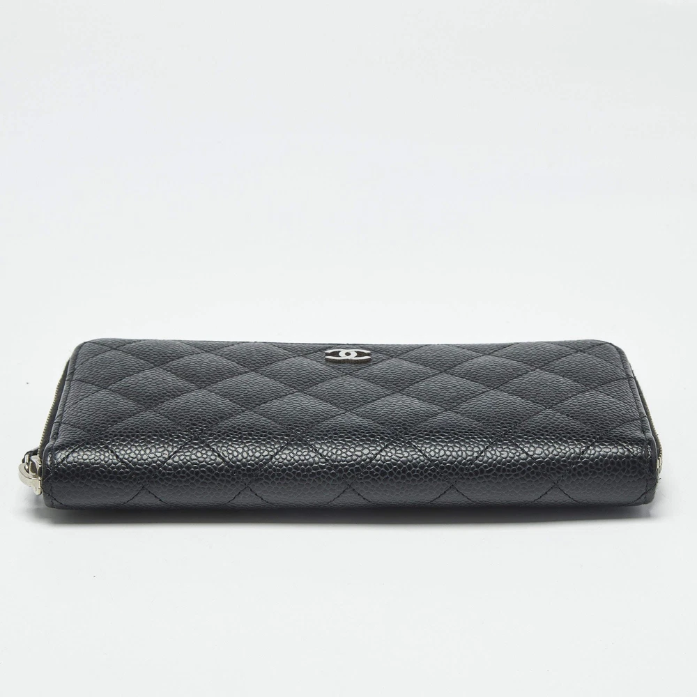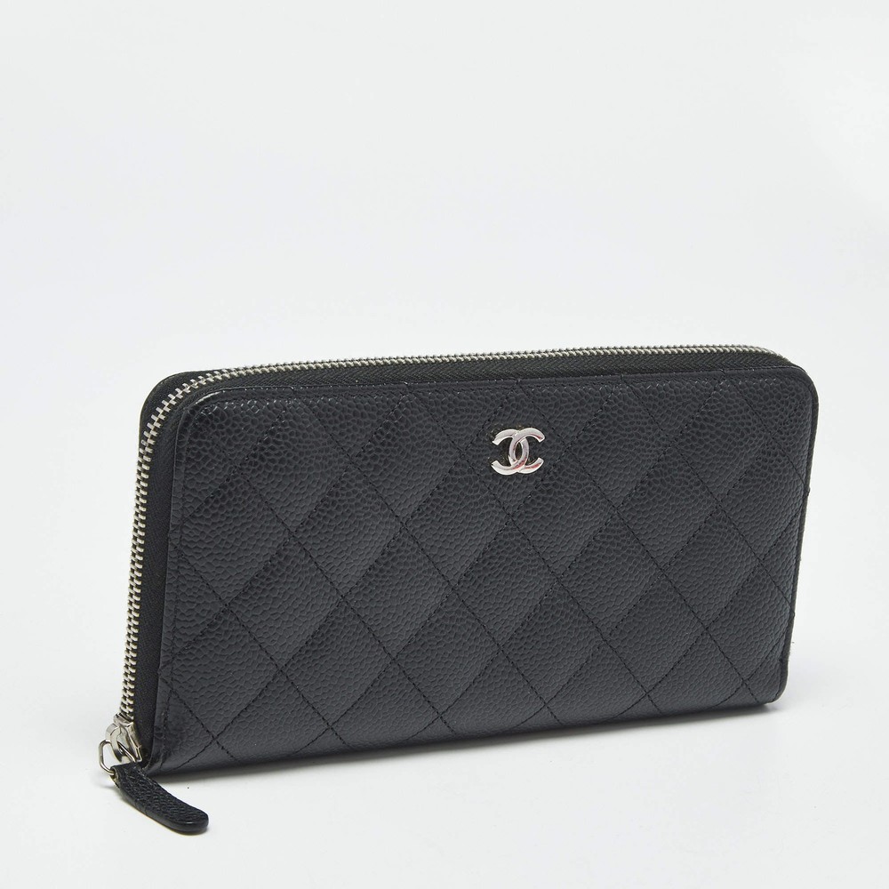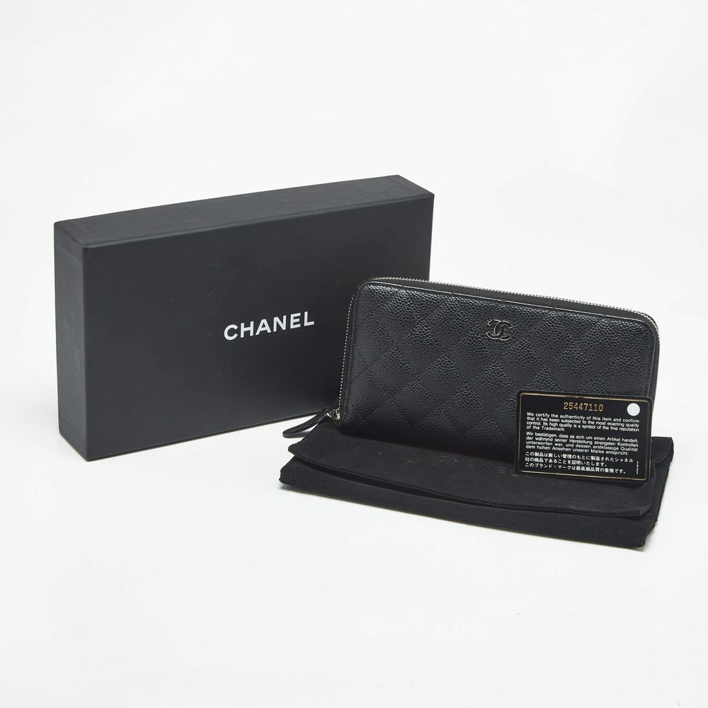 Our eBay Store About Us Contact Us Add to Favorite Sellers Chanel Black Quilted Caviar Leather CC Zip Around Wallet $706 Crafted from caviar leather and finished with Chanel’s iconic quilting, this sleek black wallet is both refined and resilient. The CC zip-around closure ensures your valuables stay stylishly secure. Product Details Brand Chanel Color Black Includes Authenticity Card, Original Box, Original Pouch Material Leather and Nylon Certified by The Luxury Closet This item has gone through a detailed authentication process overseen by our experts. We offer a lifetime guarantee of authenticity on all our items. How We Check The in-house team of experts at The Luxury Closet is highly trained to verify the authenticity and the condition of the luxury products. They ensure that only 100% authentic items are put on sale.The evaluation process is unique with its own mix of assessment criteria and differs according to the category. Each item is evaluated based on the following combination of hallmarks, hardware, stitching, symmetry, material, craftsmanship, stamping, codes, hologram stickers, and packaging. Our authenticators also check if the items have been modified or amended (e.g., aftermarket diamonds, replaced batteries, repaired bags, etc.) International Buyers Import duties, taxes and charges are not included in the item price. These charges are the buyers responsibility. Please check with your country’s customs office to determine what these additional cost will be prior to buying.
