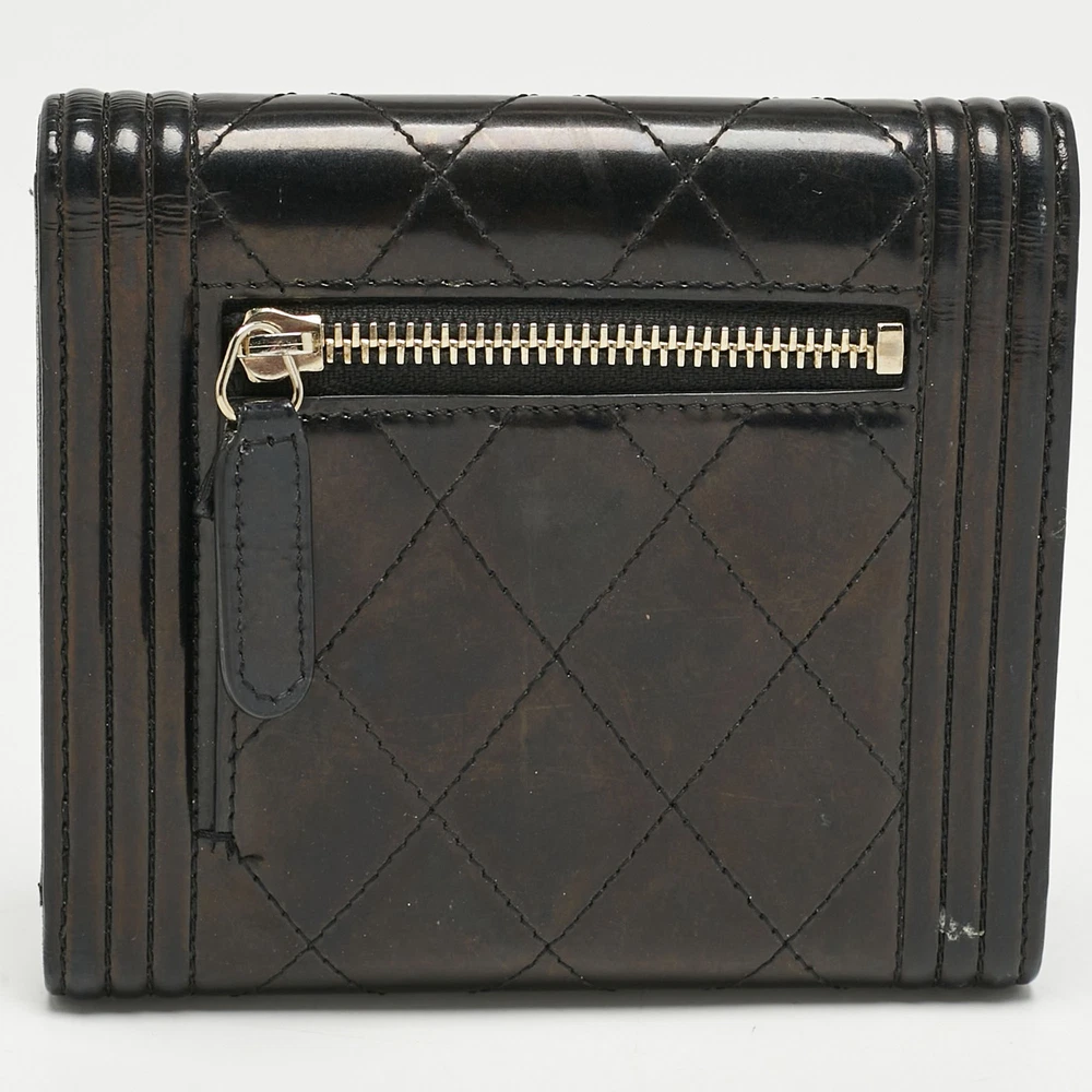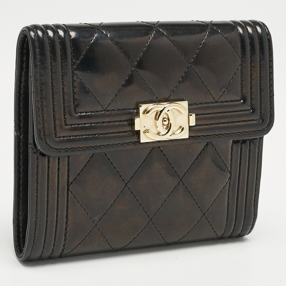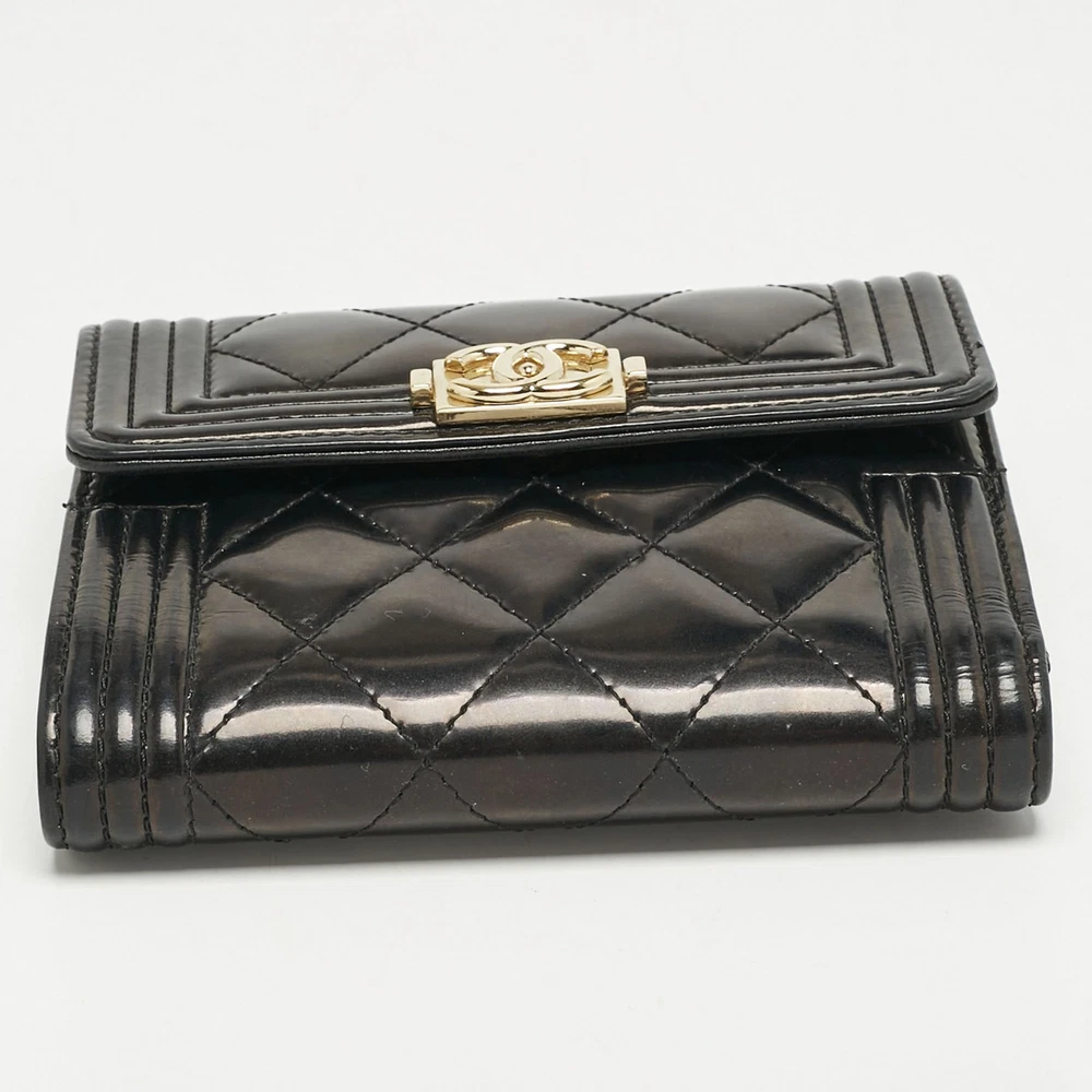 Our eBay Store About Us Contact Us Add to Favorite Sellers Chanel Black Quilted Patent Leather Boy Compact Wallet Chanel's Boy compact wallet is crafted from Caviar leather and it flaunts the everlasting quilted pattern all over and the iconic Boy CC logo in gold-tone on the front. Styled in black shade, the wallet has multiple slots and a main compartment to neatly hold your essentials. Product Details Brand Chanel Color Black Material Patent Leather Certified by The Luxury Closet This item has gone through a detailed authentication process overseen by our experts. We offer a lifetime guarantee of authenticity on all our items. How We Check The in-house team of experts at The Luxury Closet is highly trained to verify the authenticity and the condition of the luxury products. They ensure that only 100% authentic items are put on sale.The evaluation process is unique with its own mix of assessment criteria and differs according to the category. Each item is evaluated based on the following combination of hallmarks, hardware, stitching, symmetry, material, craftsmanship, stamping, codes, hologram stickers, and packaging. Our authenticators also check if the items have been modified or amended (e.g., aftermarket diamonds, replaced batteries, repaired bags, etc.) International Buyers Import duties, taxes and charges are not included in the item price. These charges are the buyers responsibility. Please check with your country’s customs office to determine what these additional cost will be prior to buying.