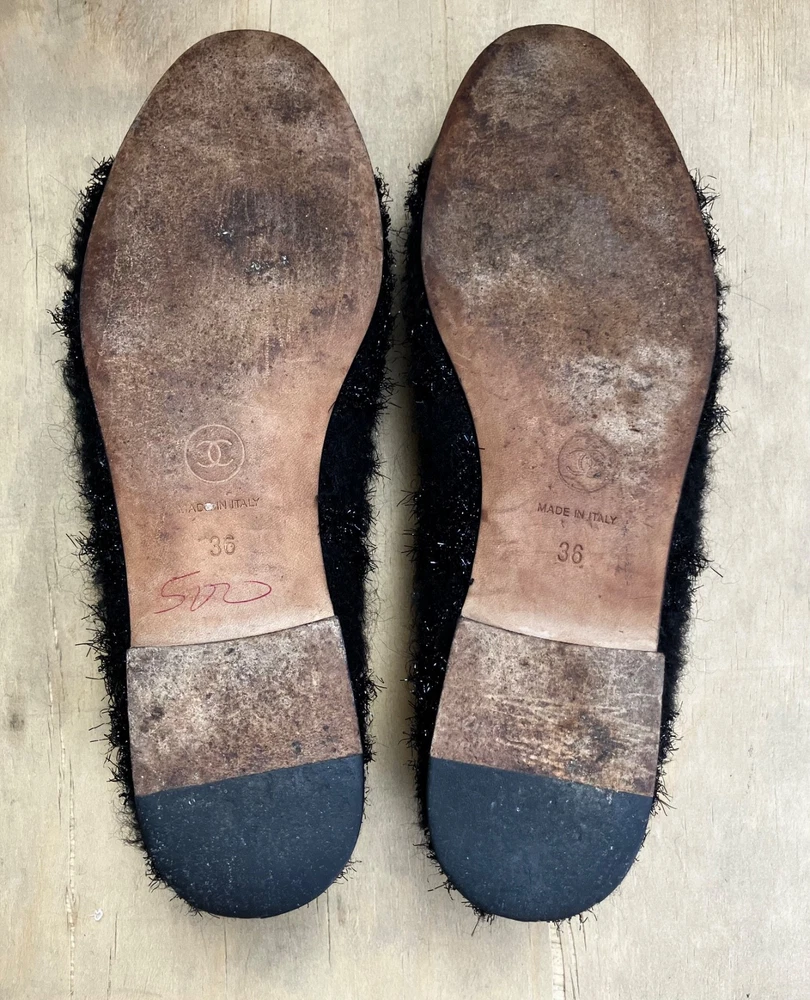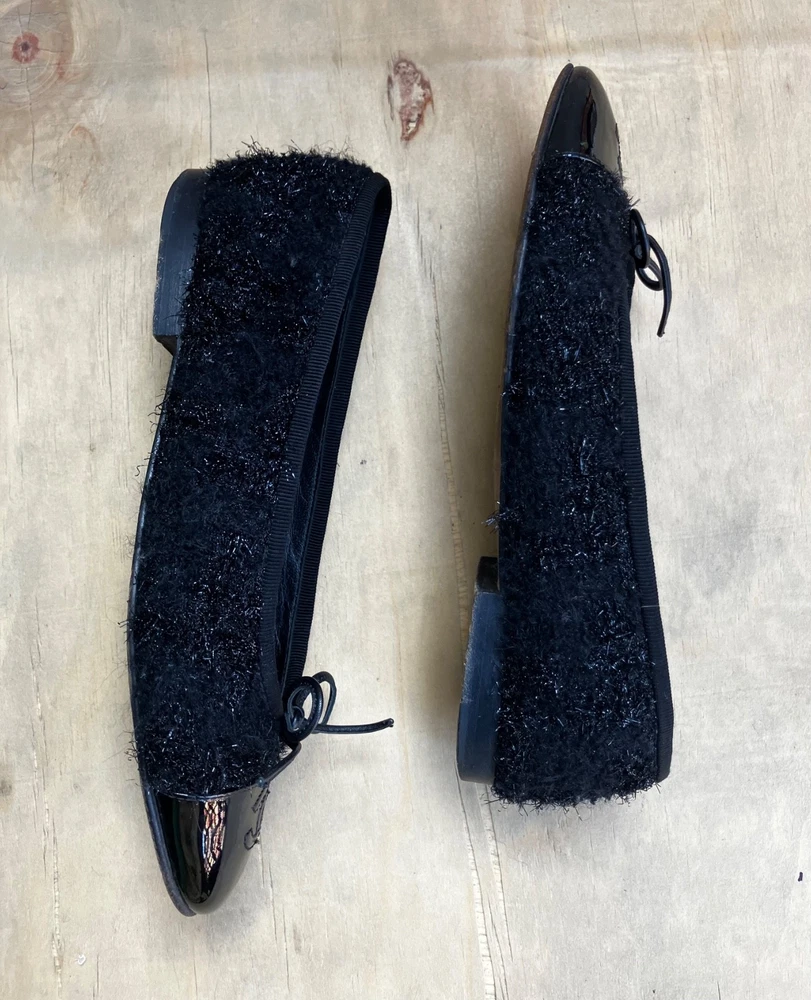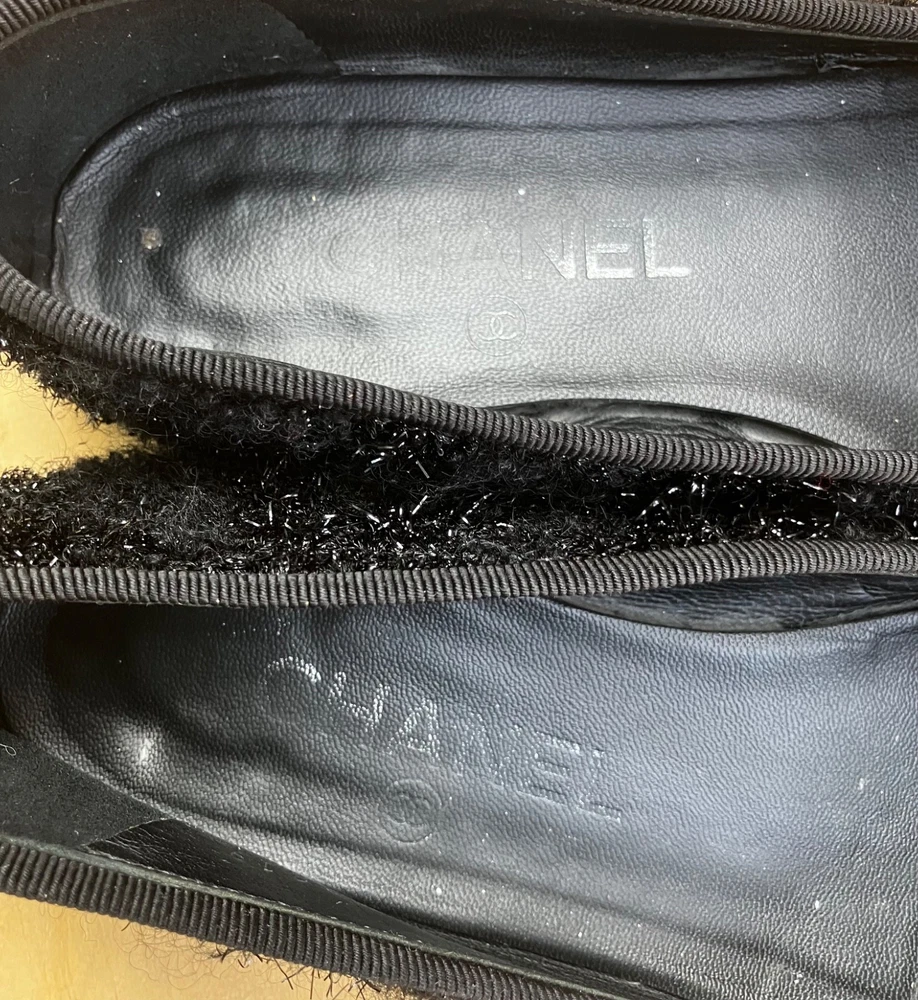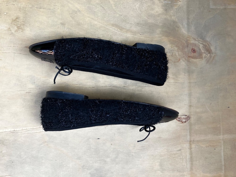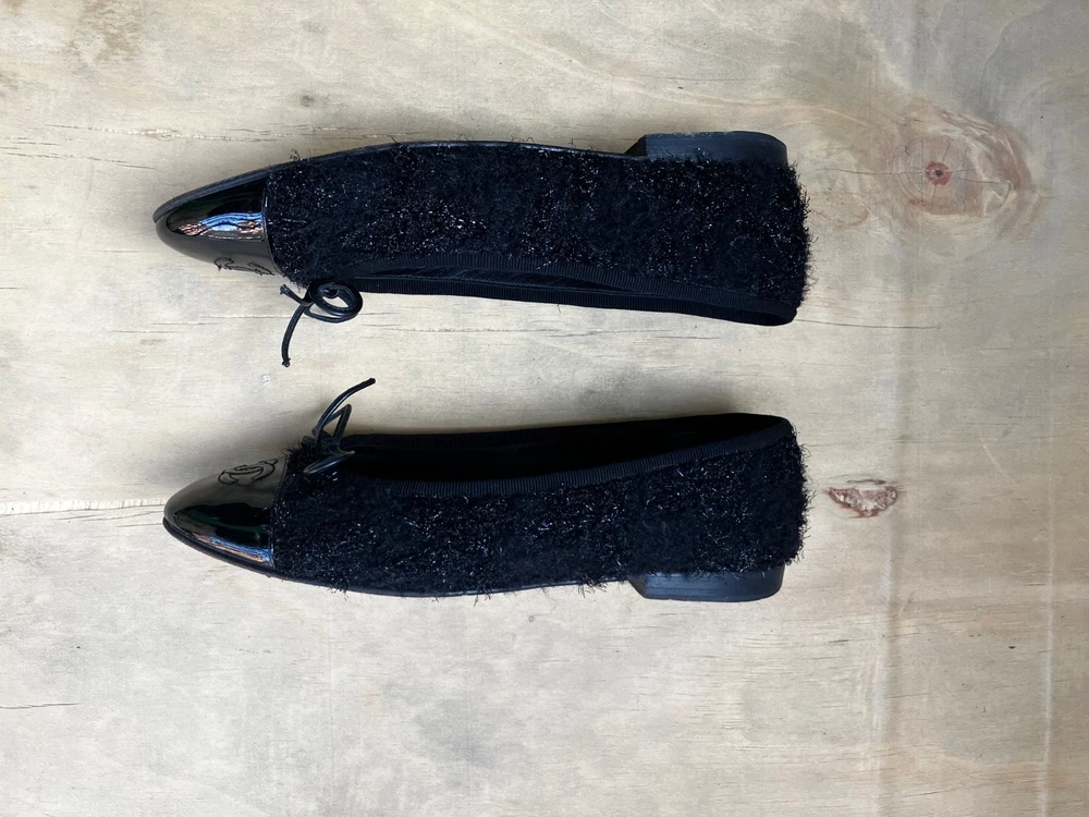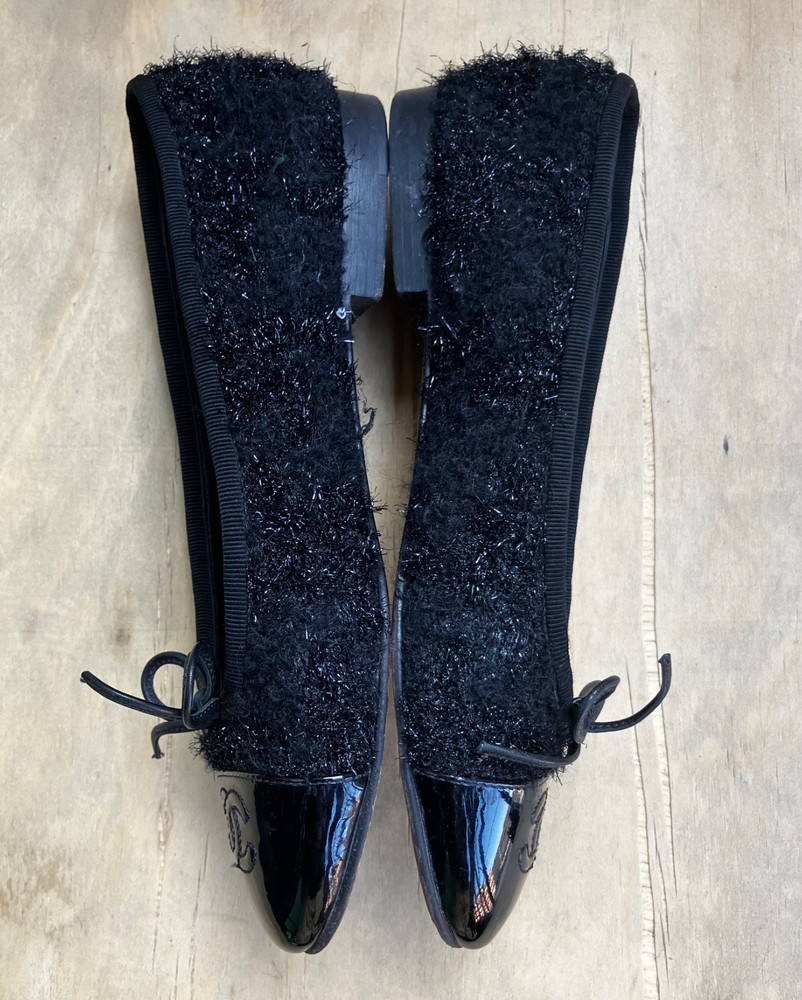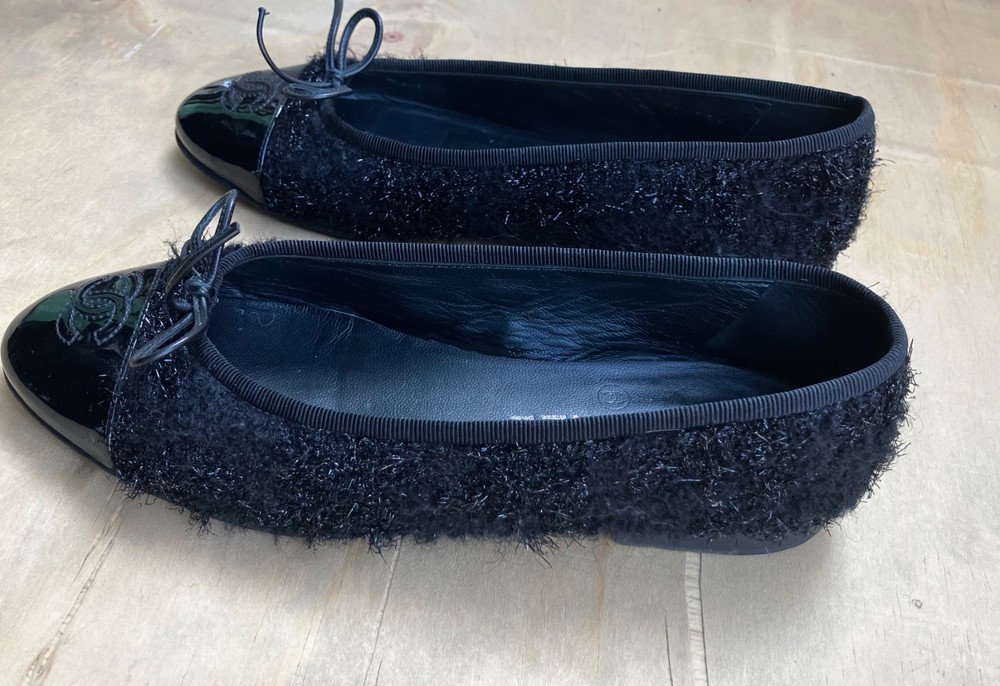 The Chanel Black Tweed ballerina flats in size 36 are a stylish and versatile option for women. Featuring a round toe shape, slip-on closure, and made from leather with a tweed fabric type, these flats are perfect for casual occasions in the summer and spring seasons. The black color and cap toe accents add a touch of sophistication to the ballet-style design. Made in Italy, these lightweight and comfortable flats offer a chic and breathable option for women looking to elevate their shoe collection with a designer touch from Chanel.