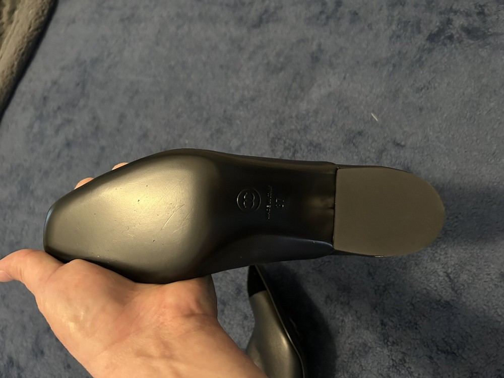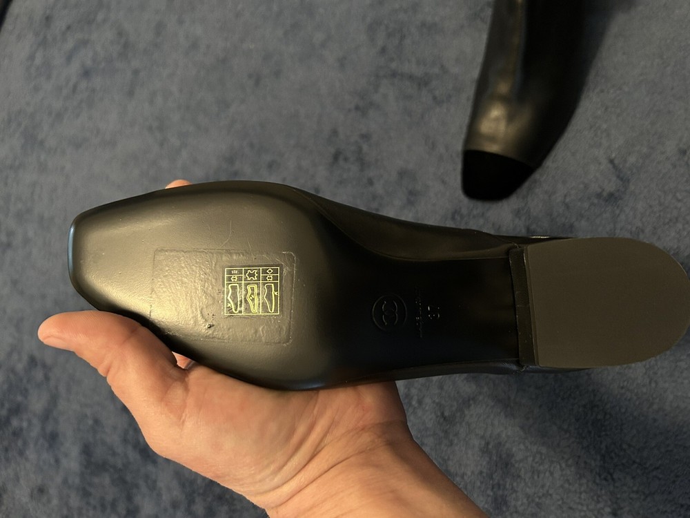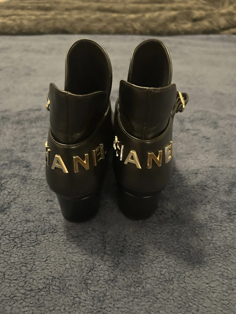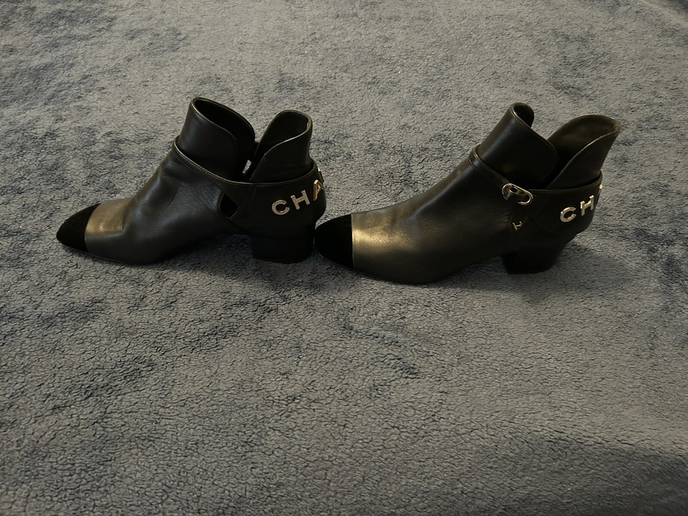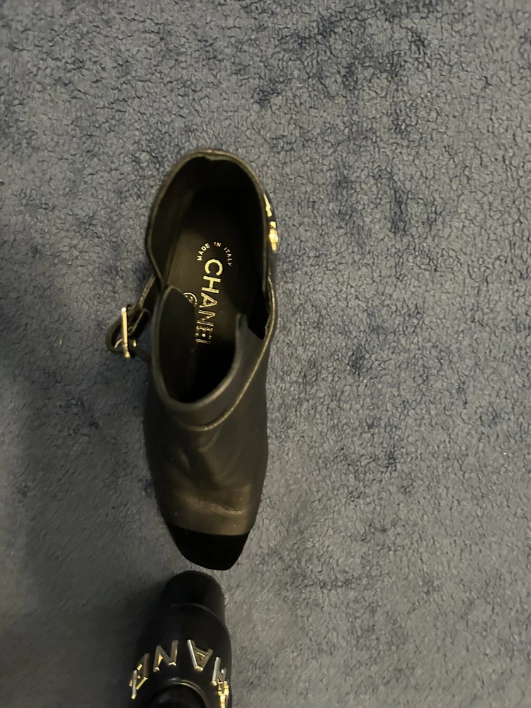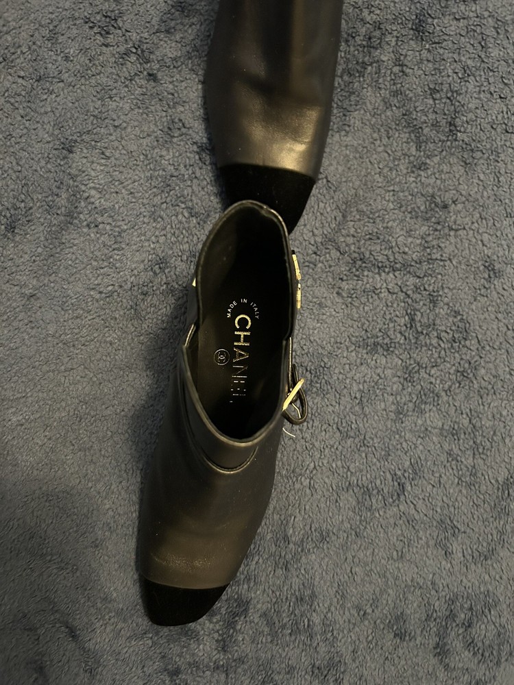These are CHANEL heels for women in US Size 6.5 and EU Size 37. The shoes are black in color with a solid pattern. They feature a pointed toe design and a mid heel height. The upper material is a combination of leather and suede, and they have a buckle closure.