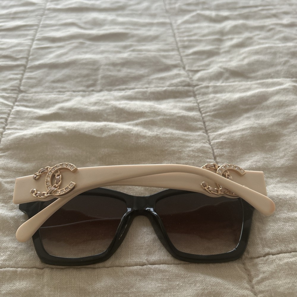 This is a pre-owned pair of Chanel Cat Eye Sunglasses with a multicolor acetate frame and black lenses. They offer UV400 protection and are designed for women. These designer sunglasses were made in Italy and feature the iconic Chanel brand.