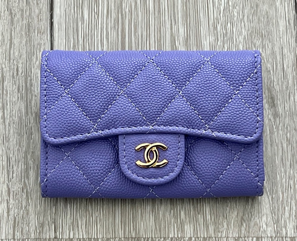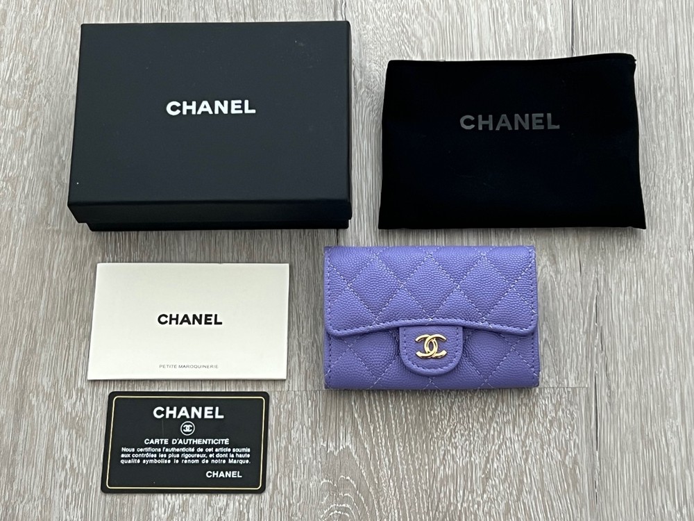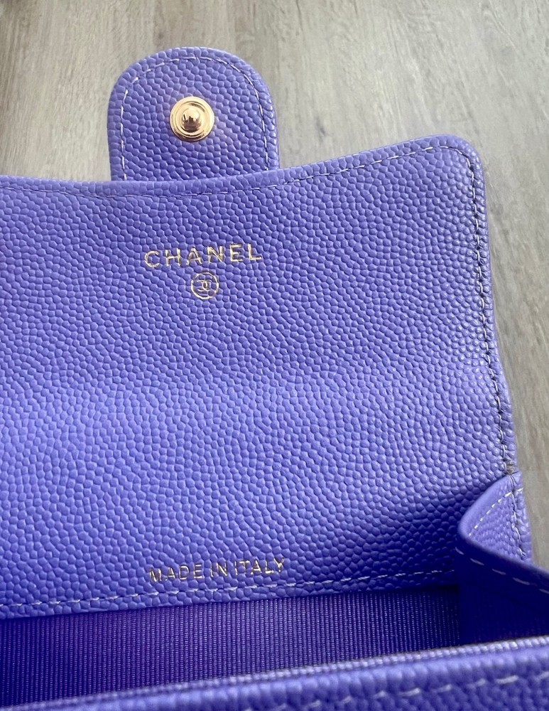 This Chanel Classic Flap Card Holder features luxurious purple caviar leather and elegant gold-tone hardware. It’s in pristine, never-used condition, just as perfect as if you picked it up from the boutique yourself. I’ve listed it as “pre-owned” simply because I’m a private seller and not an authorized Chanel retailer, even though the item is brand new.