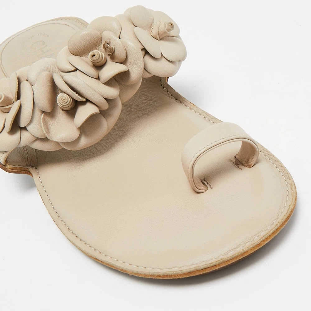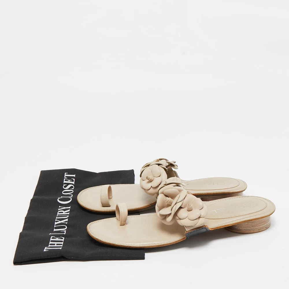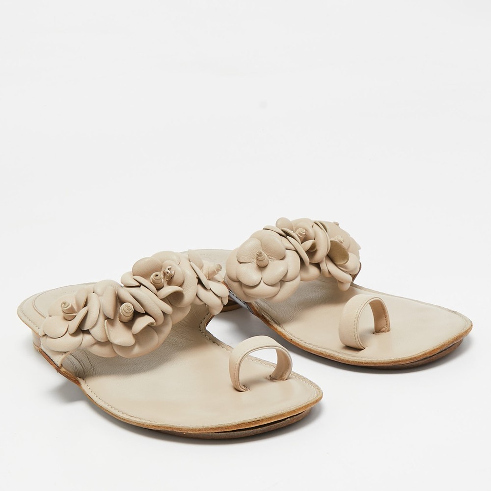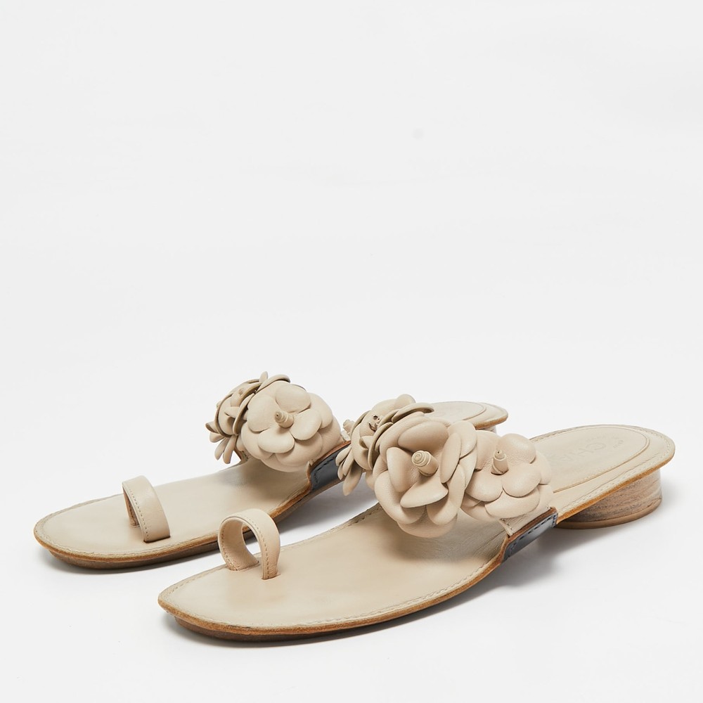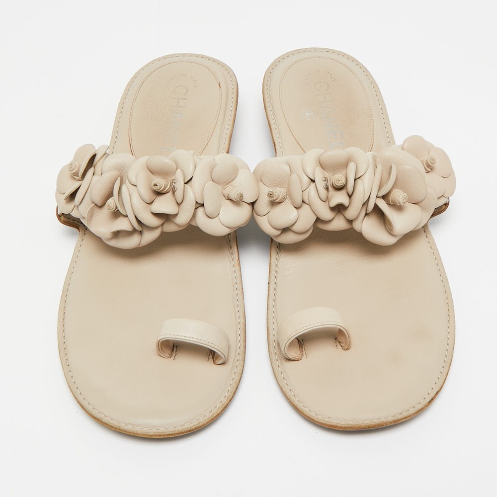 Create effortless styles with these Chanel flats. Made of quality materials, they are designed to elevate your OOTD and keep you in comfort all day long.Certified by The Luxury Closet - This item has gone through a detailed authentication process overseen by our experts. We offer a lifetime guarantee of authenticity on all our items. Import duties, taxes and charges are not included in the item price. These charges are the buyers responsibility. Please check with your country’s customs office to determine what these additional cost will be prior to buying. Our eBay Store About Us Contact Us Add to Favorite Sellers Chanel Cream Leather Camellia Toe Ring Flat Sandals Size 39 $618.2 Create effortless styles with these Chanel flats. Made of quality materials, they are designed to elevate your OOTD and keep you in comfort all day long. Product Details Brand Color Cream Dimensions Material Leather Size 39 Outsole Width 8 cm Outsole Length 25 cm Heel Height Includes The Luxury Closet Packaging Certified by The Luxury Closet This item has gone through a detailed authentication process overseen by our experts. We offer a lifetime guarantee of authenticity on all our items. How We Check The in-house team of experts at The Luxury Closet is highly trained to verify the authenticity and the condition of the luxury products. They ensure that only 100% authentic items are put on sale.The evaluation process is unique with its own mix of assessment criteria and differs according to the category. Each item is evaluated based on the following combination of hallmarks, hardware, stitching, symmetry, material, craftsmanship, stamping, codes, hologram stickers, and packaging. Our authenticators also check if the items have been modified or amended (e.g., aftermarket diamonds, replaced batteries, repaired bags, etc.) International Buyers Import duties, taxes and charges are not included in the item price. These charges are the buyers responsibility. Please check with your country’s customs office to determine what these additional cost will be prior to buying.