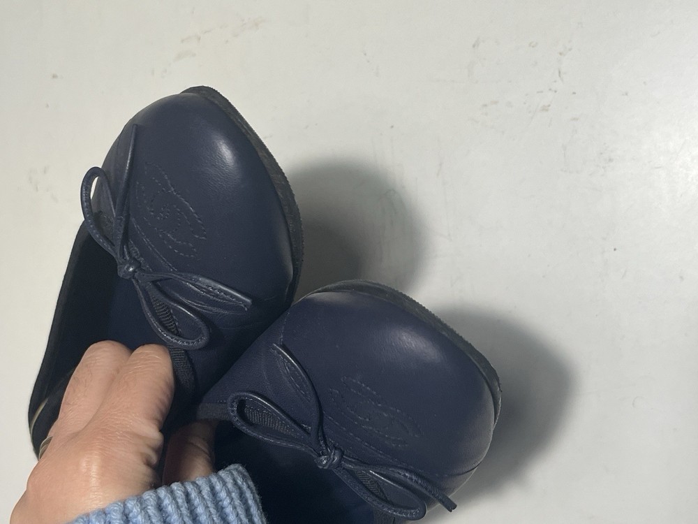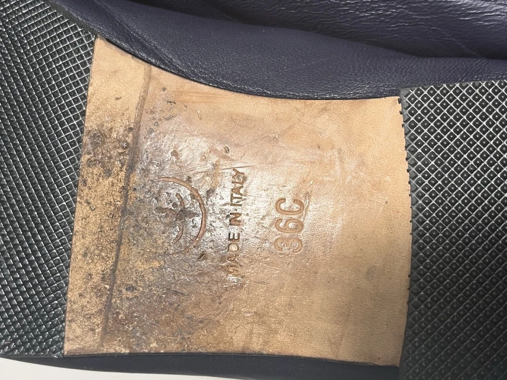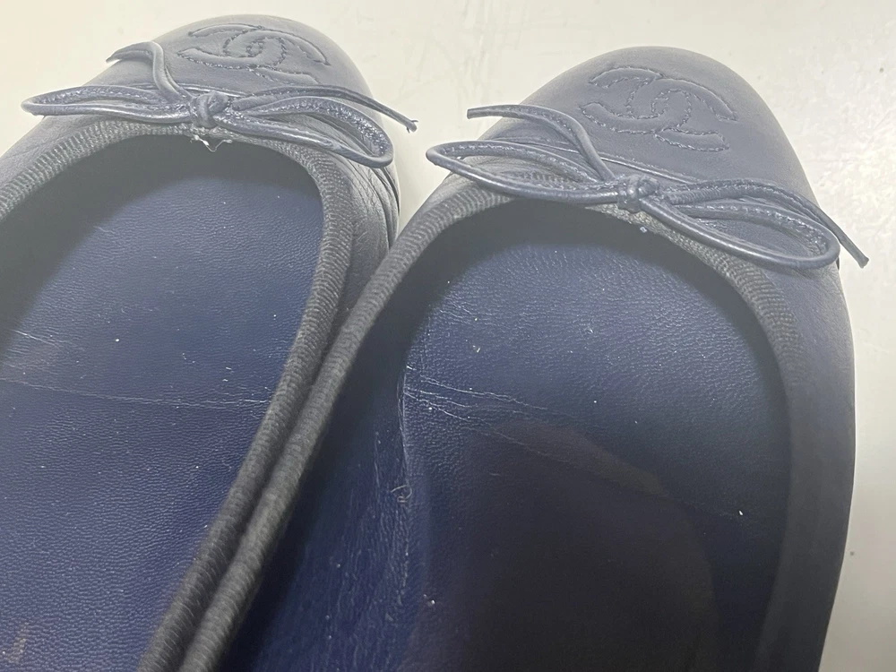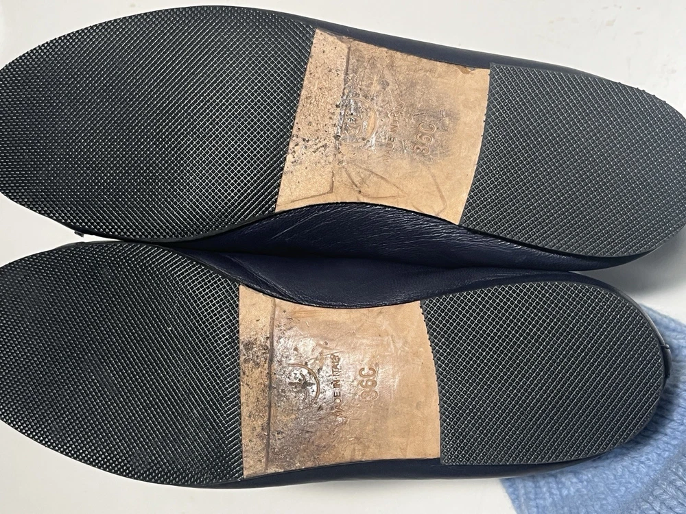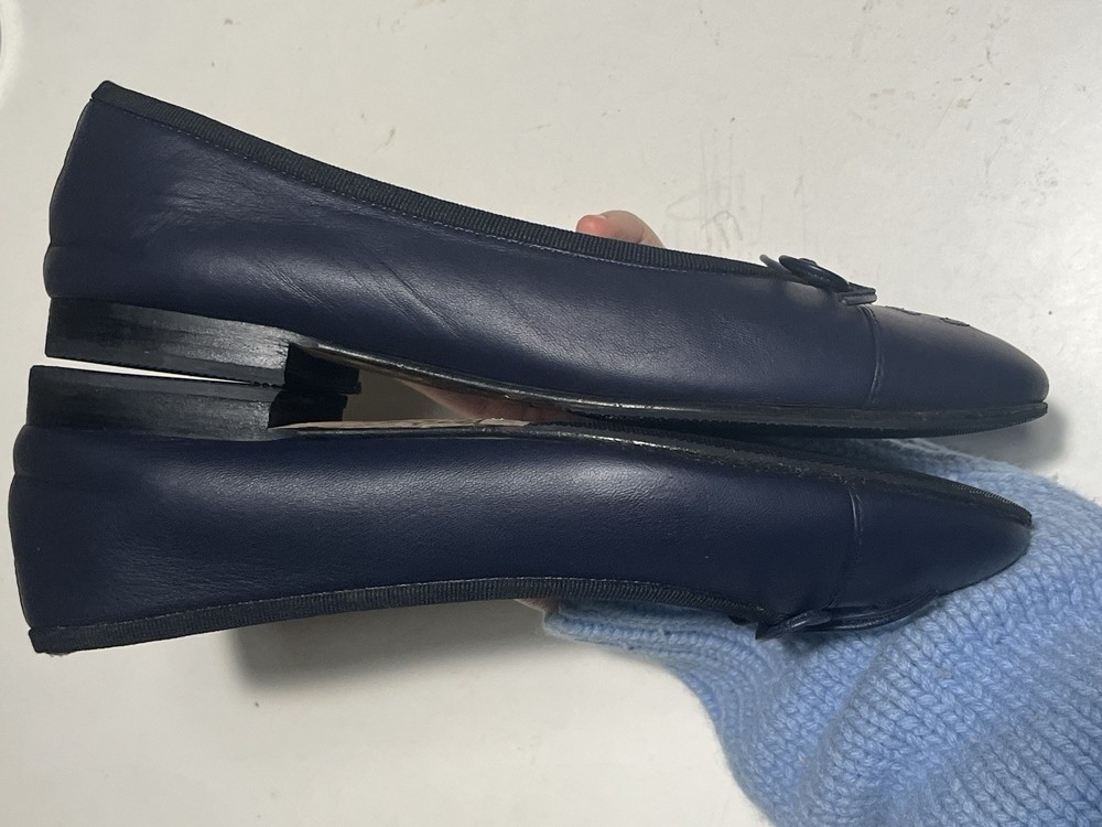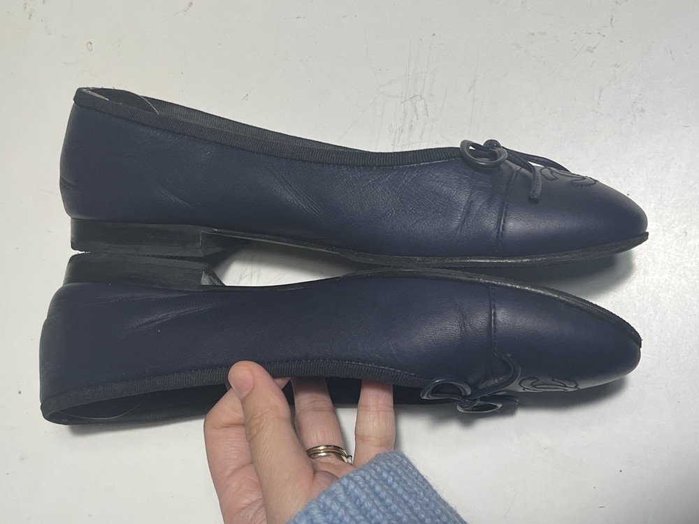 Good shape and soft lambskin by Chanel. Size 36. Originally owner put on a soft heel pad that you can take off. Authentic. Only shoes. Ship same or next day.