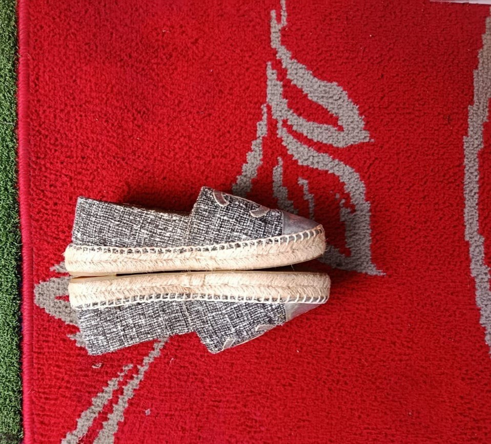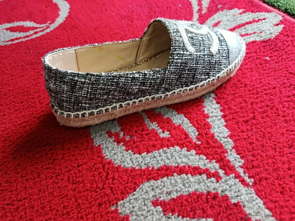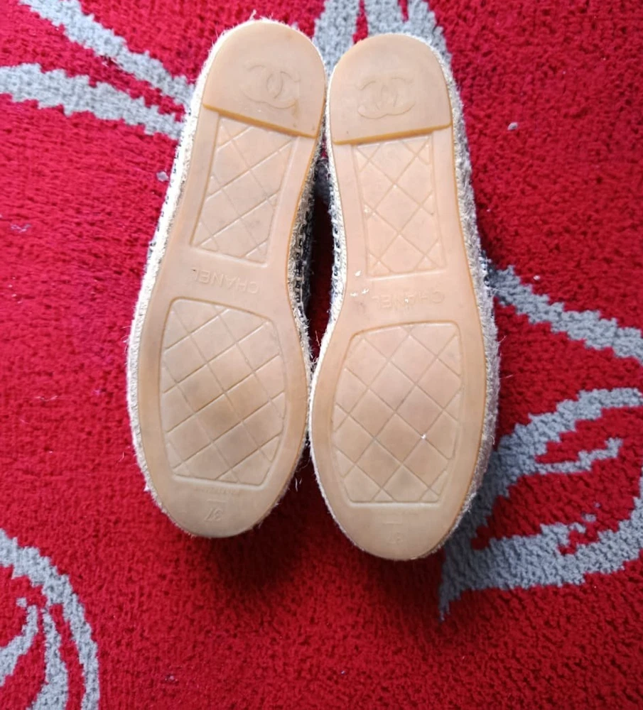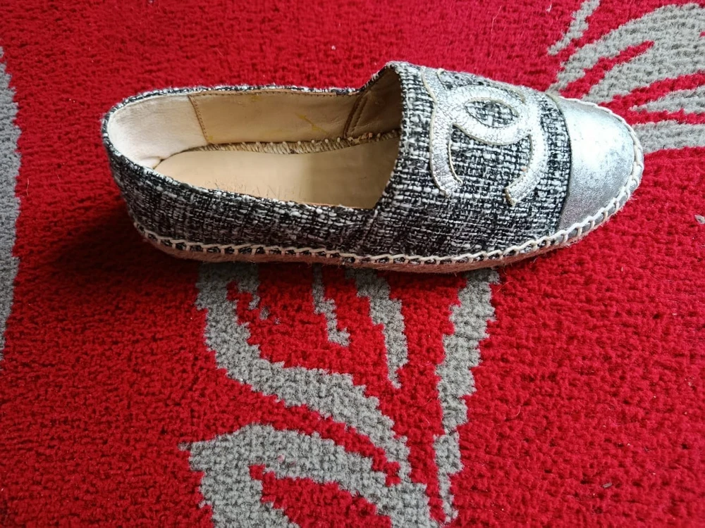 The Chanel Metallic Silver Espadrilles are a stylish and versatile choice for any woman's wardrobe. Made in Spain with authentic tweed fabric and a round toe shape, these slip-on flats feature the iconic Chanel logo accent. Perfect for a summer picnic, casual outing, or even a business meeting, these comfortable shoes are a timeless addition to any wardrobe. The shoe width is standard, and the outsole is made of rubber for added durability. Upgrade your shoe collection with these chic and iconic Chanel espadrilles.