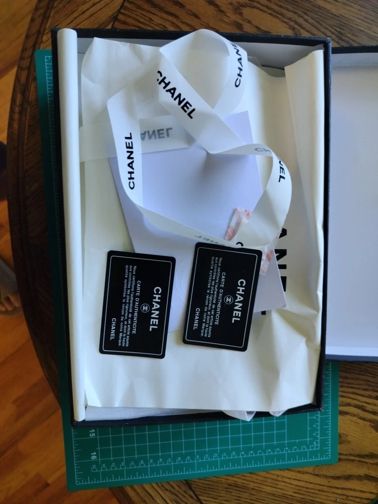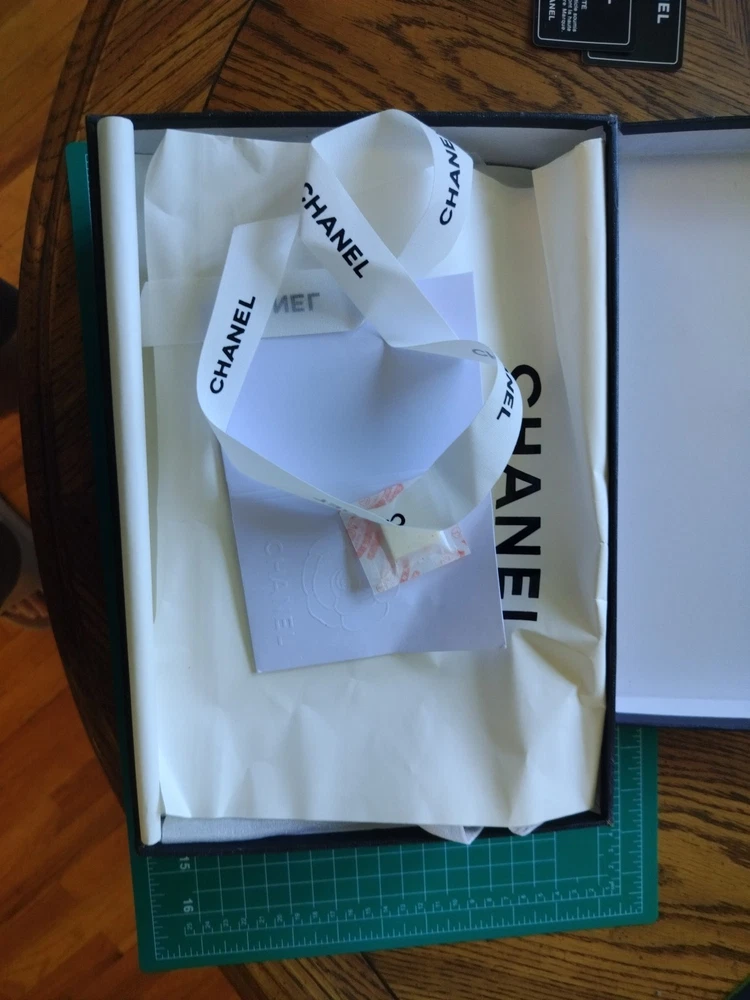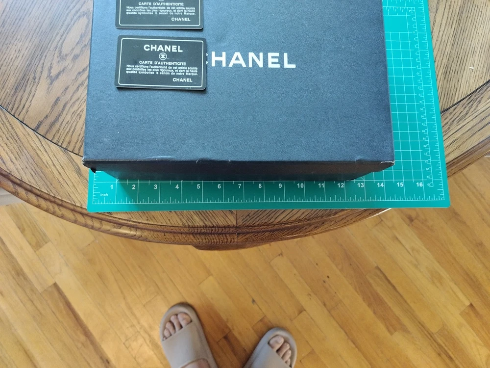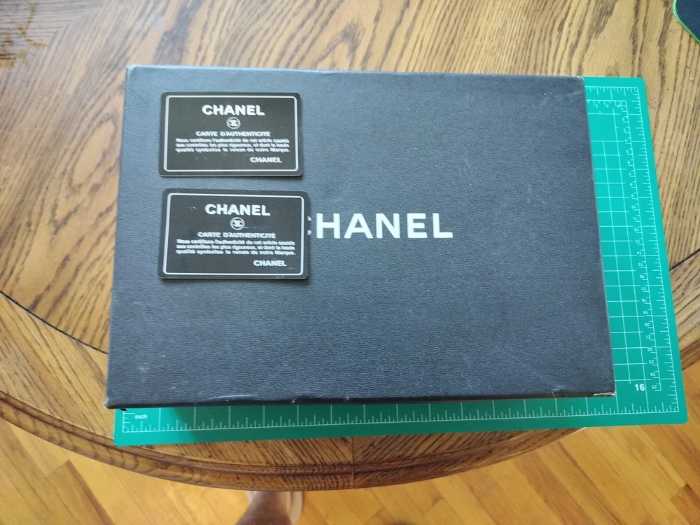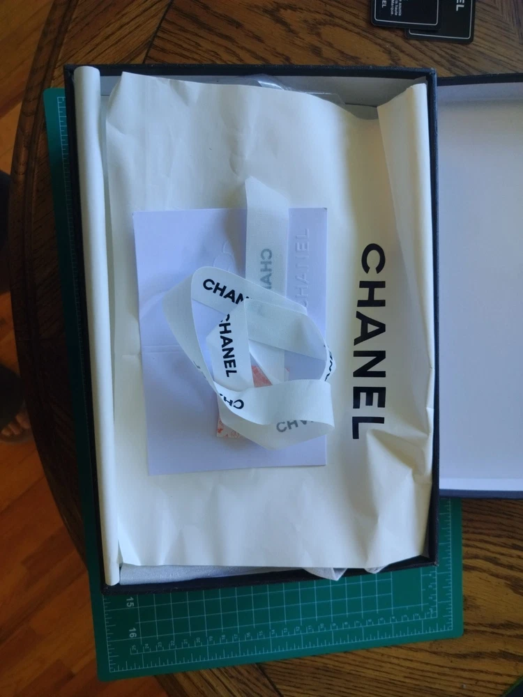 1. This Chanel shoe box is perfect for collectors or gifting—sleek black design, sturdy, and comes with tissue and care card. Used but in great condition, shipped fast and securely. A must-have for any Chanel lover!