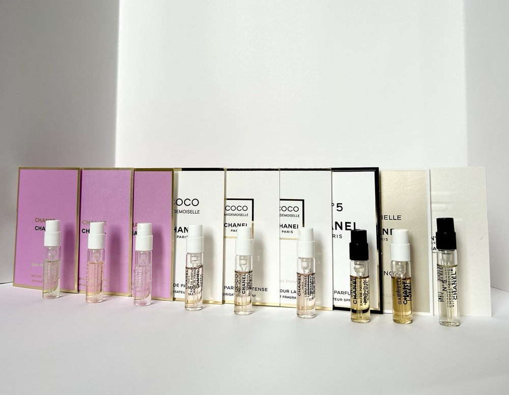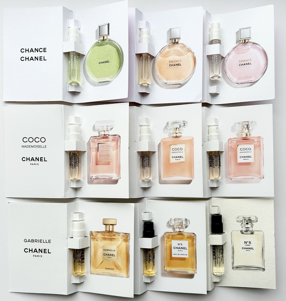 - Chanel Chance EDP 1ml - Chane Chance Eau Tendre EDP 1ml - Chanel Chance Eau Fraiche 1ml - Chanel Gabrielle Essence EDP 1ml - Chanel N•5 L’eau 1ml - Chanel N•5 EDP 1ml - Chanel Coco Mademoselle L’eau Prvée 1ml - Chanel Coco Mademoselle EDP 1ml - Chanel Coco Mademoiselle EDP Intense 1ml