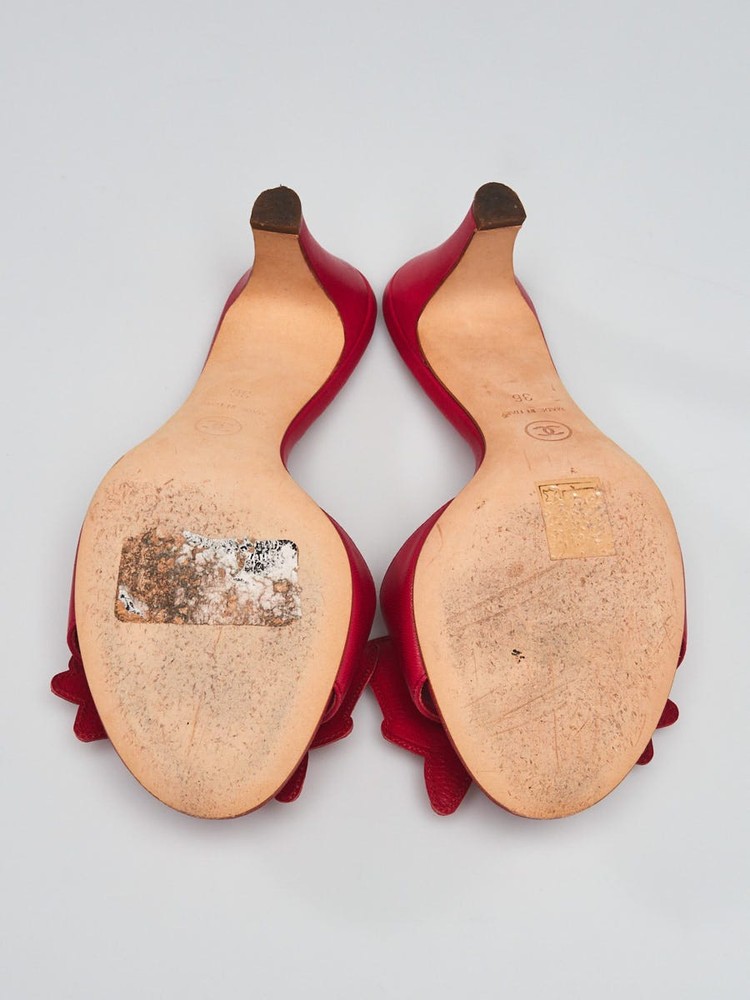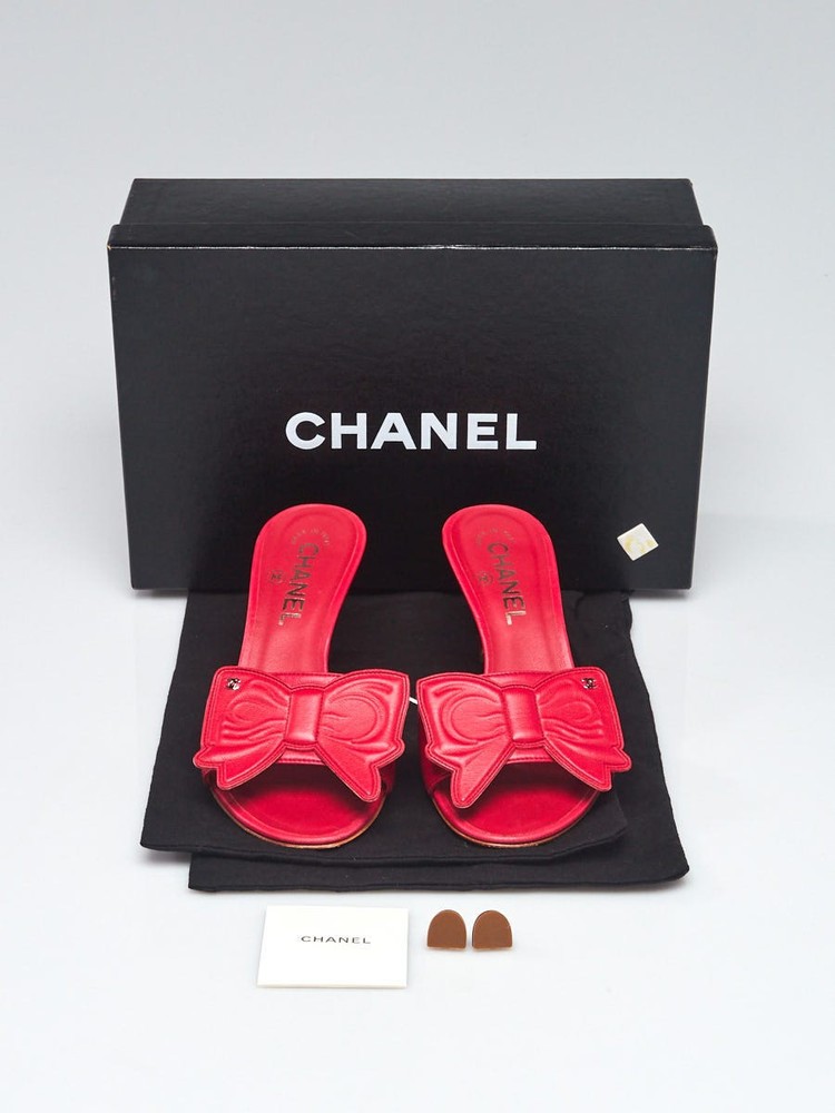 Chanel Pink Leather Open Toe CC Bow Heeled Sandals Size 5.5/36 Description These Chanel sandals are simply to die for! They feature chic pink leather uppers with a large bow at the vamp and CC details. The sandals have a manageable 2.5" heel. These sandals perfect for day or night. Be the envy of the night with these heels! Condition The leather uppers are clean with some rubbing at the heels and the toes. The soles have rubbing and some light scuffing. The boot beds remain clean with no wear. Details Overall Condition: Like new Exterior Condition: Interior Condition: Includes: Chanel box, two shoe bags, booklet, replacement heel caps Material: Pink leather Handles: Closure/Opening: Interior Lining: Interior Pockets: Hardware: Origin: Italy Production Year: Handle Drop: Measurements: Date/Authenticity Code: Guaranteed Authentic Only 100% authentic bags earn the tag! We guarantee the authenticity of every item we sell or 100% of your money back including original and return shipping costs. We're experts in distinguishing the "wanna-bes" from the "real deal." Whether it's a handbag or necklace, determining the authenticity of an item is a mix of art and science. Items such as stampings, symmetry, stitching, hardware, authenticity stamps, as well as overall workmanship and materials are inspected and determined to be consistent with the manufacturer's established standards of quality. If applicable, manufacturer date codes and serial numbers are verified for consistency. Lastly, the item is compared to on-hand authentic reference items. Payment We accept Paypal along with Visa, Mastercard, American Express, and Discover. We request full payment immediately upon purchase. Hassle-free Return Policy We guarantee the authenticity and condition of each item we sell. If you are not completely satisfied with your purchase, you may return it within 15 days of shipping date for a prompt refund. Hassle-free returns means that you don't have to contact us prior to returning an item. All we ask is that you do not remove the Authenticity Seal attached to your item and that you return the item in the condition you received it. We also ask that all original papers and box are returned. We cannot accept return items that do not meet this criteria. To return your order for a refund, please initiate the return within your eBay account. Within 2-3 business days upon receipt, you will be issued a refund for the original sales price and any taxes in the same form as the original payment method. Please note that this credit will not include any original shipping charges. Shipping Fees Our goal is to process your order quickly and ensure its safe delivery. We offer free shipping for all domestic orders and flat rate shipping fees for expedited and international orders regardless of how many items are in your order. Please note that we cannot ship to P.O. boxes. Shipping Method Fee per Order Standard (UPS Ground) FREE Expedited (UPS 2 Day) $15 APO/FPO, Alaska, and Hawaii (USPS Priority Insured) FREE Canada (USPS Priority Insured) $15 International (USPS Priority Insured) $15 International (USPS Express Insured) $25 About Us We know that shopping for new luxury goods at high-end retailers can be a luxurious and satisfying experience. We strive to deliver the same high quality experience and level of service for pre-owned goods. Never considered giving a pre-owned luxury item as a gift? Every order is presented and packaged to standards that match or exceed luxury retail stores and therefore make great gifts (especially if it's a gift for yourself!). For every order, take a look at what comes in the box: Professionally cleaned and rejuvenated luxury item with "Guaranteed Authentic by Yoogi's Closet" hang tag and seal. "Guaranteed Authentic by Yoogi's Closet" enclosure card. Care instructions and message from Yoogi. Invoice and return instructions. Original box, dustbag, and enclosed materials* * Note that select pre-owned merchandise will arrive with these items. Please refer to the product description page on the Yoogi's Closet website for details. Have Authentic Luxury Handbags or Jewelry to Sell? If you are having problems selling your authentic luxury handbag on eBay, we can help! We pay top dollar for quality, gently used luxury handbags. Learn more about our selling and consignment services.