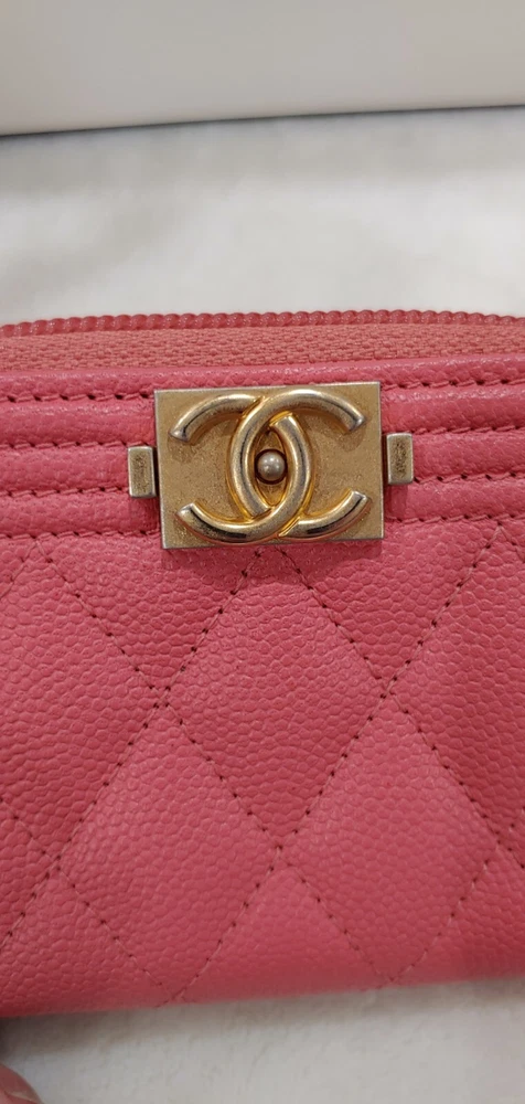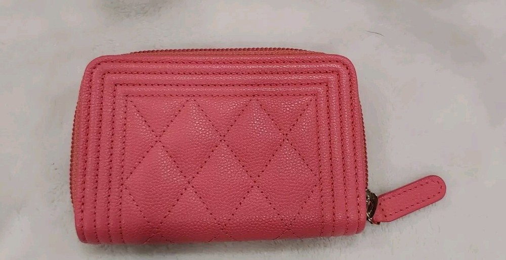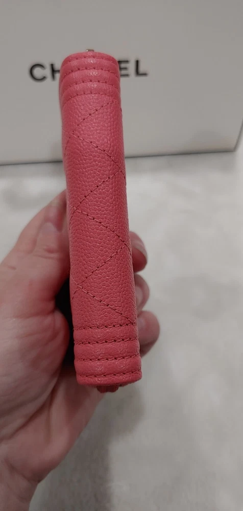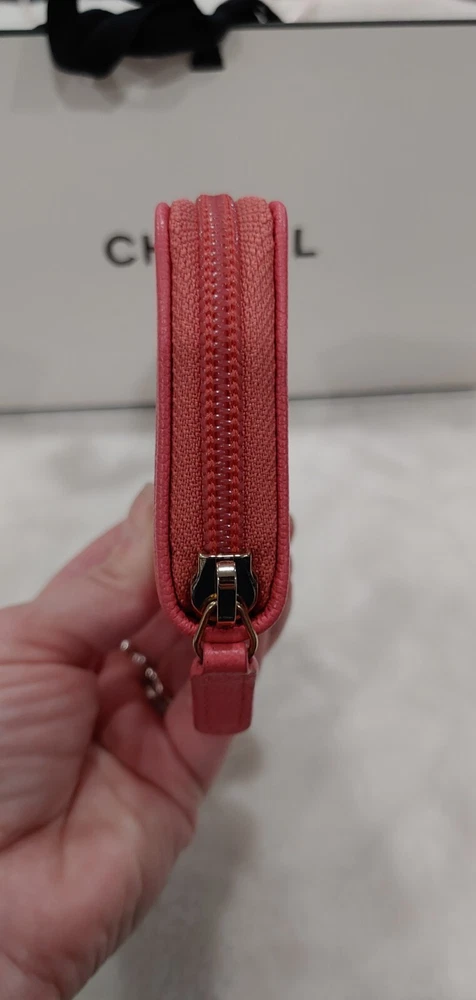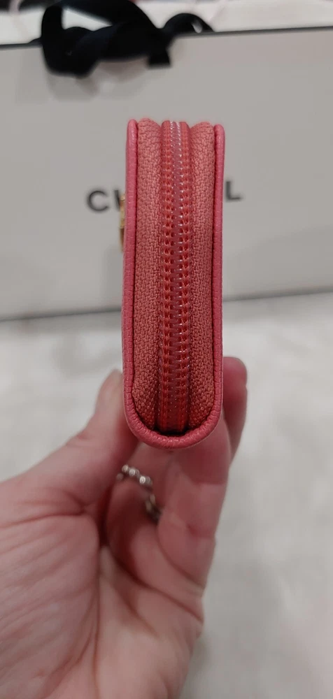 This wallet is absolutely stunning! The salmon caviar leather is so elegant and durable, perfect for daily use. It fits all my cards neatly, and the zip-around design keeps everything secure. The classic quilted pattern gives it that timeless Chanel luxury. Love how compact yet spacious it is—definitely worth the investment!