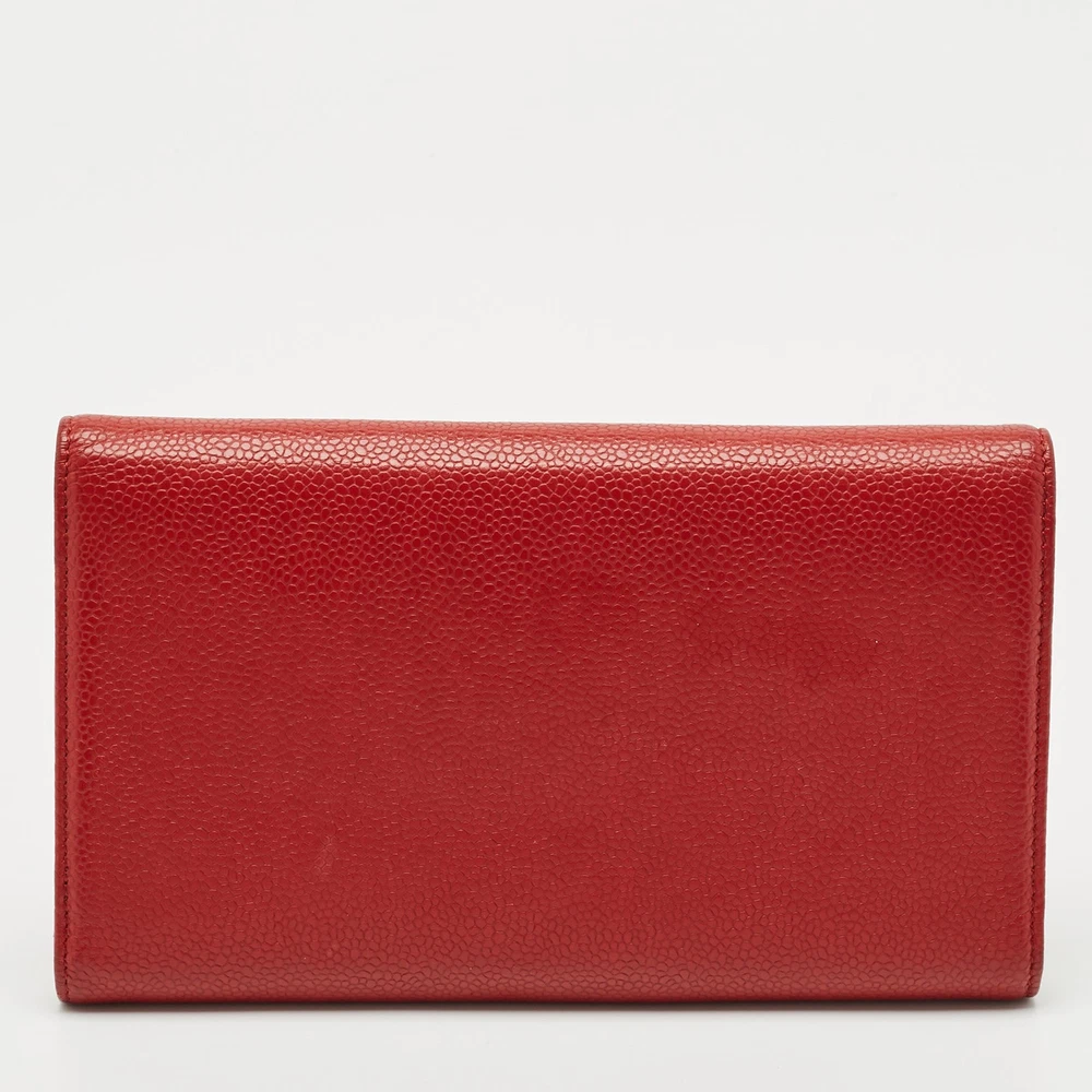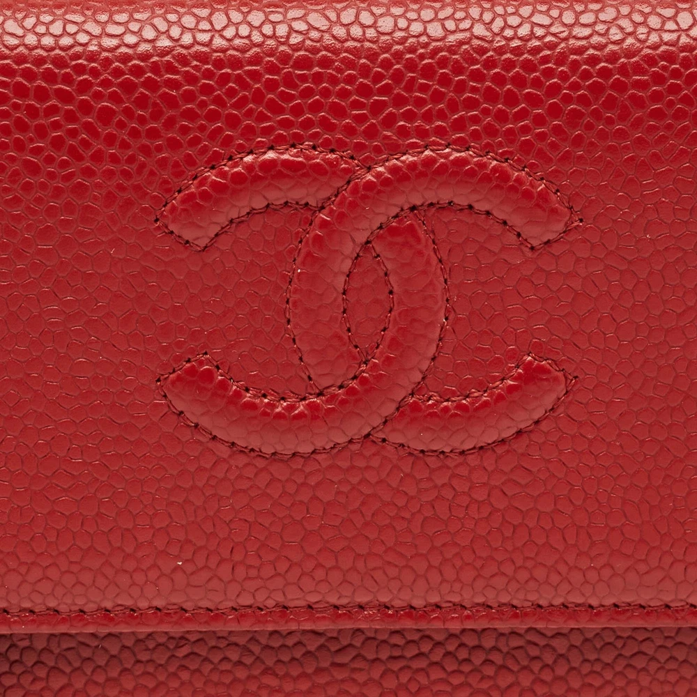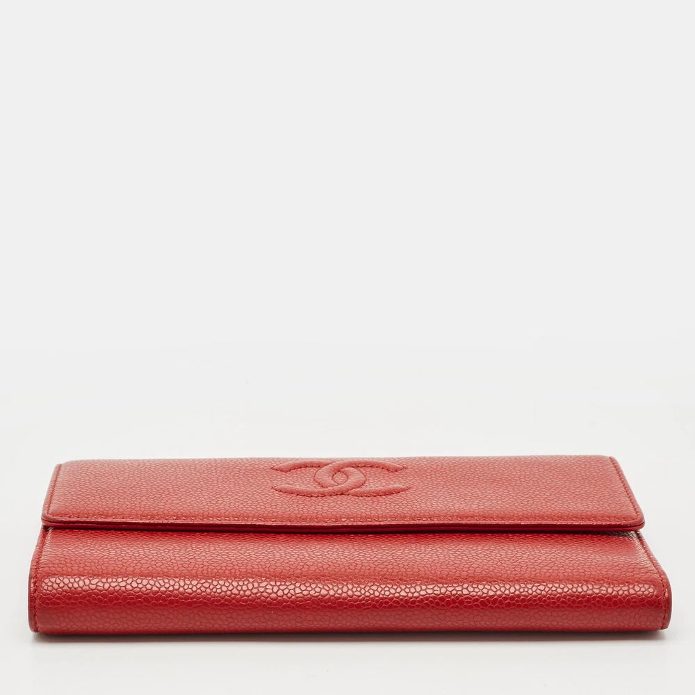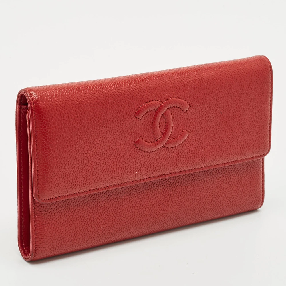 Classic elegance meets enduring craftsmanship in this Chanel Timeless flap wallet, crafted from luxurious red caviar leather. The grained texture offers durability and structure, while the signature CC logo adds a refined touch. Inside, multiple card slots, bill compartments, and a zippered coin pocket provide practical organization wrapped in unmistakable Chanel sophistication.Certified by The Luxury Closet - This item has gone through a detailed authentication process overseen by our experts. We offer a lifetime guarantee of authenticity on all our items. Import duties, taxes and charges are not included in the item price. These charges are the buyers responsibility. Please check with your country’s customs office to determine what these additional cost will be prior to buying. Our eBay Store About Us Contact Us Add to Favorite Sellers Chanel Red Caviar Leather CC Timeless Flap Wallet $888.8 Classic elegance meets enduring craftsmanship in this Chanel Timeless flap wallet, crafted from luxurious red caviar leather. The grained texture offers durability and structure, while the signature CC logo adds a refined touch. Inside, multiple card slots, bill compartments, and a zippered coin pocket provide practical organization wrapped in unmistakable Chanel sophistication. Product Details Brand Color Red Dimensions Material Leather Size Outsole Width Outsole Length Heel Height Includes Certified by The Luxury Closet This item has gone through a detailed authentication process overseen by our experts. We offer a lifetime guarantee of authenticity on all our items. How We Check The in-house team of experts at The Luxury Closet is highly trained to verify the authenticity and the condition of the luxury products. They ensure that only 100% authentic items are put on sale.The evaluation process is unique with its own mix of assessment criteria and differs according to the category. Each item is evaluated based on the following combination of hallmarks, hardware, stitching, symmetry, material, craftsmanship, stamping, codes, hologram stickers, and packaging. Our authenticators also check if the items have been modified or amended (e.g., aftermarket diamonds, replaced batteries, repaired bags, etc.) International Buyers Import duties, taxes and charges are not included in the item price. These charges are the buyers responsibility. Please check with your country’s customs office to determine what these additional cost will be prior to buying.