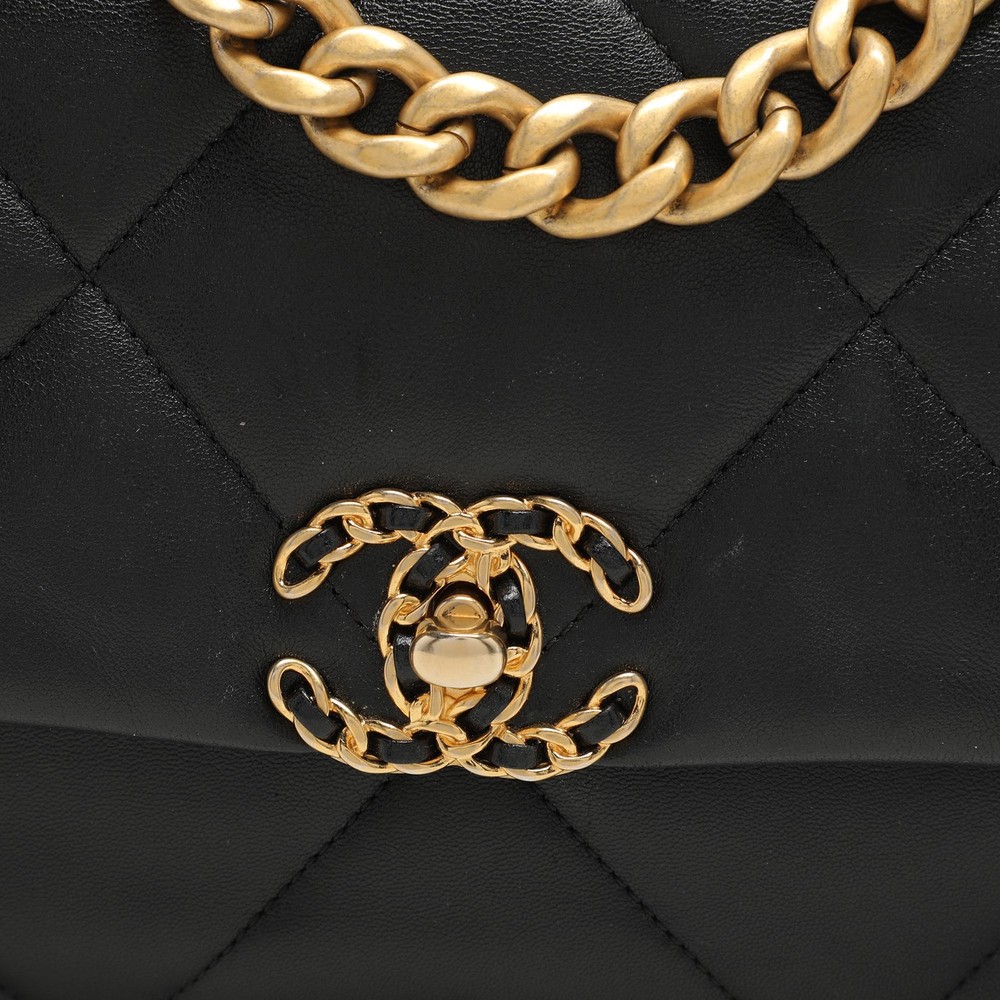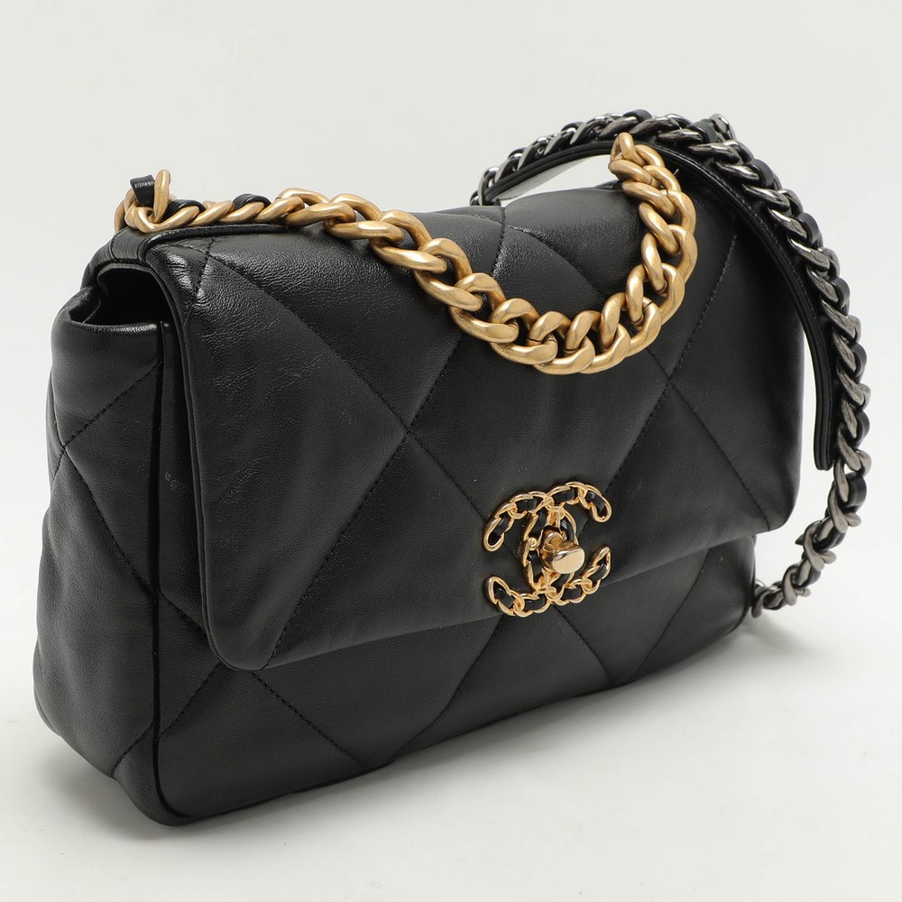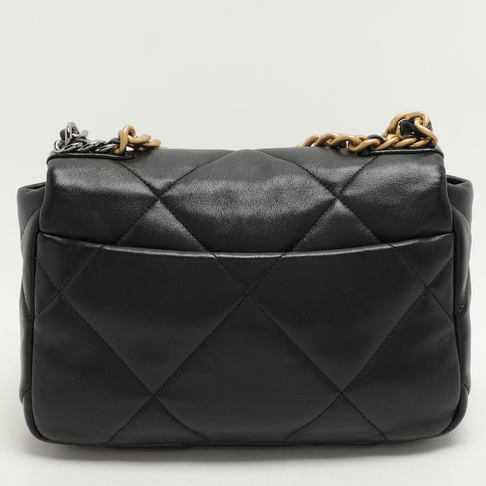 First unveiled in the Chanel Fall 2019 collection, the Chanel 19 bag is named after the year of its release, just like the Chanel 2.55. In design, the bag has exaggerated quilting and hardware in two tones. This version in black is made from leather and lined with fabric. It has a CC twist lock, a small chain handle to be carried by hand, and a longer chain for shoulder/crossbody wear.Certified by The Luxury Closet - This item has gone through a detailed authentication process overseen by our experts. We offer a lifetime guarantee of authenticity on all our items. Import duties, taxes and charges are not included in the item price. These charges are the buyers responsibility. Please check with your country’s customs office to determine what these additional cost will be prior to buying. Our eBay Store About Us Contact Us Add to Favorite Sellers Chanel Black Quilted Leather Small 19 Flap Bag $4992.9 First unveiled in the Chanel Fall 2019 collection, the Chanel 19 bag is named after the year of its release, just like the Chanel 2.55. In design, the bag has exaggerated quilting and hardware in two tones. This version in black is made from leather and lined with fabric. It has a CC twist lock, a small chain handle to be carried by hand, and a longer chain for shoulder/crossbody wear. Product Details Brand Color Black Dimensions Height: 18 cm, Width: 7 cm, Length: 25 cm Material Leather Size Small Outsole Width Outsole Length Heel Height Includes Original Dustbag, Original Box, Info Booklet Certified by The Luxury Closet This item has gone through a detailed authentication process overseen by our experts. We offer a lifetime guarantee of authenticity on all our items. How We Check The in-house team of experts at The Luxury Closet is highly trained to verify the authenticity and the condition of the luxury products. They ensure that only 100% authentic items are put on sale.The evaluation process is unique with its own mix of assessment criteria and differs according to the category. Each item is evaluated based on the following combination of hallmarks, hardware, stitching, symmetry, material, craftsmanship, stamping, codes, hologram stickers, and packaging. Our authenticators also check if the items have been modified or amended (e.g., aftermarket diamonds, replaced batteries, repaired bags, etc.) International Buyers Import duties, taxes and charges are not included in the item price. These charges are the buyers responsibility. Please check with your country’s customs office to determine what these additional cost will be prior to buying.