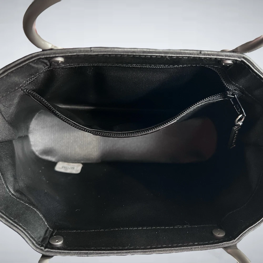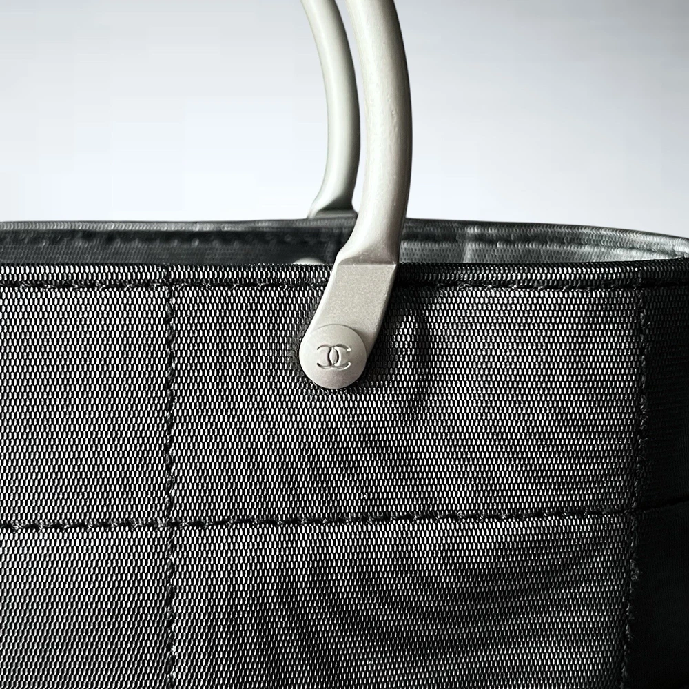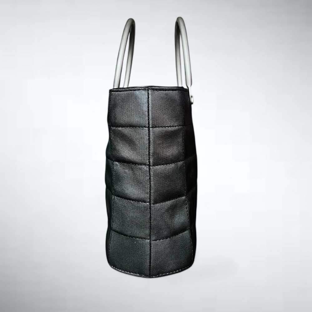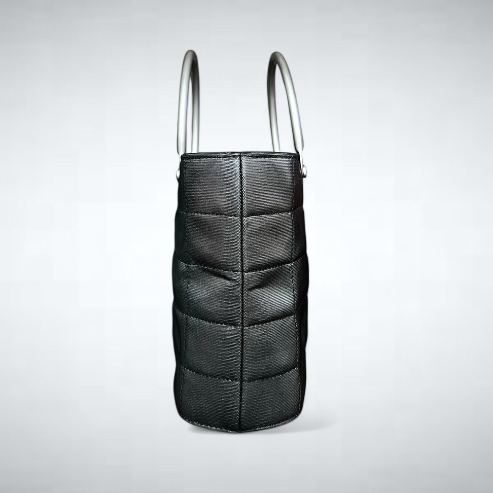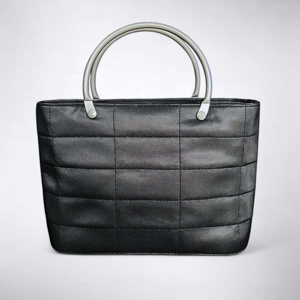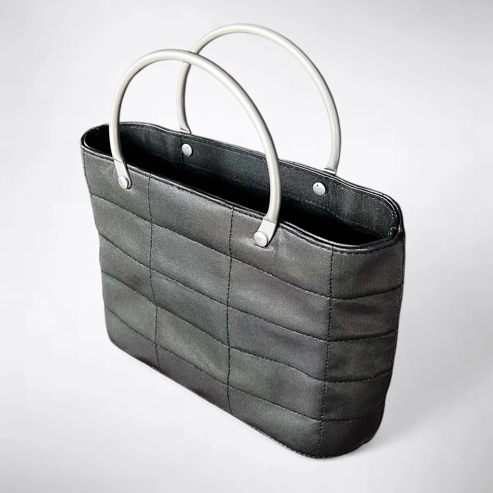 Chanel vintage micro square quilted tote handbag. From the 1997-1999 collection by Karl Lagerfeld. Features black quilted nylon exterior and silver-tone hardware. Nylon grosgrain lining and single interior pocket. This bag is in pristine condition, no signs of use. Includes COA. 7.25”L x 5.25”H x 2.75”D Handle drop: 2.5” Serial #: 5471259