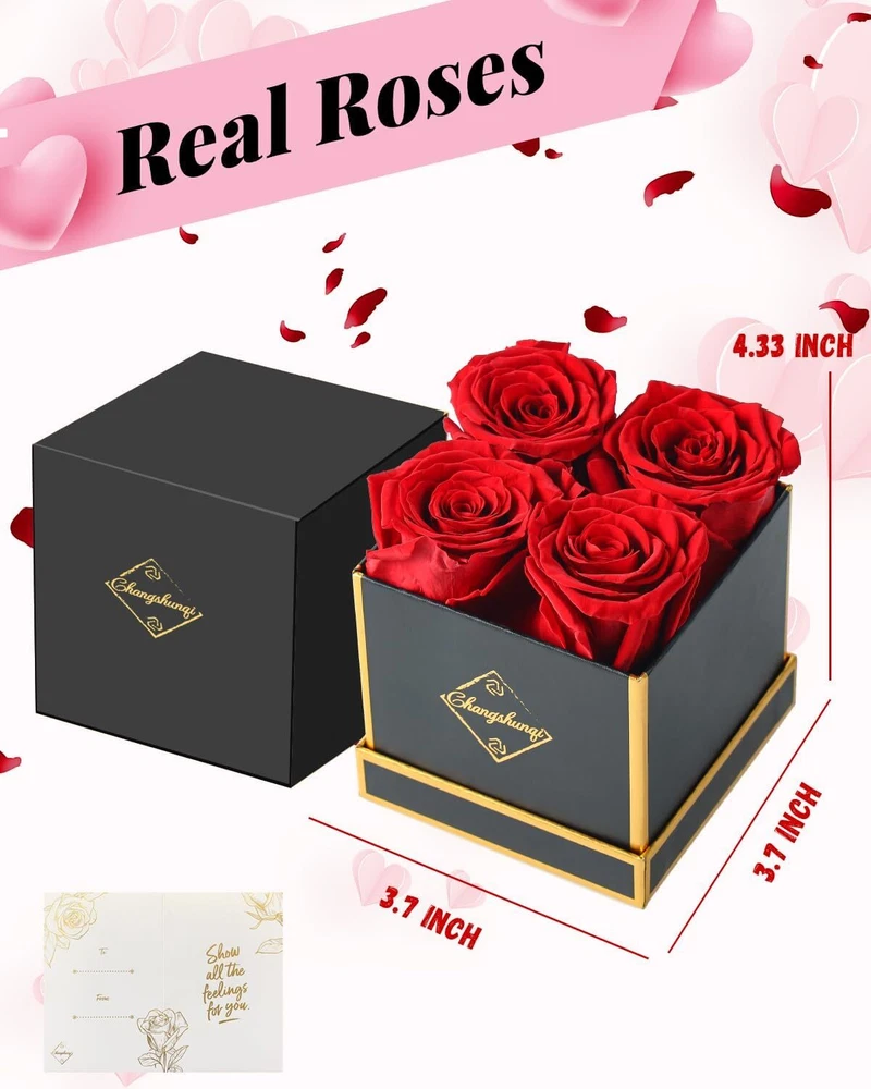 Changshunqi Forever Flowers, Fresh Preserved Roses in a Box, Eternal Rose Red Product Details Package Dimensions: 4.96 x 4.69 x 4.02 inches Item Weight: 8.4 ounces Manufacturer: Changshunqi Item model number: RS4 Brand: Changshunqi Plant or Animal Product Type: Red Rose Color: Rose Red Number of Items: 4 Occasion: Mother's Day, Christmas, Wedding, Graduation, Anniversary, Birthday, Valentine's Day Forever Roses Made of Real Flowers: Our preserved roses in a box are all real roses, only the great roses with robust and healthy will be carefully selected from every 100 Grade A roses. And made into preserved flowers after specially treated,long-lasting. Long Lasting Roses: Different from roses fresh flowers, eternal rose flower do not wilt or fade over time and that can last 2-3 year, no maintenance, no sunlight and water, easy care for years of enjoyment. Love and delicate roses are something every woman deserves Delicate Hand-made Forever Flowers: each natural, non-toxic, non-scented rose is hand-ordered into its elegant yet sturdy black gift box with silky ribbon giving her luxury and an understated feeling. No watering, no need for sunlight, easy care for years of enjoyment Everlasting Roses for Forever Love: Imagine the joy and surprise on her face when receives our forever roses bouquet. Forever roses in a box is sure to make her feel loved and appreciated. Surprise her with a gift that speaks to the heart. Not only preserved rose flower, but also a symbol of enduring love and beauty. I Love You Gifts for Her: Delivery flores eternas, ensure your gift is as fresh and vibrant as her special day is made even more memorable. Click now and make it a great Birthday gift, Mother's day gifts, Valentine's Day, Christmas and anniversary gifts for women wife