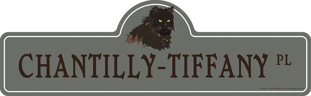 Get a fun Chantilly-Tiffany Street sign for your home or office and show off your love for your favorite breed. Looking for a fun, cute street sign to hang on your cubicle or in your man cave ? If so, Sign Mission has all the cute, funny, hilarious, and even work-related signs you re looking for! Something for Everyone We ve got a wide range of American-made signs just like this Chantilly-Tiffany sign that will remind you of your best friend, make others smile, or Just let everyone around know you are a real cat lover. Colorful and Durable Sign Mission street signs are crafted with specialty inks that perfectly highlight its colors and image are printed directly onto outdoor-durable plastic making this sign very scratch resistant. And because they re safe for indoor and outdoor use, you can stick on your patio, in the living room, or anywhere else you want to get people smiling and talking about how much they love cats. Product Details: Stoner Street Sign Pre-Cut Mounting Holes Indoor and Outdoor Use Rust and Fade Resistant -Sided Patented Scratch Resistant Ink Dimension: 7 x 20 Made in the USA Outdoor Durable Plastic Click Add to Cart to get your Chantilly-Tiffany sign today and smile each time you pass by! SIZE - 7" X 20" – Good for decorating a work space or hanging in a den, this Cat street sign also makes a great gift. Crisp, Clear Image – This sign features a high-definition image and a matte finish that pops with color and fun imagination. Quick & Easy Mount – Comes with pre-cut mounting holes for hanging