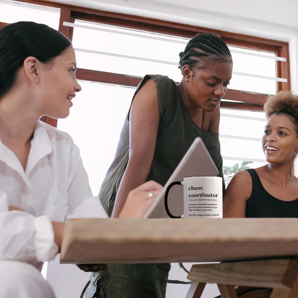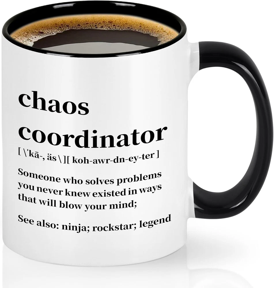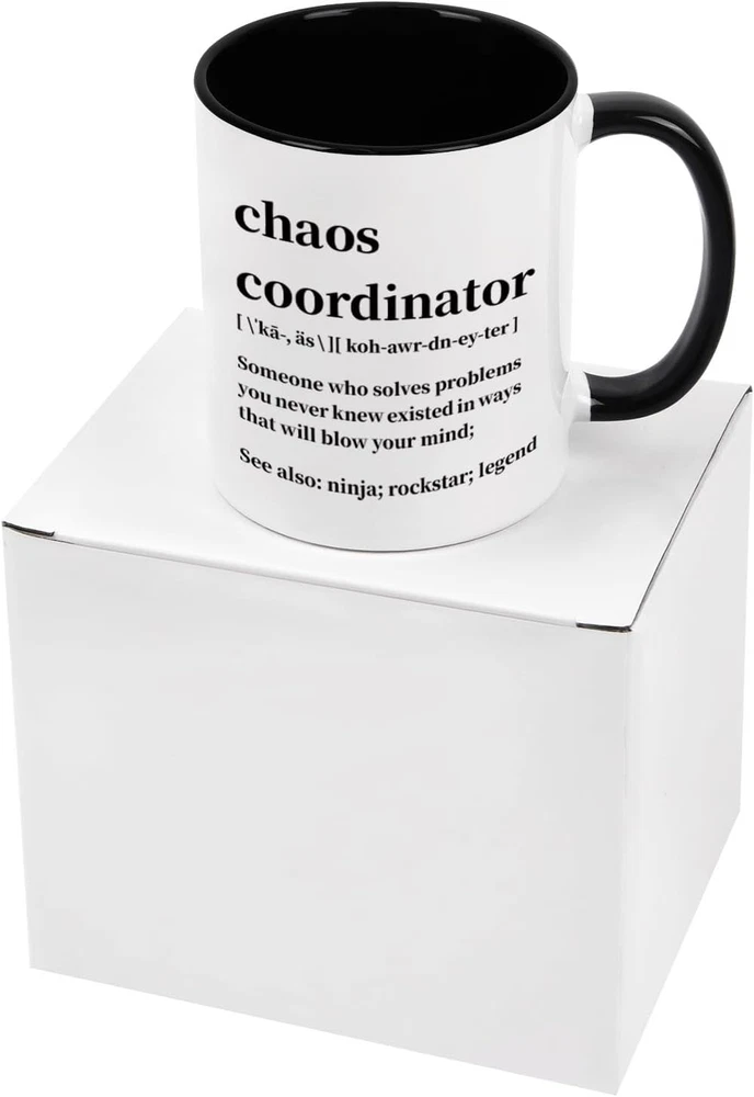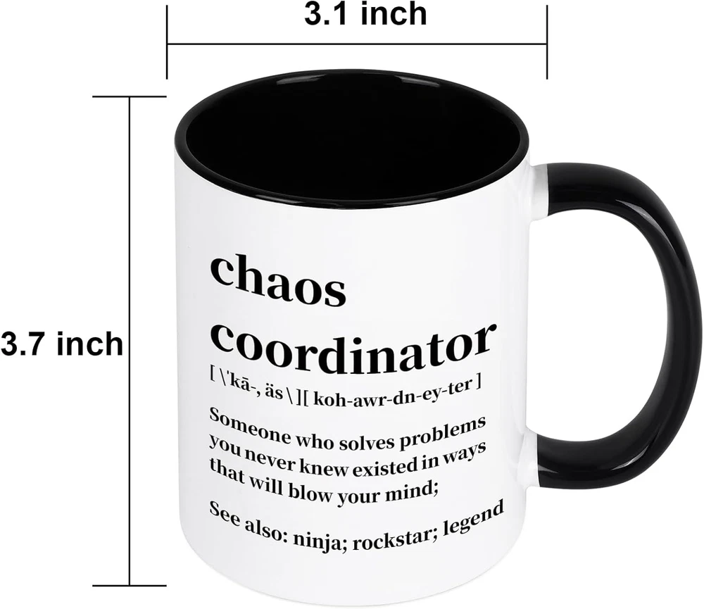 BEST GIFT IDEAS: This chaos coordinator coffee mug could be a great gift idea for fathers day, teacher appreciation, boss day, employee appreciation, Christmas, mothers day, and birthday. You can send it to your dad, teacher, boss, collages mom or friend who is an actual chaos coordinator. PRINTED ON BOTH SIDES: "Chaos Coordinator someone who solves problem" is printed on both side of the mug. The wall of this chaos coordinator mug is white outside and black inside. The combination of color and the layout of printing are concordant and aesthetically pleasing. MATERIAL & CRAFTSMANSHIP: These chaos coordinator gifts are 100% hand-made by skilful workers using high quality ceramics. After the shape are formed, these mugs would be fired at extremely high temperature. Supreme material and excellent craftsmanship make these chaos mugs sturdy and durable. DISHWASHER AND MICROWAVE SAFE: Due to the high quality material and state-of-the-art craftsmanship, these office gifts for coworkers are totally safe for microwave and dishwasher, making it a lot more convenient to heat up coffee or clean the cup. PLEASANT USEING EXPERIENCE: These gifts for boss hold up to 11oz, a reasonable capacity for any drinks including coffee, tea or milk. The C-shape handle makes these boss mugs comfortable to hold and can prevent from being scalded when holding hot drinks. The weight is just right—not too heavy or too light. Product Description Cabtnca Chaos Coordinator Gifts We have chaos coordinator mug in white, black & white, pink & white. You can choose the whichever color you like or the color that suits your gift receiver. Our chaos coordinator mugs could be gifts for boss, gifts for cowokers, white elephant gifts, office gifts for men and women and administrative professional day gifts. Our chaos coordinator mugs could be funny gifts for teachers, daycare teacher appreciation gifts, preschool teacher gifts or kindergarten teacher gifts. Our chaos coordinator mugs could be funny coffee mugs for mom and dad, you can send on Mothers Day, Fathers Day, birthday or Christmas. Chaos Coordinator Gifts for Men and Women