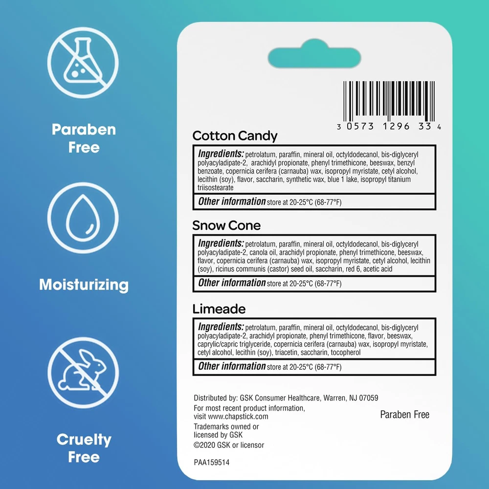 Fast Shipping Great Customer Support Satisfaction Guaranteed DESCRIPTION Shipping Shipping Shipping All domestic packages are shipped for Free (Unless other shipping method was selected during the checkout) Most items ship and arrive much sooner than the estimate delivery date. Usually within 2-3 days from payment. However, we have longer estimates to compensate for the occasional delay or supply chain breakdown. We do not accept P.O. BOXES - PLEASE PROVIDE A PHYSICAL ADDRESS Return Return Return In the event that you would like to return your purchase, we allow returns that are processed within the defined return date (the return date is to be found in the return policy/shipping and handling section) Please contact us for a return authorization and the return shipping address. Payment Payment Payment PayPal is our preferred method of payments it's the quickest, easiest and most secure way to pay for your goods or services online. PayPal offers buyer and seller protection should there be a problem. If you do not have a PayPal account, to get started and buy your first item with us is very easy. Simply click on the 'Buy It Now' button and follow the eBay checkout steps. Select PayPal as the payment method you then will be given the chance to enter your card details in to PayPal's secure checkout in order to pay for your order. Once the payment has been made, you will then be given the opportunity to make your own PayPal account to make paying for your items in the future very easy. Should there be a problem with payment please do let us know. Feedback Feedback Feedback Customer satisfaction is very important to us. If you have any problem with your order,please contact us and we will do our best to make you satisfied, please do not leave a negative feedback before we resolve your problem. We guarantee that your issue will be solved quickly. As long as you are happy with your purchase of , please leave us a positive feedback. Your feedback is very important to us it affects our search placement on eBay. We will leave a positive feedback for you in return automatically once we receive your feedback. Contact Us Contact Us Contact Us If you have any queries, please contact us via ebay. We usually respond within 24 hours on weekdays. Thank you for visiting our ebay store! CHAPSTICK FAN FAVORITE: This collection of moisturizing lip balms includes flavors that make every day more fun: Snow Cone, Limeade, and Cotton Candy. AMERICA’S FAVORITE LIP BALMS: You can’t go wrong with an all-American classic you know and love. Enjoy soft, moisturized lips wherever life takes you with ChapStick. HEALS CHAPPED LIPS: Our time-tested, paraben-free, and cruelty-free lip balms glide on dry, cracked lips without feeling sticky or greasy. HOW TO USE: Apply ChapStick daily to help keep dry lips silky smooth. They are perfect on their own or as a base under lip color. TRUST CHAPSTICK: From America's lip care experts, trusted for over 130 years, our classic formulations won't disappoint. ChapStick Vacation Getaway 3-Pack Lip Balm Set � Snow Cone Limeade Cotton Candy Click here to see description Fast Shipping Great Customer Support Satisfaction Guaranteed DESCRIPTION Shipping All domestic packages are shipped for Free (Unless other shipping method was selected during the checkout) We ship within two business days of payment, usually sooner Standard FREE shipping takes between 3-5 business days Expedited shipping takes between 2-3 business days Overnight shipping takes between 1-2 business days We do not accept P.O. BOXES - PLEASE PROVIDE A PHYSICAL ADDRESS We Ship Globally using ebay's GSP, the item is sent to a logistic center in KY and shipped from there to the rest of the world. International customers are responsible for all duties and taxes Contact your local authority for questions related to the amount of duties or taxes you will be responsible for Return In the event that you would like to return your purchase, we allow returns that are processed within the defined return date (the return date is to be found in the return policy/shipping and handling section) Please contact us for a return authorization and the return shipping address. Please contact us for a Return Merchandise Authorization (RMA) number. We advise you to use a reputable carrier service when returning your goods. Please pack all returns appropriately. We ship globally Via eBay's global shipping program (GSP). Thus we don't cover returns for items shipped globally. Buyers returning such items will be refunded ONLY for the item's cost and not for the shipping. please check the Voltage information and make sure it matches the one in your country. In case it's not stated in the description, do ask us. Payment PayPal is our preferred method of payments it's the quickest, easiest and most secure way to pay for your goods or services online. PayPal offers buyer and seller protection should there be a problem. If you do not have a PayPal account, to get started and buy your first item with us is very easy. Simply click on the 'Buy It Now' button and follow the eBay checkout steps. Select PayPal as the payment method you then will be given the chance to enter your card details in to PayPal's secure checkout in order to pay for your order. Once the payment has been made, you will then be given the opportunity to make your own PayPal account to make paying for your items in the future very easy. Should there be a problem with payment please do let us know. Feedback Customer satisfaction is very important to us. If you have any problem with your order,please contact us and we will do our best to make you satisfied, please do not leave a negative feedback before we resolve your problem. We guarantee that your issue will be solved quickly. As long as you are happy with your purchase of , please leave us a positive feedback. Your feedback is very important to us it affects our search placement on eBay. We will leave a positive feedback for you in ret