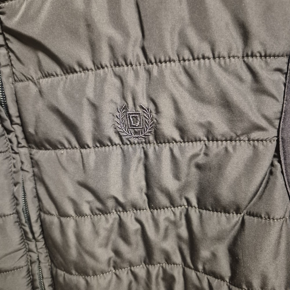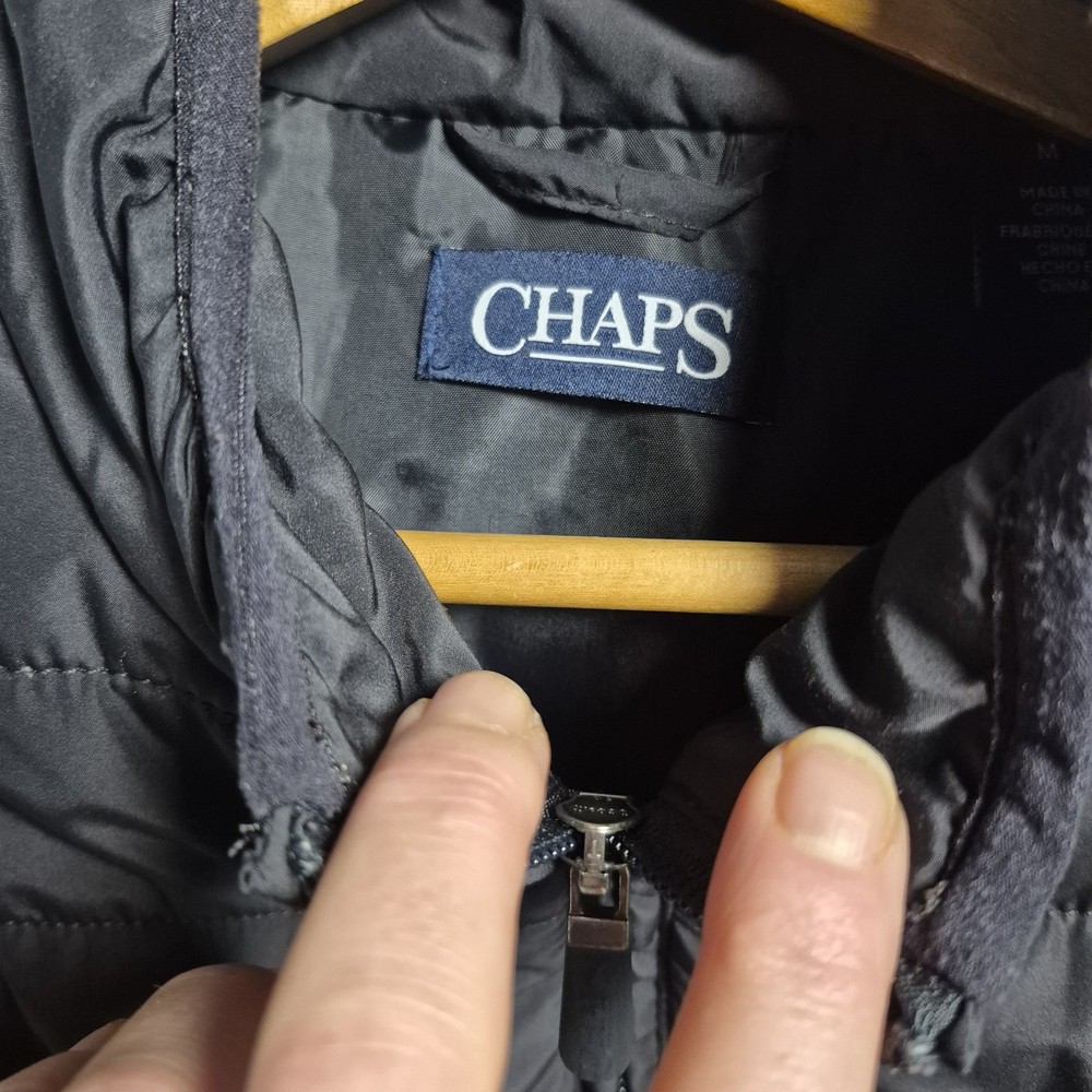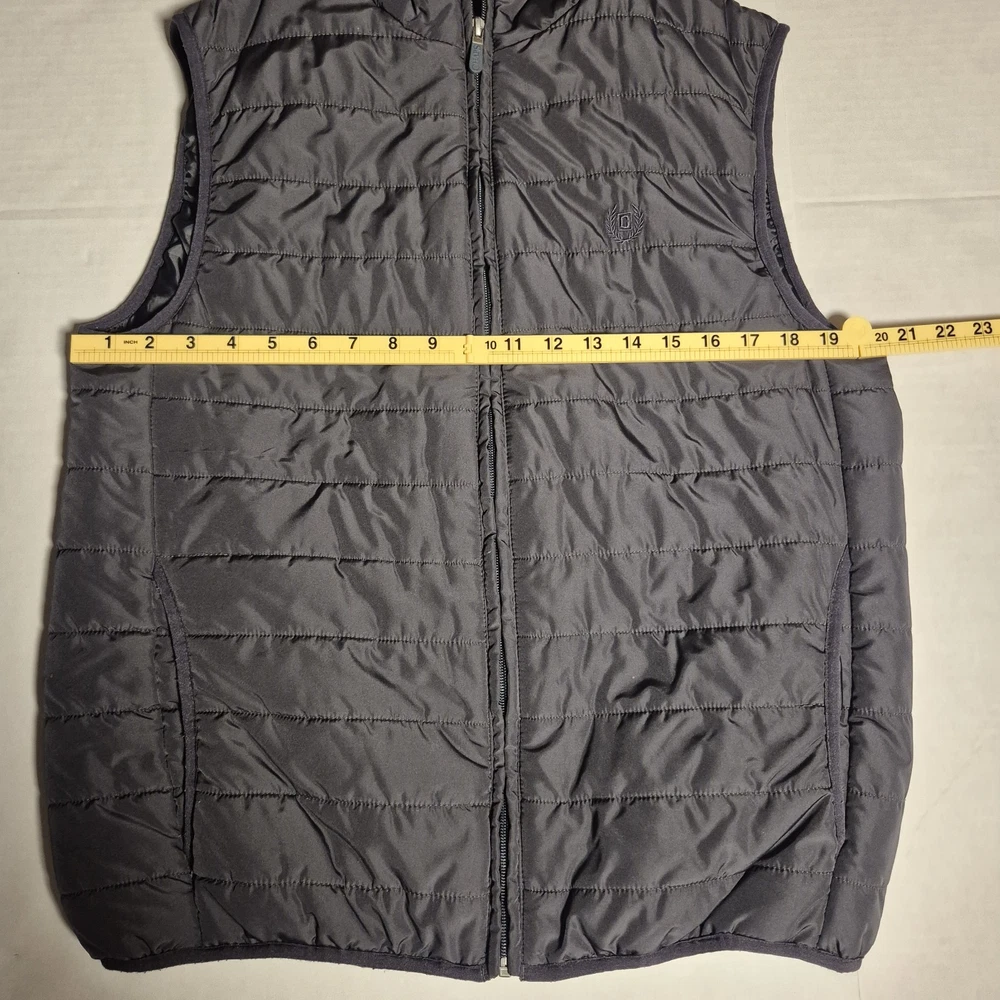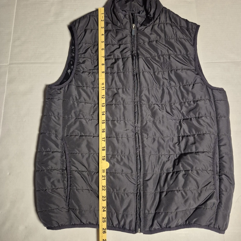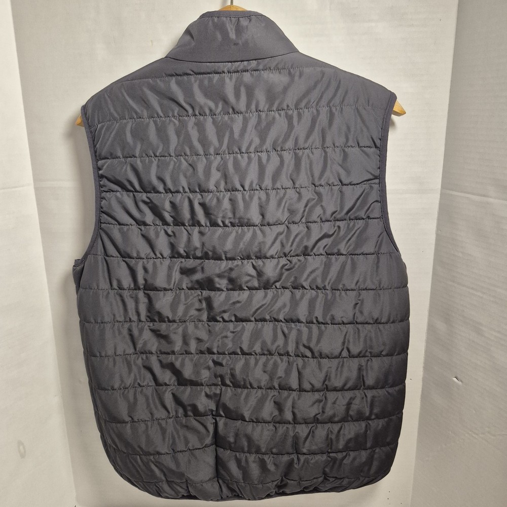 Men’s Chaps quilted puffer vest in a versatile dark gray color. Lightweight but insulated, perfect for layering over sweaters or hoodies. Features a full zip front, stand collar, and zip hand pockets with a subtle embroidered logo on the chest. Pre-owned and in good condition with normal light wear. No holes, stains, or damage noted. See photos for details and measurements.