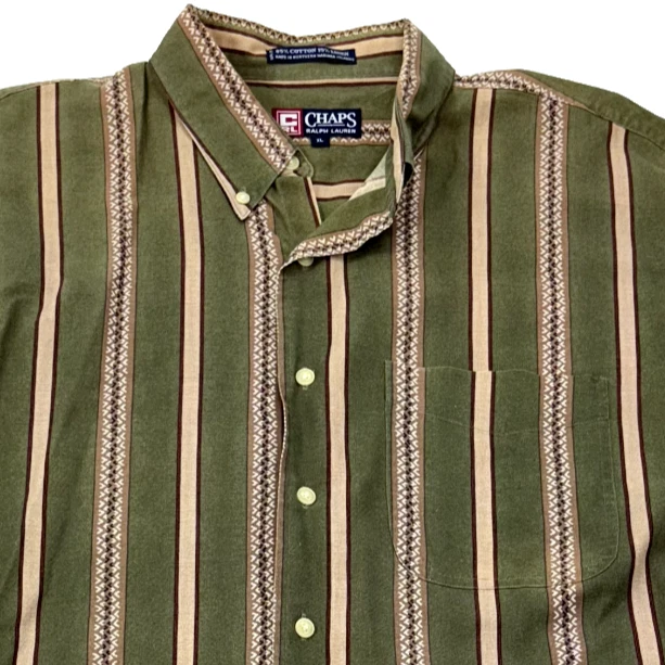 Chaps Ralph Lauren Shirt Green Geometric Striped Long Sleeve Pocket Button Up XL Please refer to photos for the most accurate measurements, description, and estimation of the item's condition. We’re happy to answer any questions or provide additional photos before purchase if requested! All items are sold as is and we try our very best to note any issues with condition in both our description and close up photos. Please remember that colors can look different across different devices and monitors. Condition: Please see photos for measurements. Any further measurements needed? Just ask! EUC Pre-Owned: shows minimal to no signs of wear, as expected with typical well cared for use such as slight fading of colors with age. Please make sure to double check measurements for the best representation of fit, as brands can vary in sizing. Comes without sales tags, dust bag, or brand box. Will it Fit Check? Please reference the listed measurements (in photos and/or text) before purchasing. Fit check tip: Grab your favorite similar style item at home, lay the garment on a flat surface, and measure shoulder to shoulder, the width (armpit to armpit), and length (top to bottom). Then compare your measurements to those in our listing! If you need any further measurements not noted in the listing, please feel free to request, we will get back to you asap. FAST SHIPPING! Orders are usually shipped within 24 hours M-F Friday orders will ship Monday morning at the latest, unless there is a postal holiday. Feel free to send us a message before purchase if you?d like a certain delivery service or combined shipping offers. Still got Questions? Send us a message! We do our best to accurately and thoroughly represent each item in images and condition description, but, if there's any further information you'd like before purchasing or have a shipping request, please don't hesitate to ask and we'll get back to you asap. RETURN POLICY: Please reach out prior to purchase with any questions or shipping requests. Returns are accepted within 30 days, buyer pays return shipping. Refund issued upon receipt of item in original condition. Full refund (minus original shipping) will be issued once we receive the item assuming it is in the exact same condition as it was shipped.(Clean, unaltered, tags still attached if item was new with tags, etc.) We request that you select "Item does not fit" when returning an item that does not fit. Thank you for shopping small and supporting our lil' Rodeo!