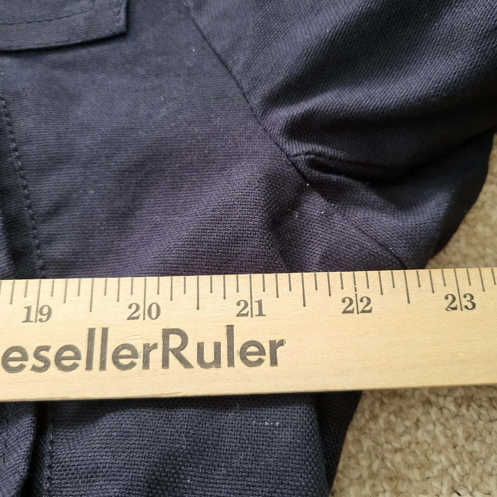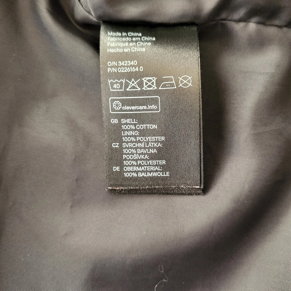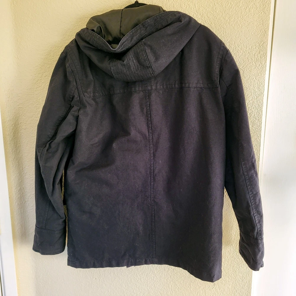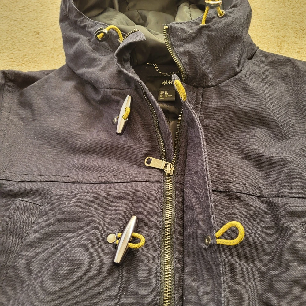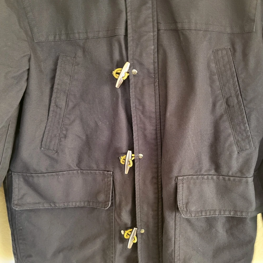 In good condition with no holes or stains. Size 42R. Measures approximately 22" pit to pit and approximately 29" in length. The navy blue heavyweight canvas material is lined with polyester and features a full zip closure with toggles. The jacket is a short to mid-length coat with long sleeves and a regular fit, making it comfortable and practical for everyday wear. The jacket has a solid pattern and numerous pockets. It is machine washable and made. The jacket is ideal for winter and outdoor activities.