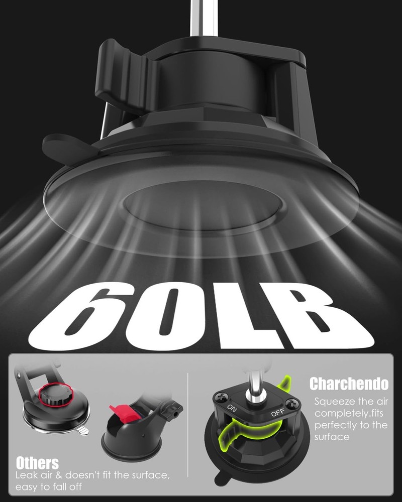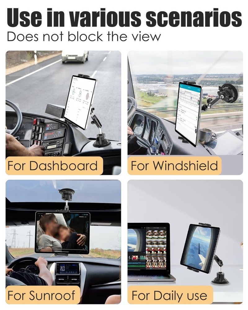 Charchendo Tablet Holder for Car Truck SUV Dashboard Windshield, Strong Suction Cup Tablet Phone Mount with 7.5" Metal Arm 360° Rotation Fits iPad Pro 13/12.9/Air/Mini, Galaxy Z Fold, 4-13" Devices Product Details Brand: Charchendo Color: Black Compatible Devices: iPad Pro 13" / 12.9" / 11" / 10.5" / 9.7", iPad Mini 1 / 2 / 3 / 4 / 5, iPad Air 1 / 2 / 3 / 4, iPad 5th / 6th / 7th / 8th Generation 10.2", iPad 2017 / 2018 / 2019 / 2020 / 2021; Microsoft Surface Pro series, Galaxy Tab series, e-Readers; See more Compatible Phone Models: iPhone 15 / 15 Pro / 15 Pro Max / 15 Plus, iPhone 14 / 14 Pro / 14 Pro Max / 14 Plus, 13 / 13 Pro / 13 Pro Max, 12 / 12 Pro / 12 Pro Max, 11 / 11 Pro / 11 Pro Max, X / XS / XR / XS Max, 8 / 8 Plus, 7 / 7 Plus, 6 / 6S / 6 Plus / 6S Plus; Galaxy Z Fold 5, Z Fold 4, Z Fold 3; Galaxy Z Flip 5, Z Flip 4, Z Flip 3; Galaxy S20 / S20+ / S20 Ultra, S10 / S10+, Galaxy Note 10 / 10+, Note 9 Note 8 S9 S8 A9 Star S8+ S9+ S7 edge S6 edge+; Google Nexus and More. See more Mounting Type: Car Windshield Dashboard Package Dimensions: 5.67 x 4.53 x 4.49 inches Item Weight: 13.9 ounces Special features: Anti-Drop, Changeable position, Easy to Install, Metal Ball Head 360° Adjustable Viewing, Works for All 4-13" Phone Tablet Color: Black Whats in the box: 1 x Tablet mount Manufacturer: Charchendo Date First Available: May 21, 2024 *Charchendo suction cup will not leave any residue or marks on the surface when removed! 3.35" Reusable Suction CupThe super-strong vacuum suction cup of this car tablet holder has a diameter of 3.35", which can keep the truck tablet holder firmly fixed to the windshield and dashboard even on very bumpy journeys. 7.5" Metal Arm & 360 Rotation Metal Ball HeadThe car dashboard iPad holder has a multi-jointed 360-degree rotating metal ball head and a rotatable metal arm, which is more durable and more stable than plastic materials. It provides a perfect driving viewing angle and will not block your sight, which is perfect for your safe travel. Multiple Mounting MethodsThe car iPad holder provides dashboard, windshield mounting for cars. The tablet holder has super strong adsorption ability on any smooth surface. Such as car windshields, windows, car hoods, glass tables, boat windshields, boat dashboards and tables. Ideal for heavy vehicles such as pickup trucks, vans, semi-trailers, buses and SUVs. Wide CompatibilityUniversal tablet mount adjustable clip fits all 4.7-13'' devices. The clip size 4.7-9.64'' (11.93-24.5cm), Thickness 0.7'' (1.8cm), which makes the clip work with or without a case Can hold on tightly. Compatible with tablets such as ipad 11/air/12.9''/13" series; ipad mini 4/5/6; Galaxy Tab; Compatible with 99.9% of mobile phones on the market at the same time, Such as iPhone15 Pro Max/14/13/12/11 series; Galaxy Z Fold/Flip. GPS Navigator, etc. Package Included1 x Car truck tablet phone holder, 1 x Dashboard Pad Mounting Disk, 1 x User Manual. All Charchendo products come with 12-month worry-free guarantee. We will respond to any of your questions with in 12 hours.