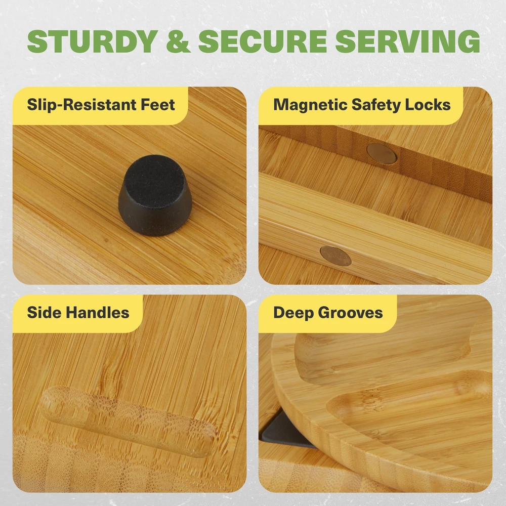 Complete Set: Includes a cheese tray platter with 4 stainless steel utensils, 3 ceramic bowls, a detachable serving tray, and 2 hidden drawers for organized storage and serving Premium Bamboo: Crafted from 100% bamboo, this bamboo cheese serving tray is durable, easy to clean, and suitable for hosting events, offering an eco-conscious, luxurious wood finish Ideal for Entertaining: This charcuterie board set features a grooved rim for crackers and bread, providing ample space for cheeses, meats, fruits, and more to impress your guests Hidden Utensil Storage: Designed with hidden drawers to store utensils neatly, the cheese board with drawers ensures easy access to tools while maintaining an elegant look Ideal Gift Choice: A thoughtful gift for housewarmings, weddings, or anniversaries, this charcuterie boards with hidden utensil drawer complements any kitchen with its stylish design