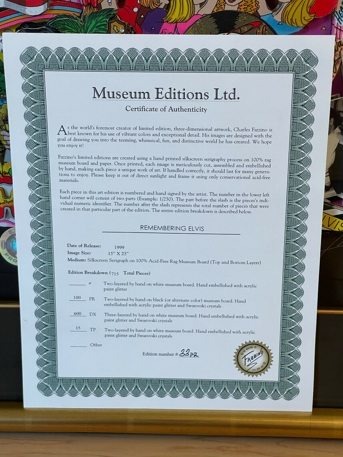 Remembering Elvis  Premier Edition Number 33 of 100.  Image Size 15X23, Framed 27X36.  Tjis is a beautiful Authentic peice from Pop Artist Charles Fazzino.  Signed bottom left hand corner.  Beautifully Framed in Black and Rich Gold.  This is a must for all Elvis Lovers