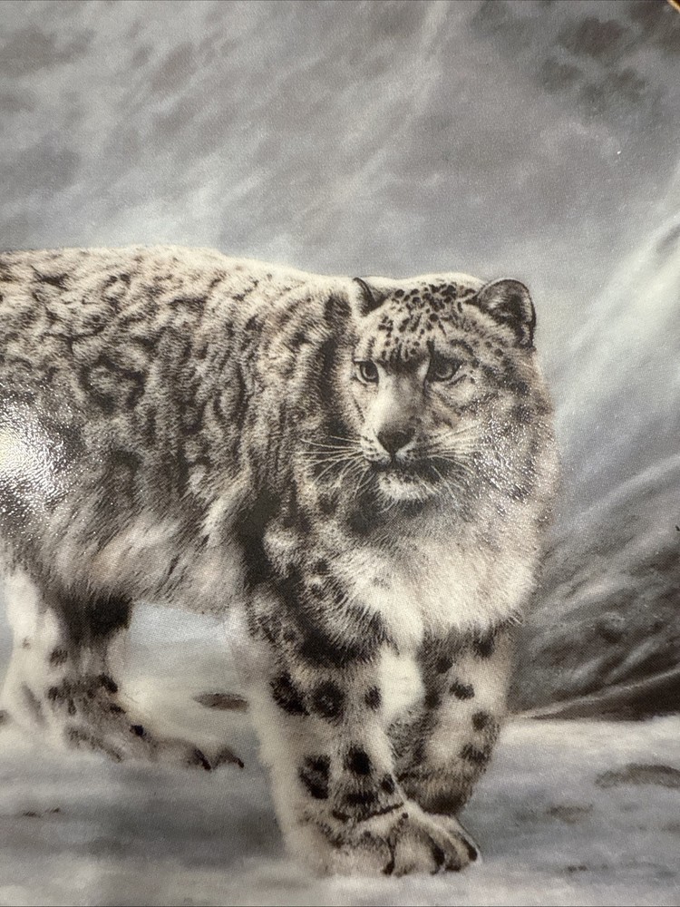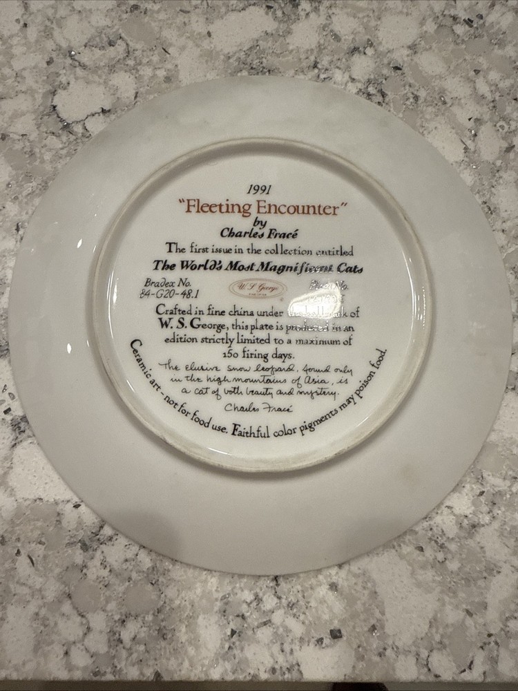 The Charles Frace Collector Plate depicts a snow leopard in a unique and decorative style. This limited edition plate, numbered 16047D and signed by the artist, features a round shape with a diameter of 9 inches. Made of porcelain, the plate belongs to the Bradford Exchange franchise and was produced in the United States during the late 20th century. The art pottery piece showcases an animal print pattern and is a perfect addition to any collector's display, particularly for those interested in wild animals and American culture. There are a few age spots on the back. See photos for details.