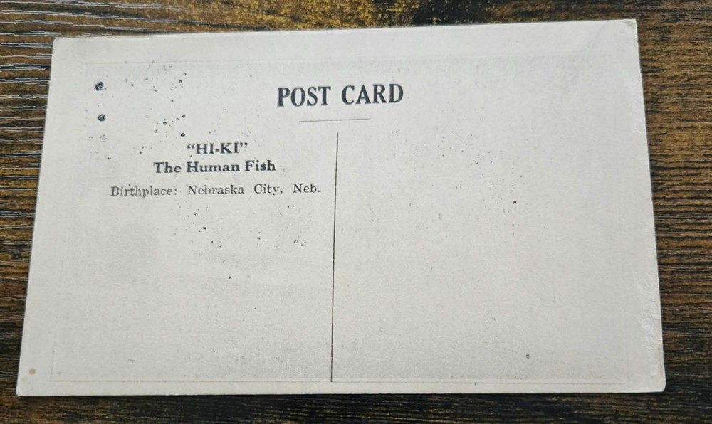 Charles Hi Ki Williams – “The Human Fish” Authentic early 1900s Real Photo Postcard (RPPC) featuring Charles Hi Ki Williams, known as “The Human Fish.” Williams was a sideshow performer famous for his unusual appearance and exhibition performances during the early 20th century. Item Details Subject: Charles Hi Ki Williams – “The Human Fish” Type: Real Photo Postcard (RPPC) Era: Early 1900s Theme: Circus / Sideshow / Oddities / Human Curiosities Material: Photographic postcard stock Origin: United States Condition Vintage condition consistent with age. May show typical wear such as corner/edge wear, light creasing, or age toning. Please review the photos carefully to judge condition for yourself. Features Original early 20th century real photo postcard Unique sideshow and curiosity collectible Highly collectible circus / oddities / freak show history item Great addition to RPPC, circus, or sideshow collections