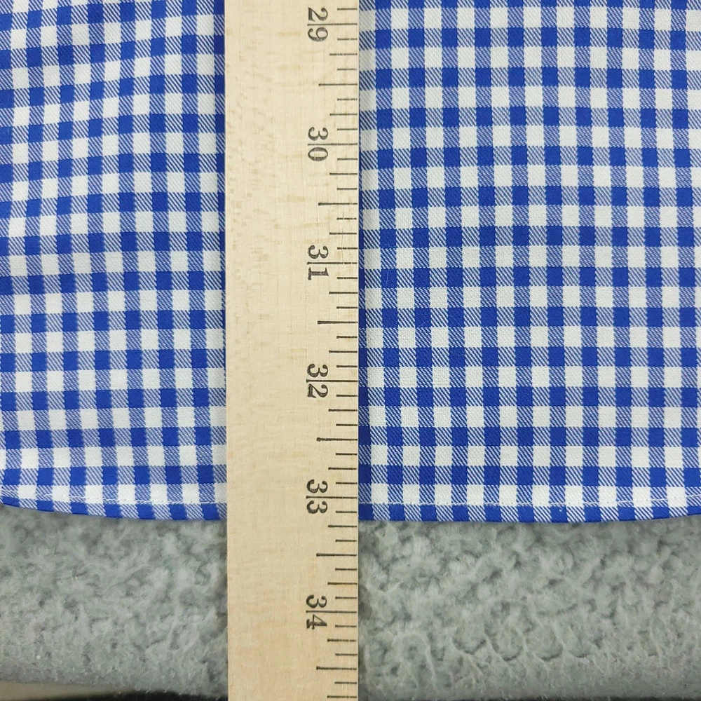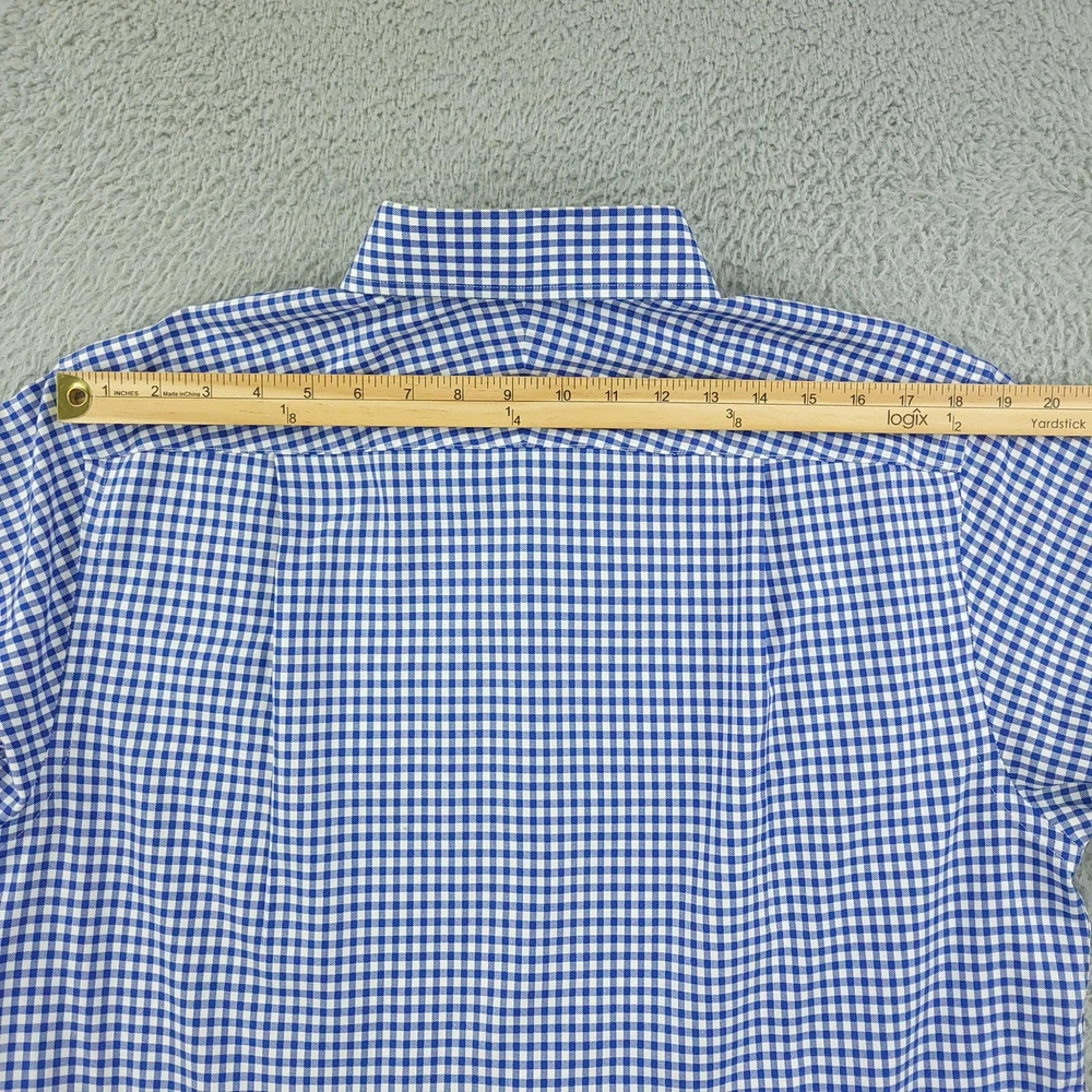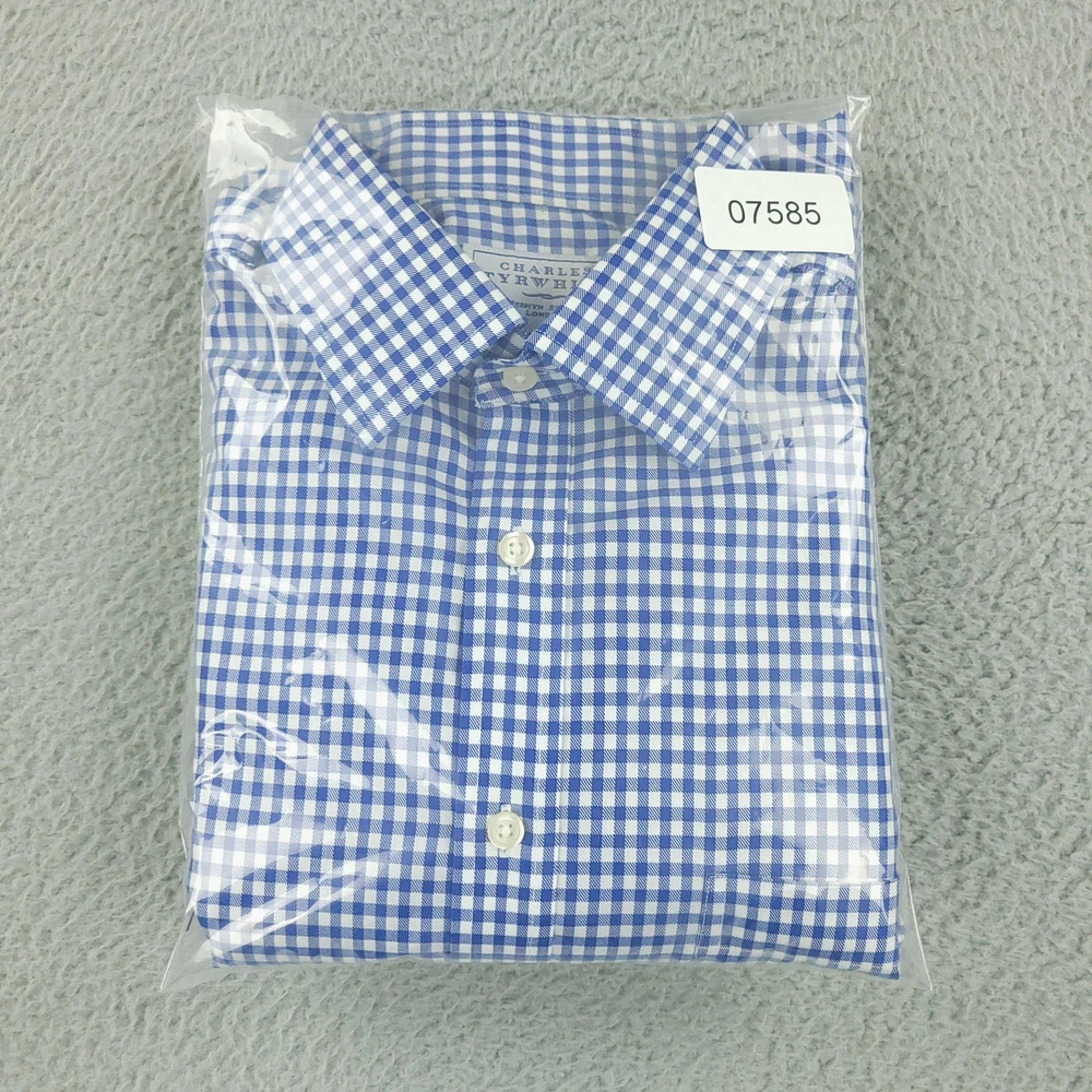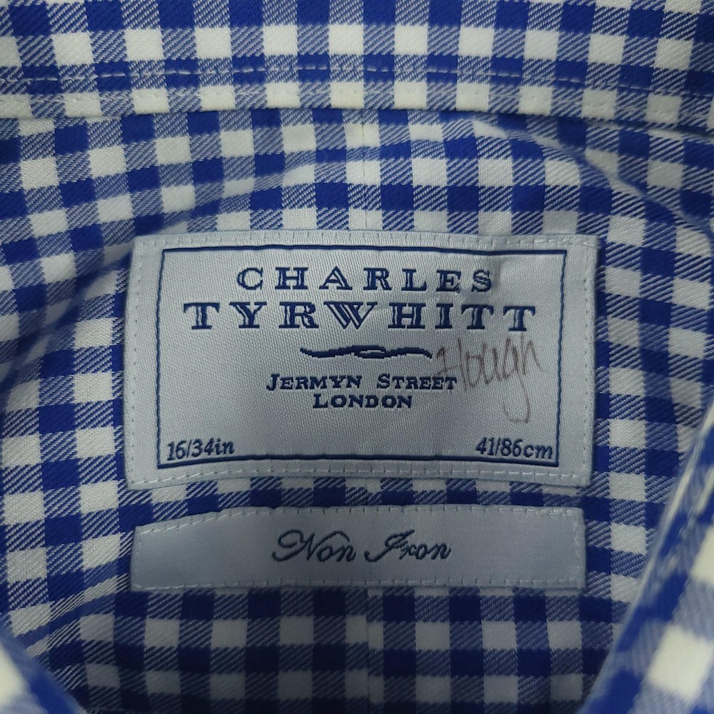 Charles Tyrwhitt Dress Shirt Mens 16 Blue Gingham Non Iron Cotton Brand: Charles Tyrwhitt Jermyn Street London. Style: Mens long-sleeve dress shirt with blue and white gingham check pattern. Size 16 Material: 100% cotton Details: Spread collar, full button front with white buttons, single left chest pocket, barrel cuffs with two-button adjustment and sleeve placket buttons, back yoke with side pleats, and curved shirttail hem. Special note: Handwriting present on the inner neck label as shown in photos. Measurements are included in the photos, compare measurements with your item to ensure proper fit. Items are added daily click here to Visit My Store Combined shipping for US customers is 1.99 for each additional item Items are cleaned per eBay standards & policies