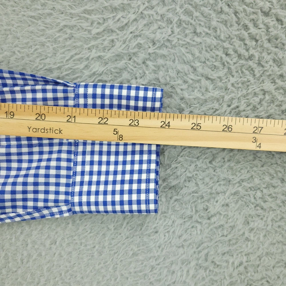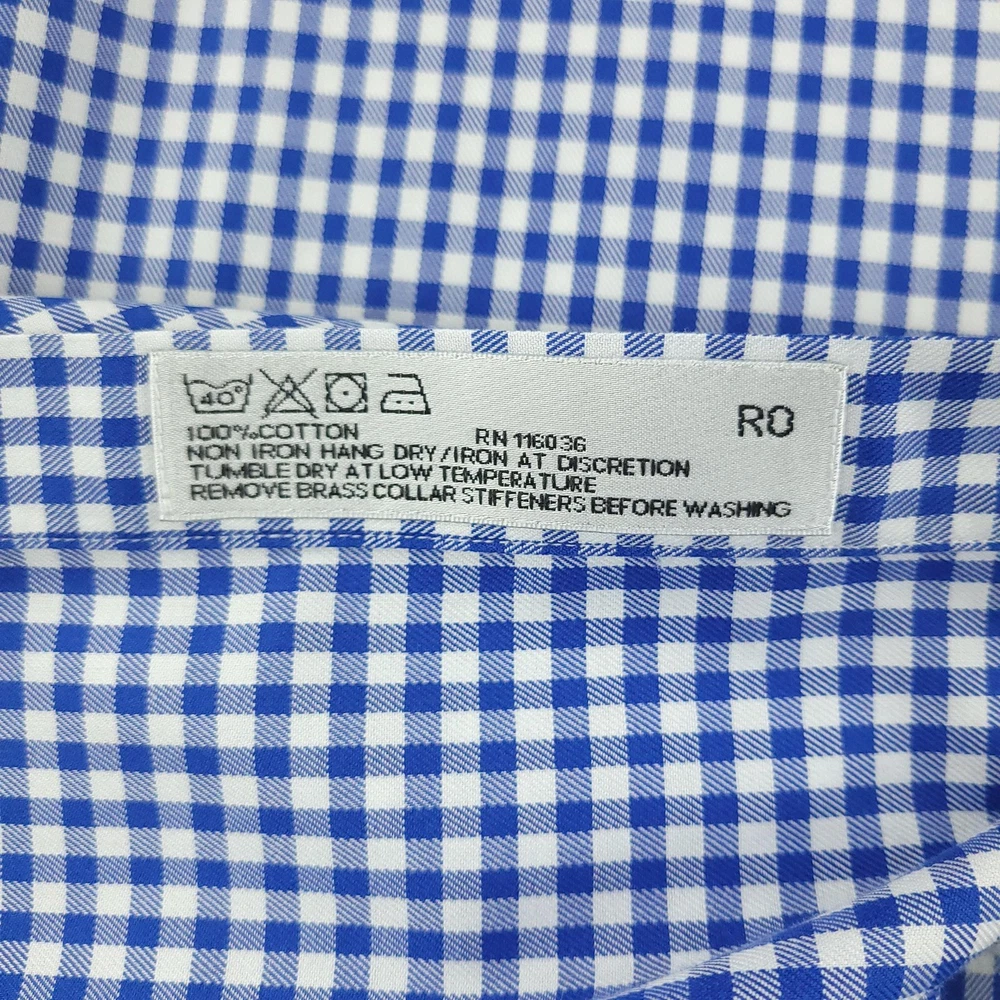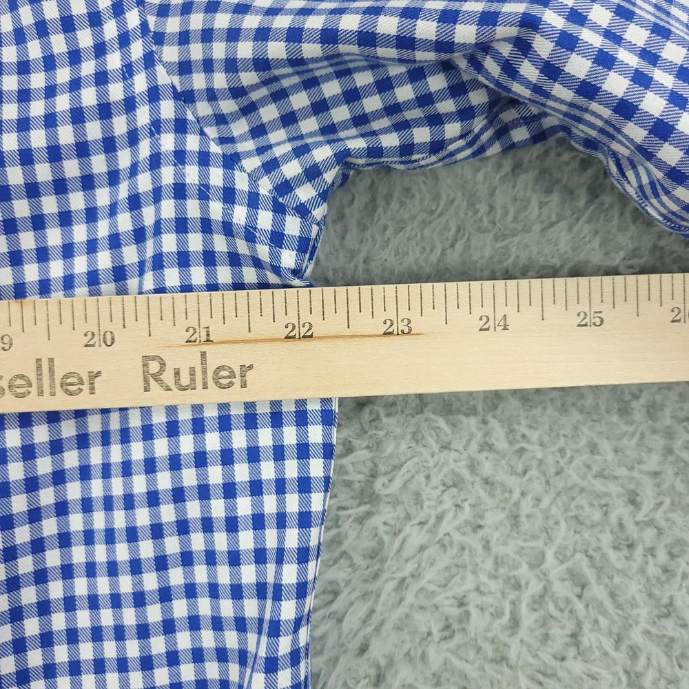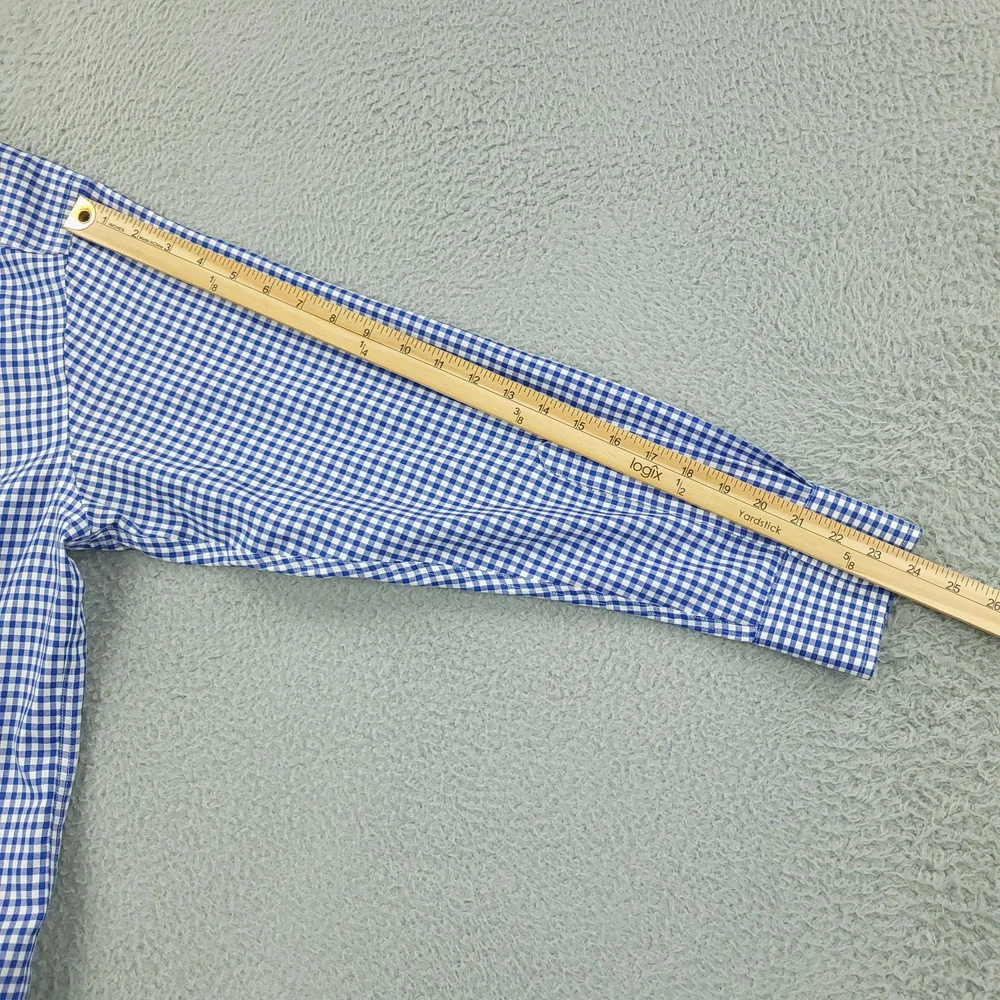 Charles Tyrwhitt Dress Shirt Mens 16 Blue Gingham Non Iron Cotton Brand: Charles Tyrwhitt Jermyn Street London. Style: Mens long-sleeve dress shirt with blue and white gingham check pattern. Size 16 Material: 100% cotton Details: Spread collar, full button front with white buttons, single left chest pocket, barrel cuffs with two-button adjustment and sleeve placket buttons, back yoke with side pleats, and curved shirttail hem. Special note: Handwriting present on the inner neck label as shown in photos. Measurements are included in the photos, compare measurements with your item to ensure proper fit. Items are added daily click here to Visit My Store Combined shipping for US customers is 1.99 for each additional item Items are cleaned per eBay standards & policies