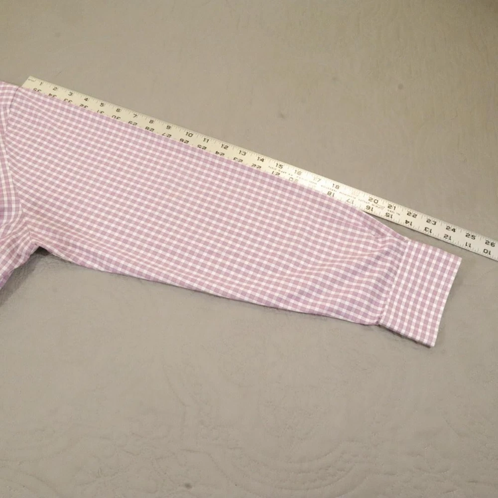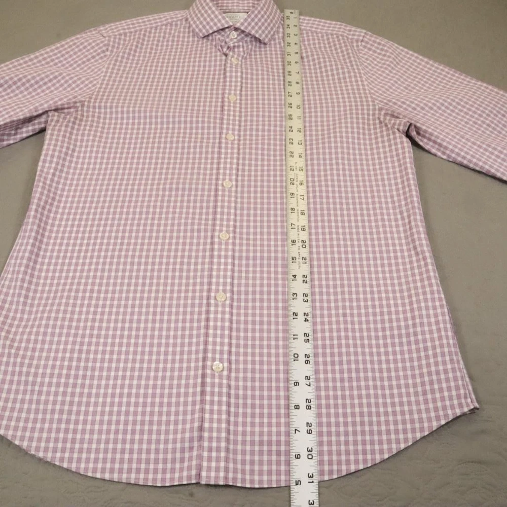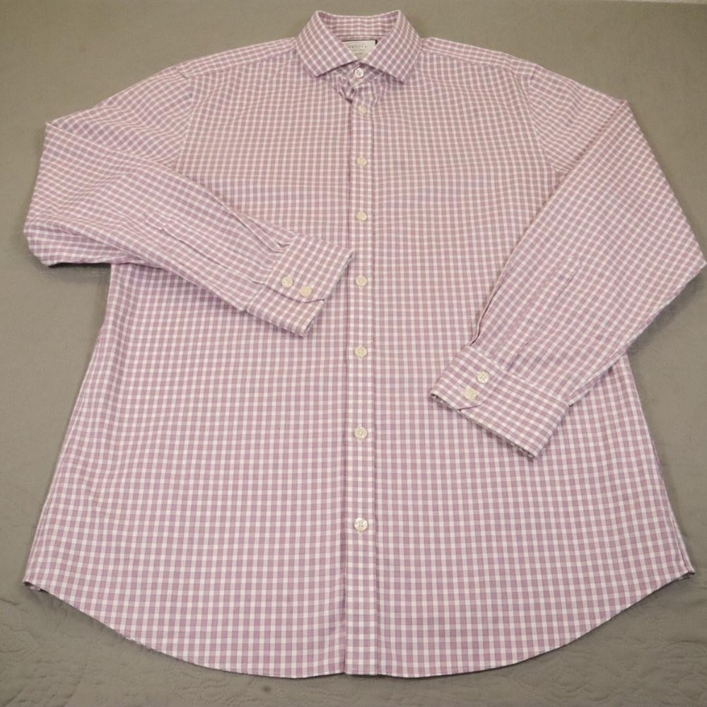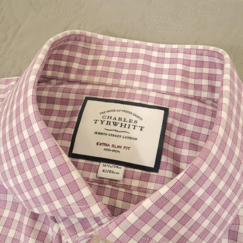 Brand: Charles Tyrwhitt Style: Mens long sleeve extra slim fit dress shirt with spread collar, button front, barrel cuffs, and curved shirttail hem. Color/Pattern: Purple and white gingham check pattern with white buttons for a sharp, modern dress look. Material: 100% cotton non-iron fabric; designed in London and made in China. Tag size: 16.5 neck, 34/35 sleeve (Extra Slim Fit, Non-Iron).