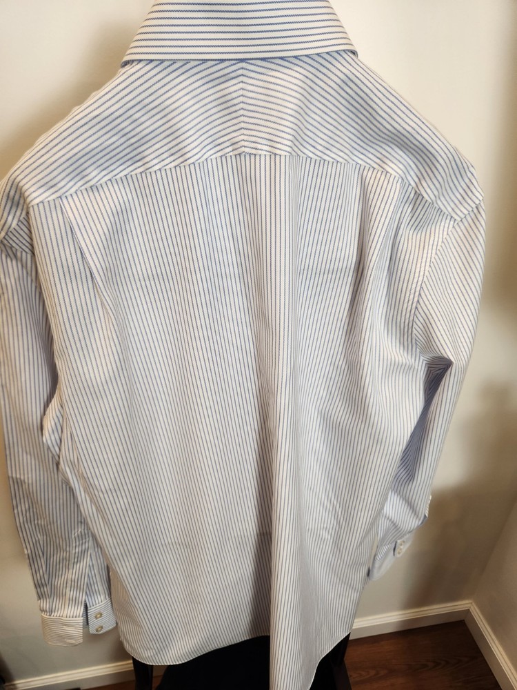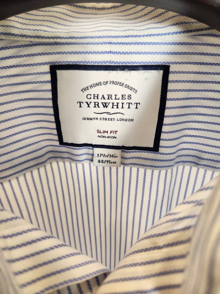 Charles Tyrwhitt Slim Fit Non Iron White With Blue Stripe 17 1/2 36". Condition is Pre-owned - Good. Shipped with USPS Ground Advantage.