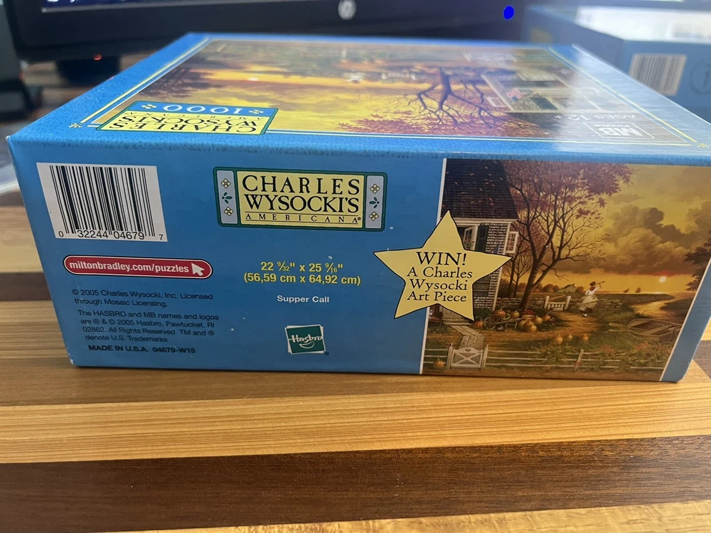 This Charles Wysocki Americana Supper Cell Puzzle is a great addition to any puzzle collection. With a seal still intact, this puzzle has never been opened and is ready for you to complete. The puzzle features a beautiful landscapes theme with a multi-color palette. Produced by Hasbro in 2005, this puzzle has 1000-1999 pieces and is classified under the Contemporary Puzzles category. Perfect for anyone who loves jigsaw puzzles, this puzzle is sure to provide hours of entertainment and a sense of accomplishment once completed. Add this puzzle to your collection today!