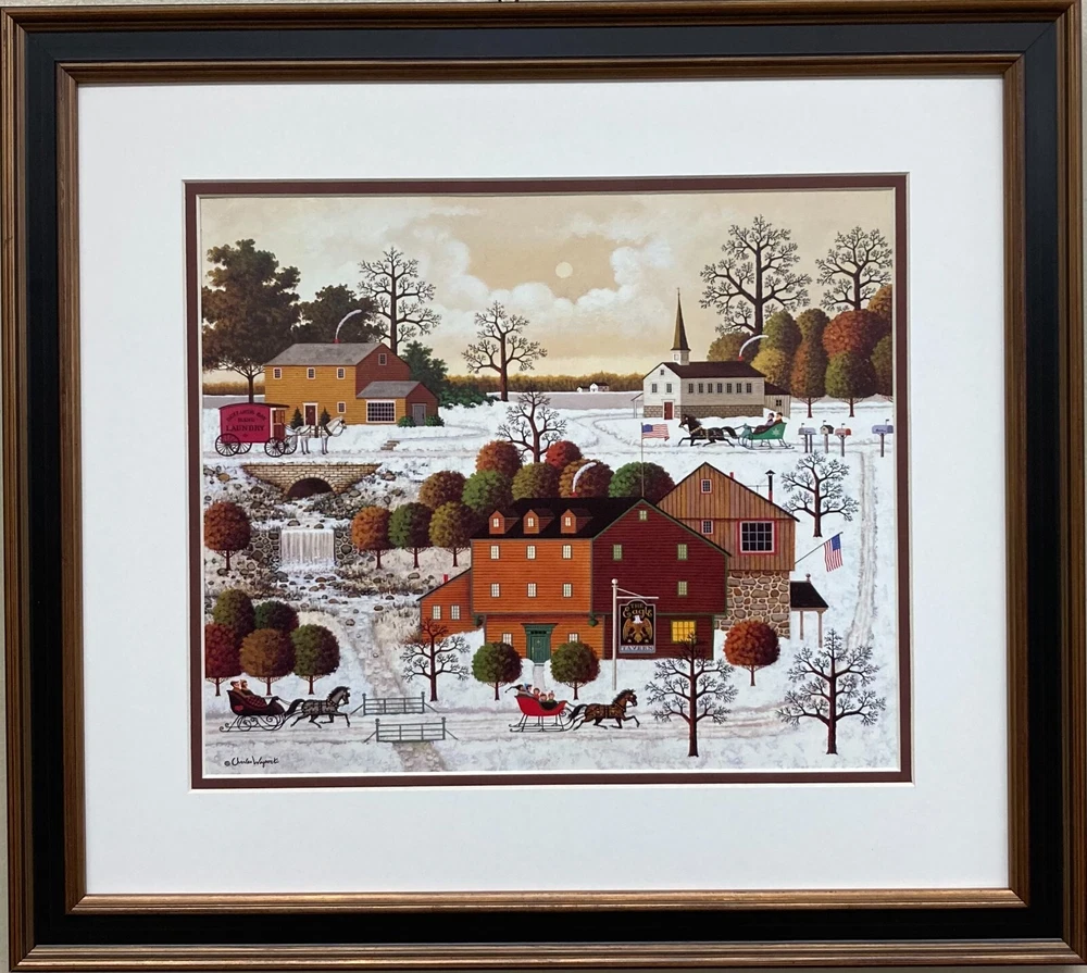 Charles Wysocki's "Buzzard's Bay" This art print is: NEWLY CUSTOM FRAMED in a Top Quality GOLD& BROWN WOOD FRAME Double matted in Off White/ Brown Plate Signed Art Print Framed Size: 18" x 20" Image Size: 11" x 13" FRAMING ALONE IS WORTH OVER $150 About the Artist... “My love is for patterns. My interest is fitting them together,” Charles explains his colorful patchwork painting as early American life in New England, Pennsylvania and the Old South. Born in Detroit in 1928, Wysocki enjoyed an active and happy boyhood which seems reflected in the spirit of his work. After studying at the Art Center School of Design in Los Angeles, he began his career as commercial artist in Detroit. He soon abandoned it however, for the more independent life of free-lancing. Returning to California, he married and established his home there. Chuck and Elizabeth Wysocki have a great deal in common. They share an art background and the ethic of hard work. They have succeeded in capturing the rare sense of serenity that results from being content with the simple things in life, for which he gives his wife much of the credit. Vacations spent in New England have enhanced this feeling. Browsing through the historic countryside, collecting old brass and pewter , chests and cocks, they envision an earlier, slower paced life style in time with their own thinking and philosophy. Such are the influences that have combined to develop Wysocki’s personal style of painting and choice of subject matter. He is now in that exclusive company of artists whose work sells as fast as it can be produced. Winner of more than 50 awards, he has been in major group and one-man shows from coast to coast. His career and reputation is in full swing. “I consider myself a painter of Early American Life,” he says. “The people in my pictures are country folk, simple in manner and happy in their activities. If some naivete appears in my work, it is because it was planned that way and is undoubtedly a desire to live that way myself.”