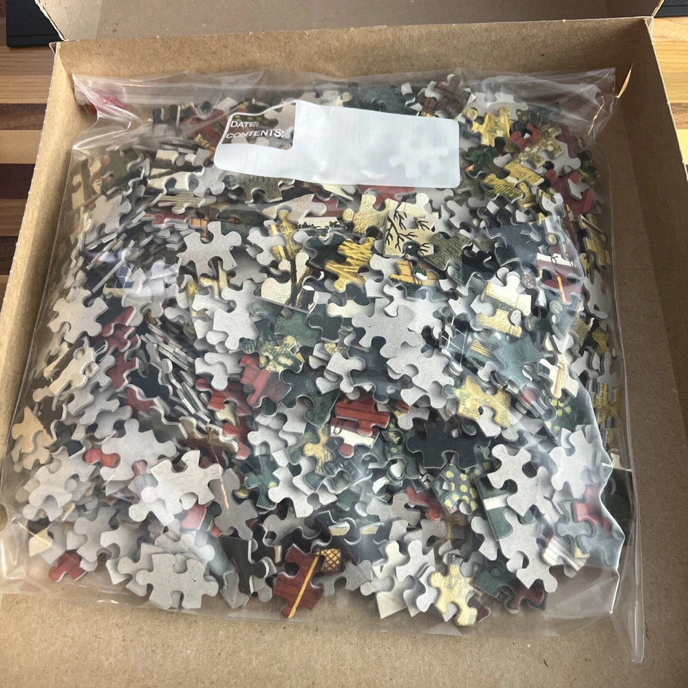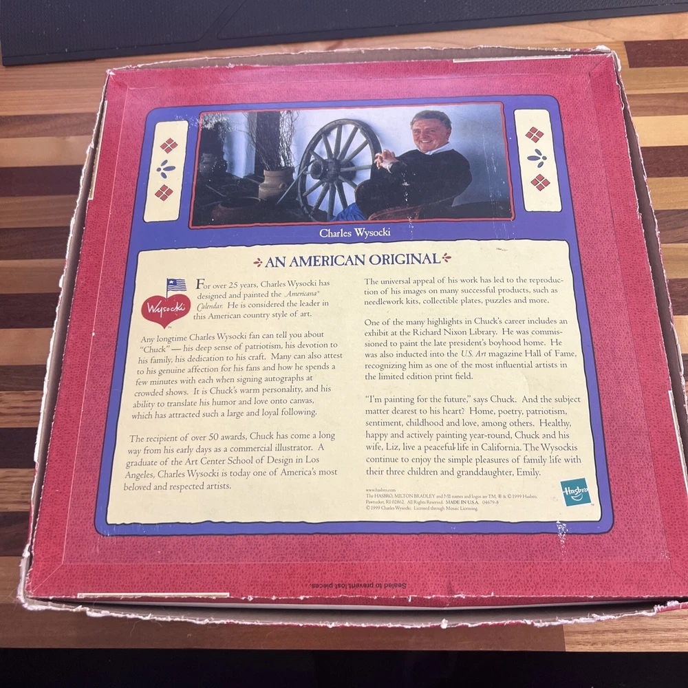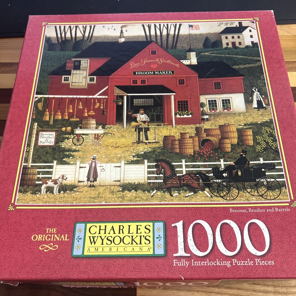 This Charles Wysocki puzzle features a colorful landscape with brooms, brushes, and barrels. It has 1000-1999 pieces and is made of durable cardboard material. The puzzle is perfect for puzzle enthusiasts who enjoy contemporary jigsaw puzzles and want to add a unique challenge to their collection. The puzzle is branded by Hasbro and is a great addition to any toy or hobby collection.