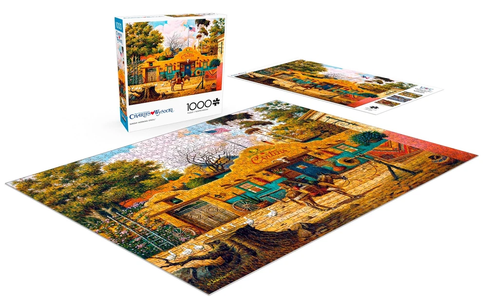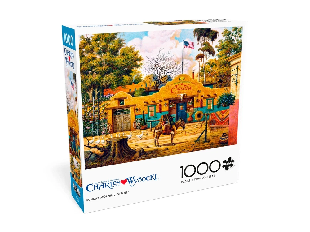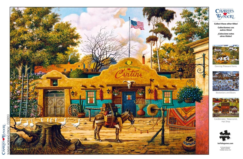 This 1000-piece puzzle titled “Sunday Morning Stroll” features a town building with the word “Cantina” above the door. The image also features a donkey with a full load of supplies waiting for its owner. For more than 40 years Charles Wysocki enjoyed his love affair with life and Americana, and through his imaginative and colorful artwork touched the hearts of millions worldwide. "Chuck" felt a special kinship with puzzlers, who share in the creative process by building his paintings one piece at a time. Every jigsaw puzzle is manufactured from recycled puzzle board. A precision cutting technique guarantees that every piece will fit soundly with the company's signature Perfect Snap™. A bonus puzzle poster is also included so that you have a handy reference of what the completed puzzle should look like while you put yours together. 1000 PIECE JIGSAW PUZZLE – This 1000-piece jigsaw puzzle is the perfect level of challenge. Measuring 26.75” x 19.75”, this puzzle is a great single evening activity for the entire family, friend group or yourself. For adults ages 14 and up. HIGHEST QUALITY MATERIALS – The puzzle pieces are thick and sturdy. Our puzzles are cut with premium dies for laser precision. APEX PUZZLE IMAGERY - Relax and enjoy the puzzling process while “traveling” to some of the most beautiful, bucket-list places, Or join in the fun with our portfolio of licensees, or finish in style with world renown artists. FULL COLOR BONUS POSTER - Every puzzle includes a full color poster to reference while assembling your puzzle. Or, for a real challenge, try to solve without the poster in hand! PERFECT GIFT - Puzzles are not only great gifts for any and all occasions including birthdays, holidays, housewarming parties or even just a fun night in with friends.