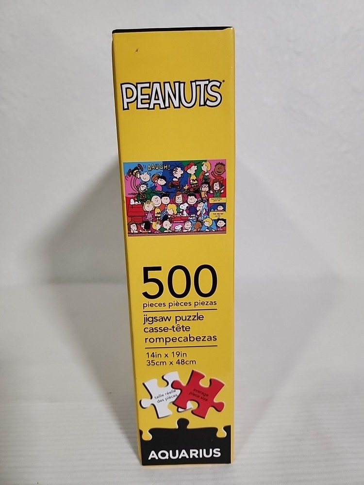 This is a 2020 Aquarius puzzle featuring the Peanuts Gang, specifically Charlie Brown. It contains 500 pieces and measures 14x19 inches when completed. The puzzle is made of cardboard and is suitable for ages 14 and up. It is from a smoke-free household and is in complete condition. The puzzle depicts characters from the Peanuts comic strip and is a fun and challenging activity for fans of the series.
