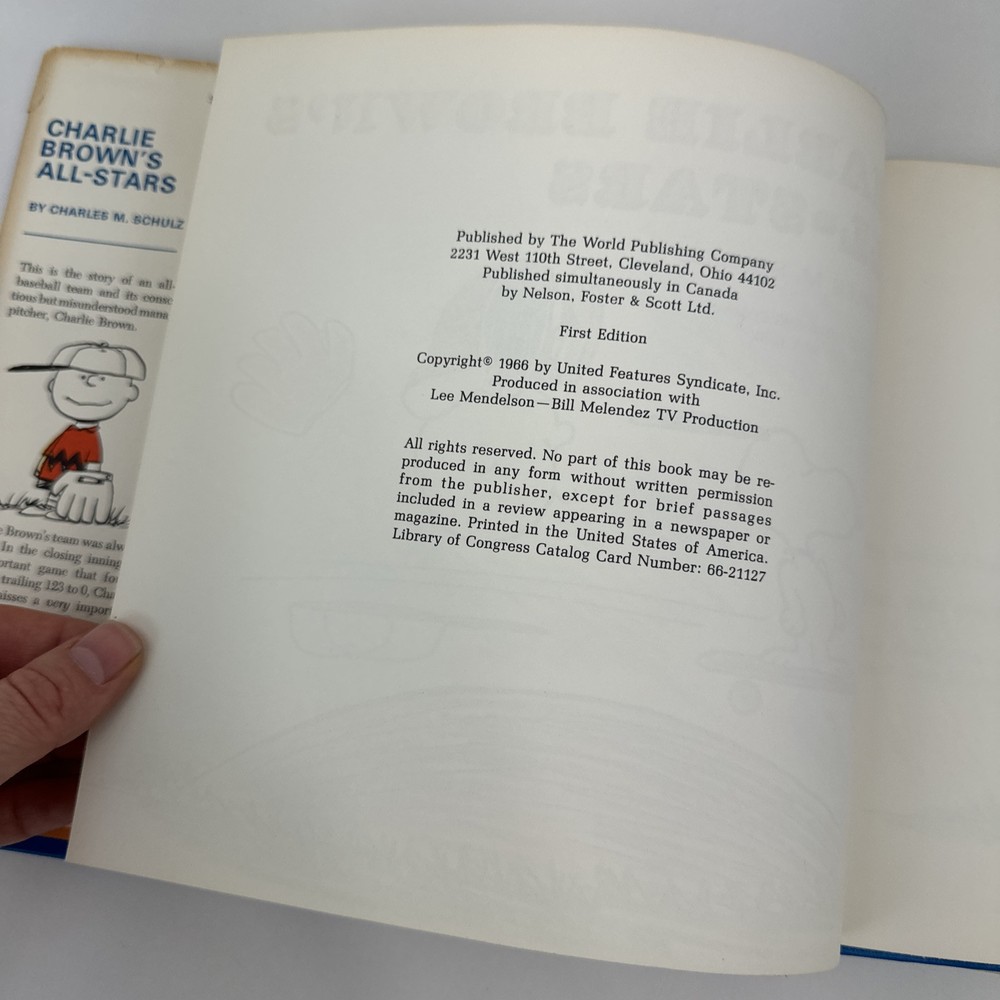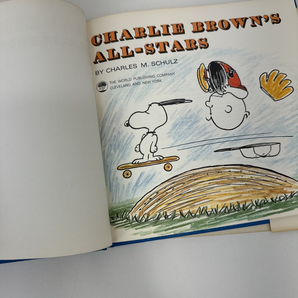 The product is a vintage first edition hardcover book titled "Charlie Brown's Vintage Peanuts 1st Ed Book All-Stars 1966" by author Charles M. Schulz. Published by The World Publishing Company, this book features the beloved characters from the Peanuts comic strip, created by Schulz. The book is in English and is likely a collectible children's book, focusing on the adventures of Charlie Brown and his friends.