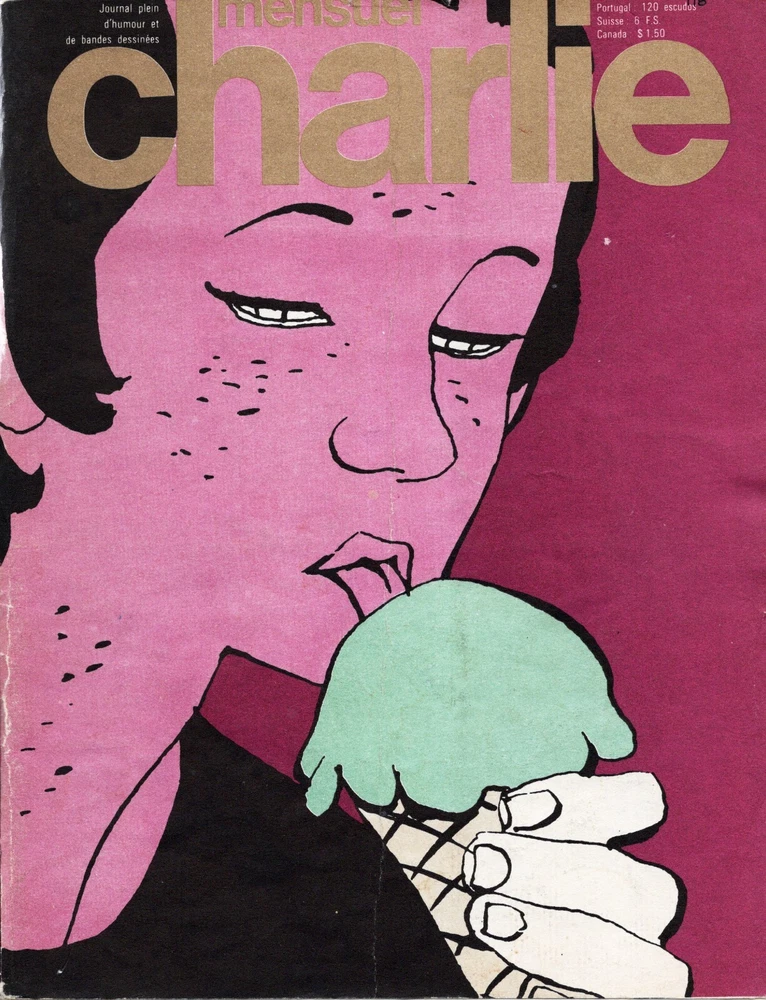 Has fold mark in middle of magazine. In otherwise good condition. Charlie Mensuel (or simply Charlie , "mensuel" being a French term for a monthly periodical) was a French monthly comics magazine. Its publication began in February 1969, and ceased in February 1986. Tagged "The newspaper full of humour and comic strips" , it also adopted the slogan, "The newspaper one reads on the couch while munching chocolate" . Charlie was originally the French version of a contemporary Italian magazine, linus . Like its Italian counterpart, it took its name from one of the characters of the comic strip Peanuts , in that case Charlie Brown . [ 1 ] The comics featured in Charlie included French originals as well as translations of American strips — Peanuts and others — and of Italian stories originally published in Linus .