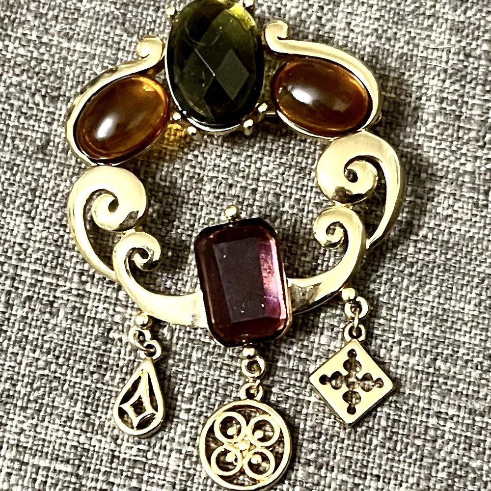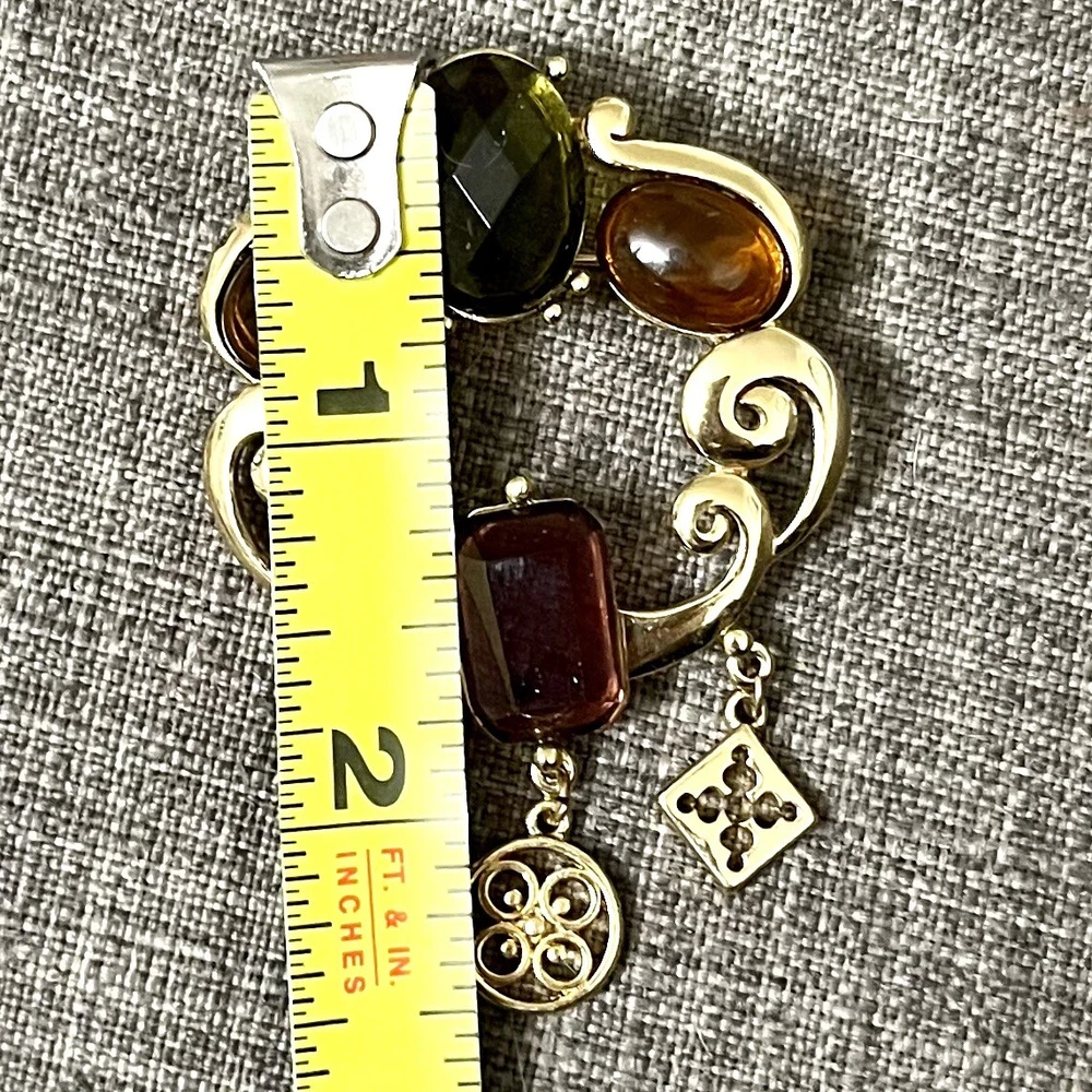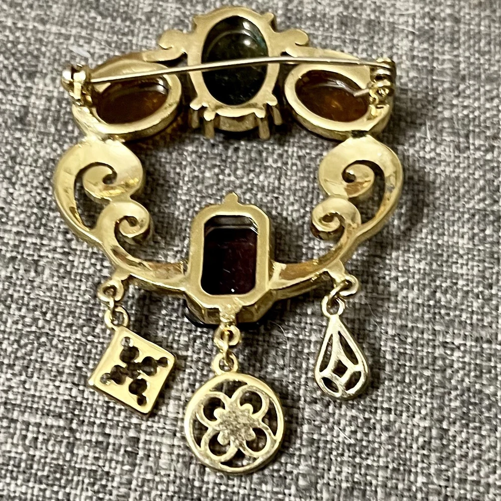 Charm Brooch Pin Jeweled Ornate Victorian Gold Plated Glass Cabochons Vintage Size: 2.5” x 1.75” Condition: Great pre-owned, vintage condition. See images.