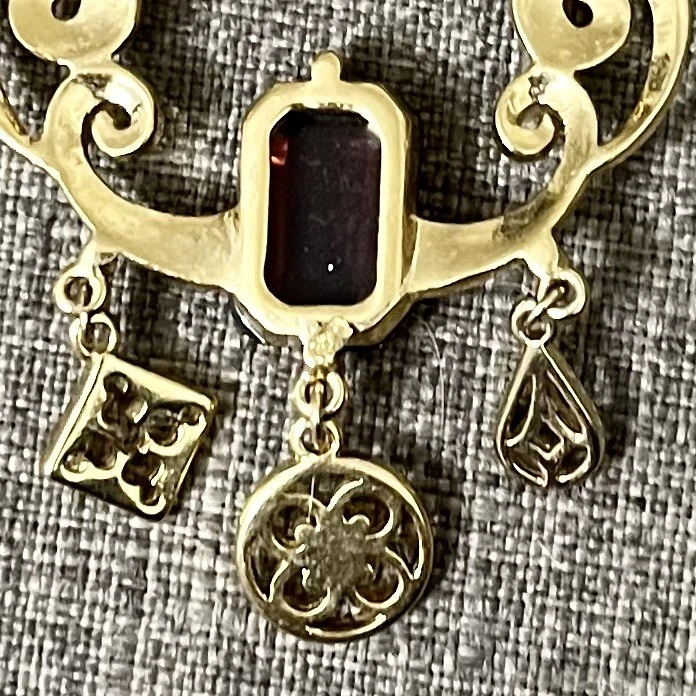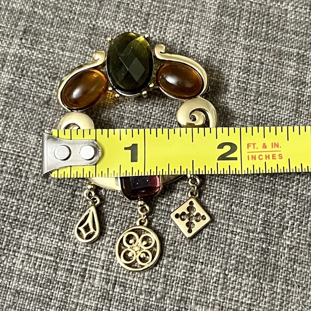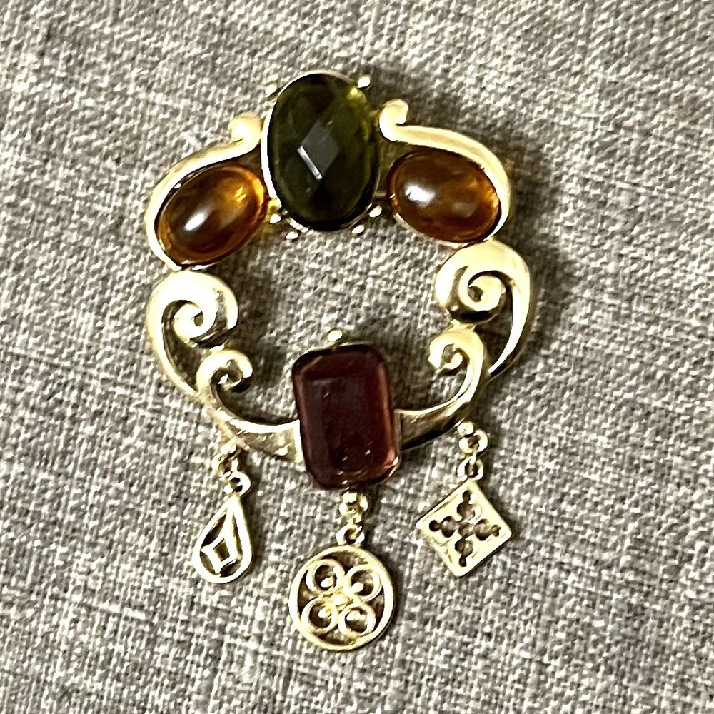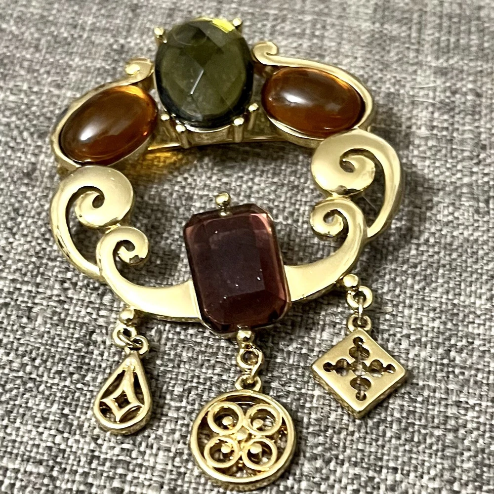 Charm Brooch Pin Jeweled Ornate Victorian Gold Plated Glass Cabochons Vintage Size: 2.5” x 1.75” Condition: Great pre-owned, vintage condition. See images.