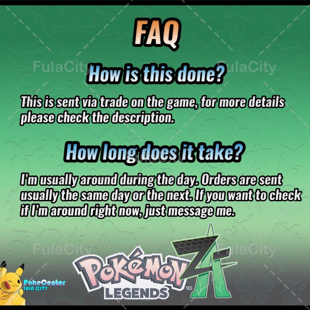 π₯ Hello there! Welcome to my shop! Please be sure to read the full description π₯ Trusted seller with almost 10,000+ positive feedback. Please check images for details and contact us with any questions! FulaCity PokeCenter For all your PokΓ©mon needs Details Please check the images for details. If no customization is asked the default will be sent. NOTE: MEGA STONES CANNOT BE TRADED View all our Legends Z-A PokΓ©mon listings For mobile users please click my on "FulaCityPokeCenter" link above next to store picture to access the store and search from there. For custom requests please use this listing . If you have further questions click here to contact me. Handling information To trade: (Important: You will need to complete Mable's first research reward to unlock Link Play) (Takes about 1-2 hours to reach this point from start of game) Steps: 1 - Once we send you a Link Code, Press X and click on "Link Play" 2 - Click on "Link Trade" and then "Faraway Players" and enter link code we have sent you and begin searching (You may have to try searching more than once if we don't connect the first time) 3 - Your Pokemon box will be shown and you can select any Pokemon you wish to offer for trade (any scrap pokemon you don't want is fine) Nintendo Switch Online subscription required No shipping involved at all since this is a virtual trade. Why buy from me? Almost 10,000+ positive feedback with over 60,000+ sales. Fast delivery 100% legal Pokemon (!!!) safe to use anywhere. Use them in Pokemon Home, GTS, Pokemon Online Battles, Online Raids, Online Trades without issues! Disclaimer: I'm not affiliated with Nintendo, Creatures Inc, The PokΓ©mon Company or GAMEFREAK. You are paying for the time and effort I spent breeding/obtaining the listed PokΓ©mon.