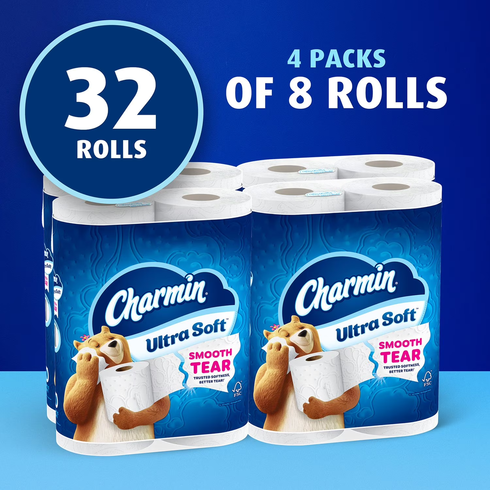 Product details Irresistible Softness You Can Feel With Charmin Ultra Soft: Get irresistible softness with Charmin Ultra Soft Smooth Tear™ toilet paper. Every roll is crafted with wavy edges that tear so much better vs. the leading USA 1-ply bargain brand, so you can have a smooth, more enjoyable go. It’s packed with extra cushiony softness you can see and feel…to provide comfort where you need it most. Of course, our superior comfort comes with superior strength so you can keep your hands clean and bottoms sparkling from cheek-to-cheek. And each sheet of Charmin Ultra Soft Smooth Tear toilet paper is 2X more absorbent vs. the leading USA 1-ply bargain brand, so you can use less! Stock Up On America's Favorite Toilet Paper: Buying our 32-roll packs helps ensure you never run out of Charmin. We all go to the bathroom, those who go with Charmin Ultra Soft toilet paper really Enjoy the Go with America’s favorite toilet paper, based on Total Charmin Brand Sales (Nielsen 2024 Dollar Sales) Septic Safe and Roto-Rooter Approved: Our Charmin Ultra Soft toilet paper is 2-ply and designed to be clog-safe and septic-safe. And it’s Roto-Rooter Approved. Charmin Beyond the Roll: At Charmin, we are committed to making our toilet paper work hard to make a sustainable difference. 100% of our paper comes from responsibly managed forests. For every tree used, at least two are regrown in its place. P&G and Charmin are partnering with the Arbor Day Foundation to plant 1 million trees in forests affected by natural disasters, like wildfires or hurricanes.