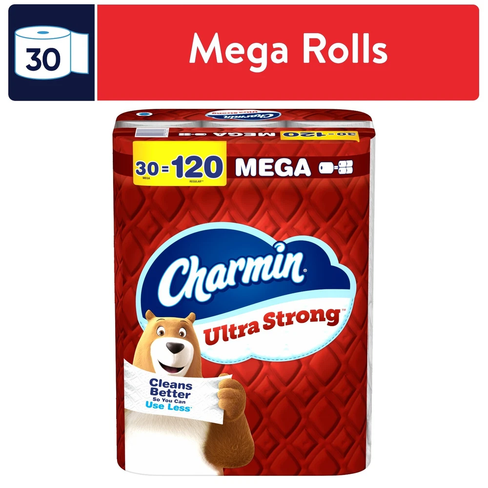 Product details Get sparkly clean with Charmin Ultra Strong Toilet Paper 30 Mega Rolls. It's 4X stronger when wet* and has a diamond weave texture. It's woven like a washcloth and holds up when you wipe. It even cleans better so you can use less*. We also made it MEGA in size, so you get mega value. That's right, our Charmin Ultra Strong Mega Roll equals 4 regular rolls (based on number of sheets in Charmin Regular Roll bath tissue), so you'll be running back to the store less and less. Our Charmin Ultra Strong toilet paper is also 2-ply and designed to be clog-safe and septic-safe so you can flush confidentially and keep clean. Never want to run out of Charmin? Buy in bulk size, larger count packs! We all go, why not Enjoy The Go with America's favorite toilet paper**.*vs. leading USA 1-ply bargain brand**Charmin Brand based on sales. Source: Nielsen 2022 dollar sales. Pack contains 30 Mega Rolls (220 Sheets Per Roll) of Charmin Ultra Strong Toilet Paper 30 Mega Rolls = 120 Regular Rolls Cleans better so you can use less* *vs. the leading USA 1-ply bargain brand 4X stronger when wet* to keep your hands and hiney clean *vs leading USA 1-ply bargain brand Deeper Texture* Cleans Better* *vs. Leading USA 1-ply bargain brand Cleans Better with fewer sheets and less effort* *vs. leading USA 1-ply bargain brand 1 Mega Roll = 4 Regular Rolls* *based on number of sheets in Charmin Regular Roll bath tissue Made with a diamond weave texture and woven like a washcloth
