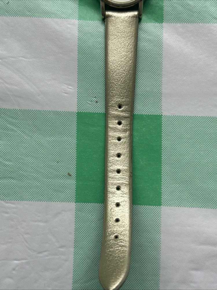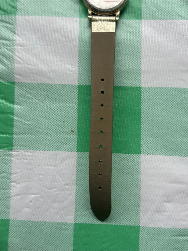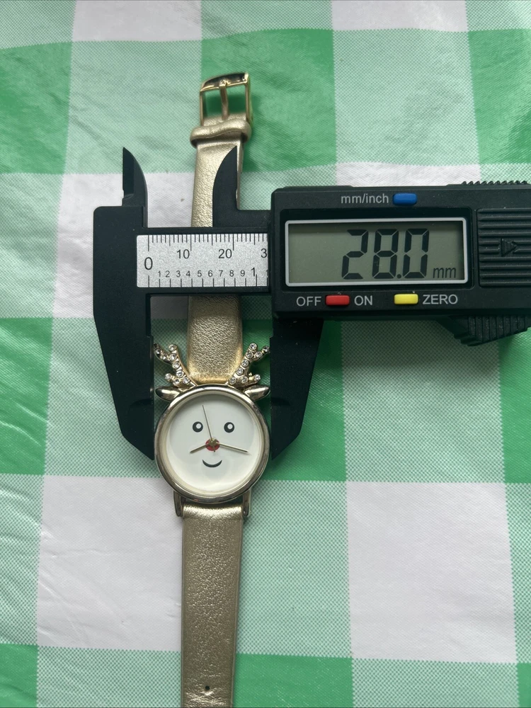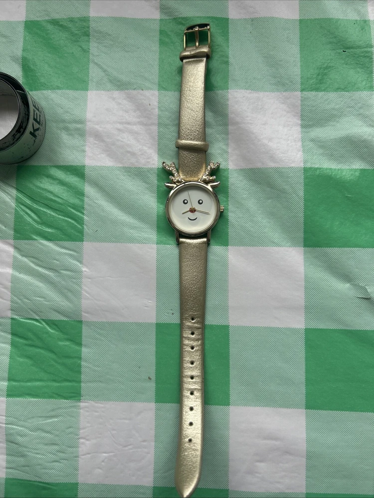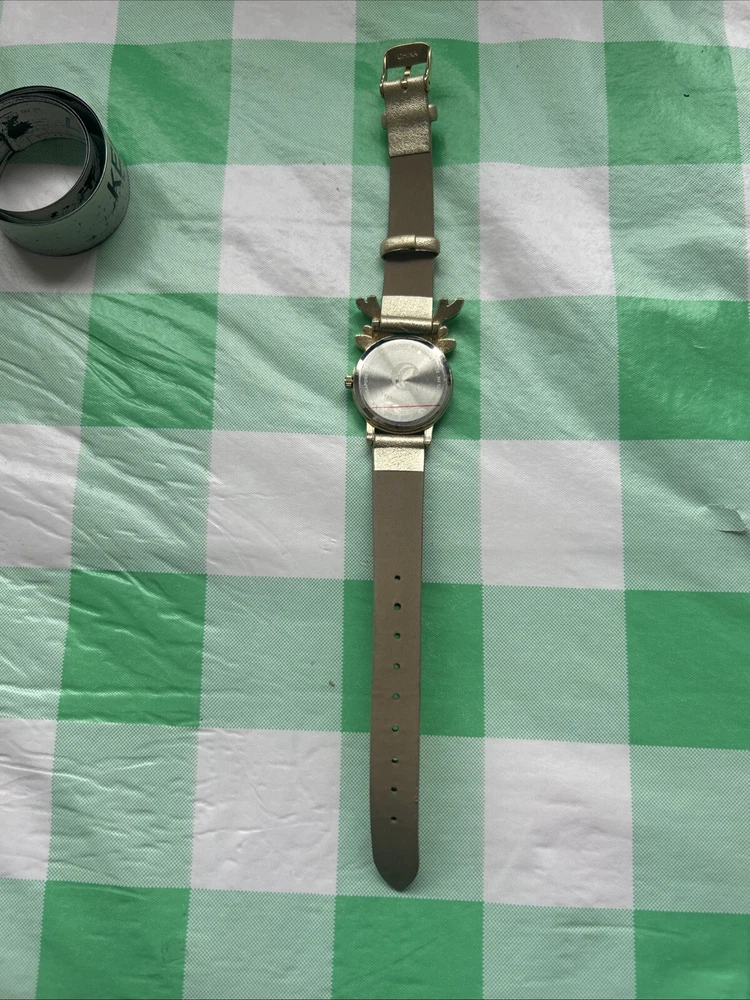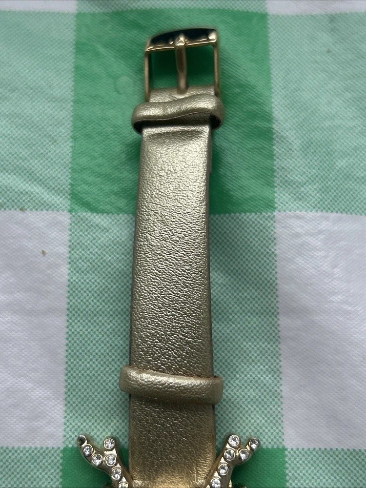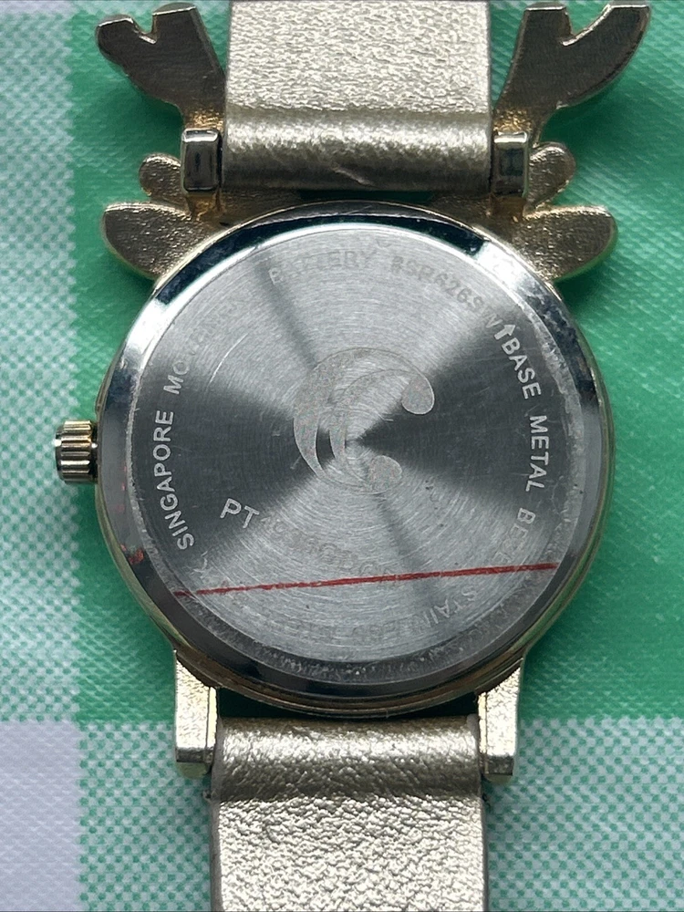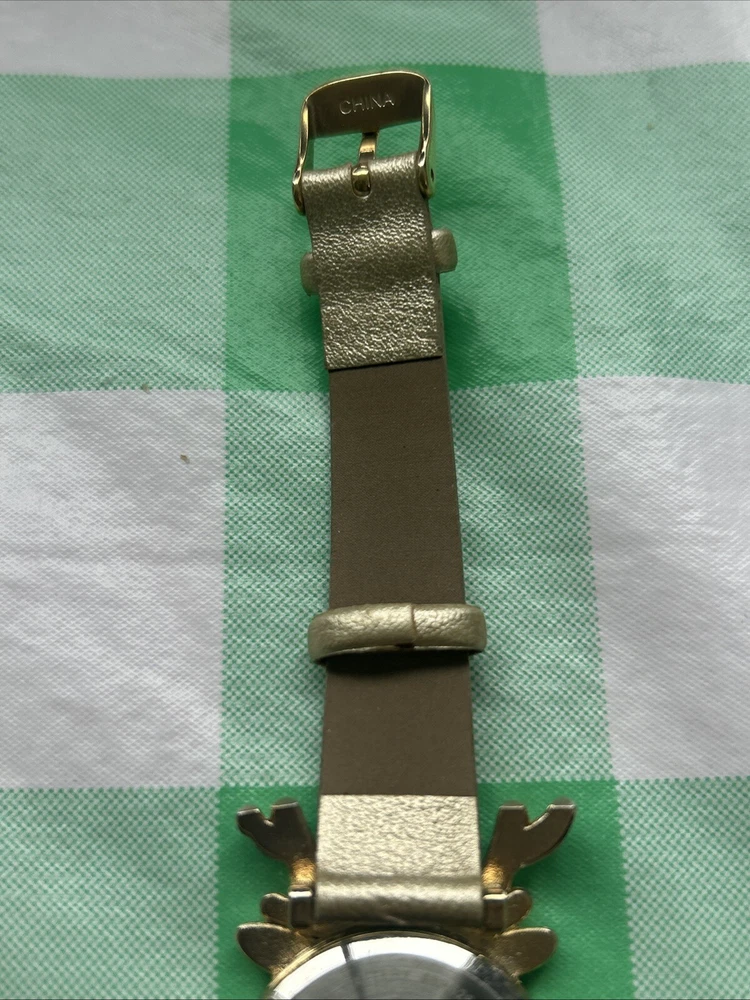 This watch is used and shows signs of wear. There is a crystal missing on the reindeer antlers as seen in the photos. Please ask any questions you may have and we will get back to you as soon as possible. New battery installed upon purchase