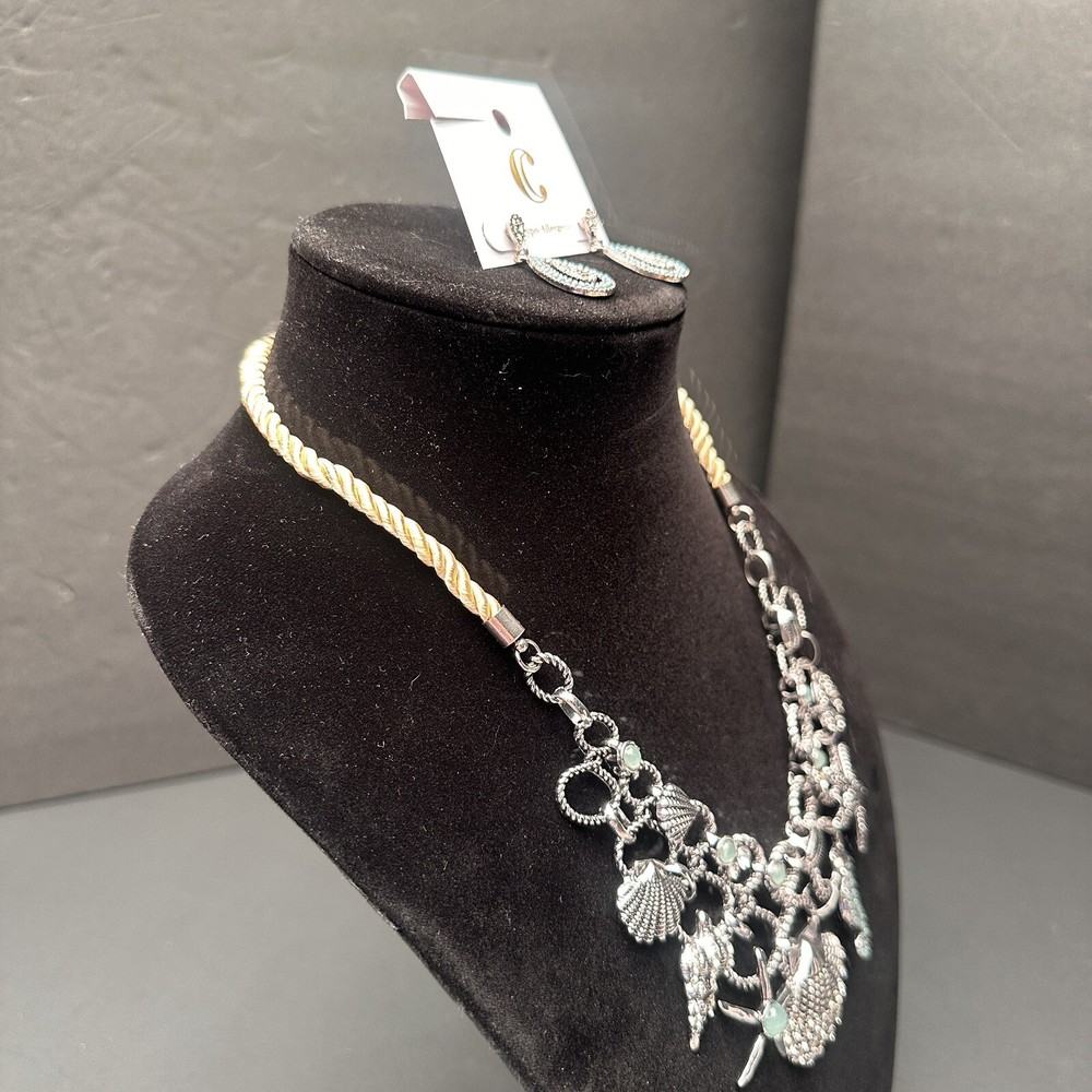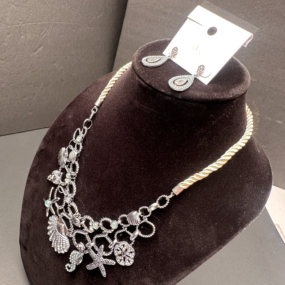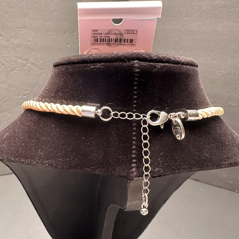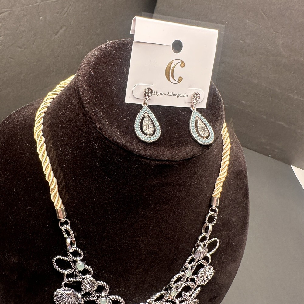 Signed Charming Charlie Khaki Rope & Sky Blue Crystal Silver Beach Theme Necklace and Earrings Set Earrings are new with tags. I don’t think that the necklace was ever worn, but I do not have a tag for it. Both are signed Charming Charlie