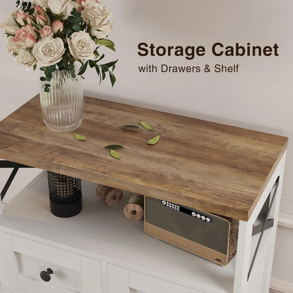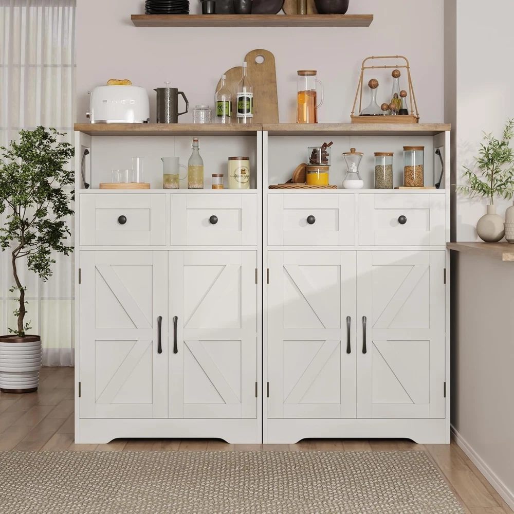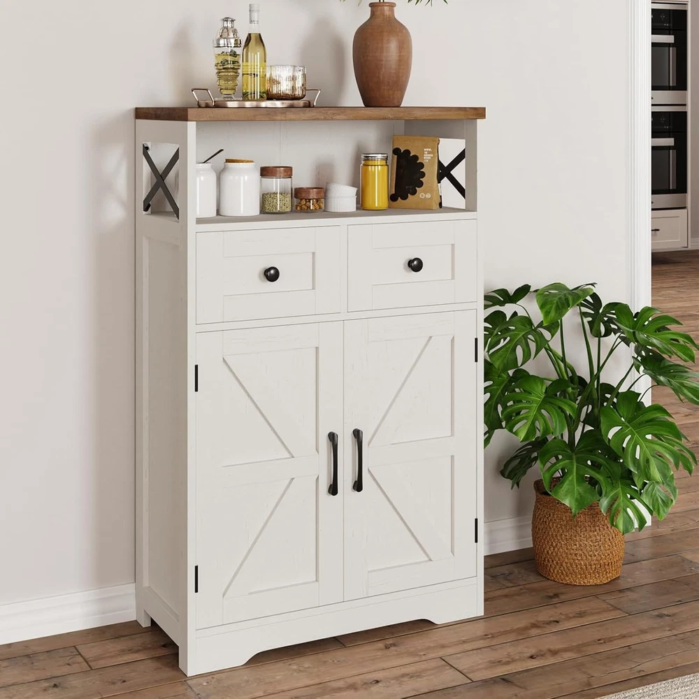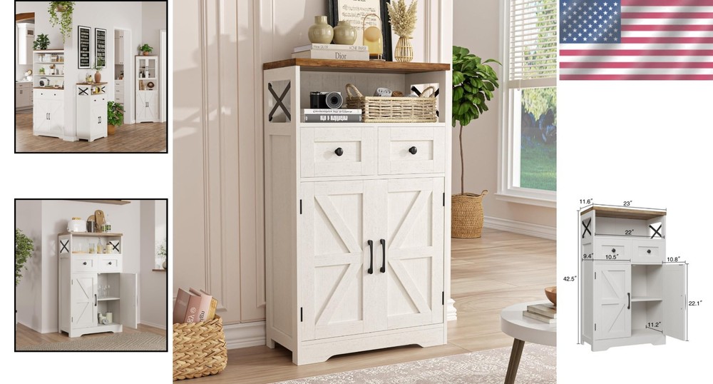 Item Depth: 11.5 in Frame Material: Engineered Wood Color: White Brand: Unbranded gtin13: Does not apply Item Width: Farmhouse Storage Cabinet Back Material Type: Engineered Wood Features: With Doors, With Drawers, Lined Special Feature: Lined Is Customizable: No Finish Type: Wooden Finish UPC: Does not apply Shape: Rectangular Number of Shelves: 1 Finish: Wooden Finish Mounting: Free Standing, Floor Mount Style: Farmhouse Door Style: Slab Room: Kitchen, Bathroom, Living Room, Home Office/Study, Dining Room Type: Storage Cabinet Distance from Floor to Bottom: 4 in Set Includes: Shelves Product Dimensions: 11.5"d X 23.5"w X 42.5"h Item Length: Farmhouse Storage Cabinet Additional Parts Required: No Number Of Compartments: 5 Department: Unisex Baby & Toddler, Adults, Teens, Kids Item Weight: 41.5 lb Material: Engineered Wood Included Components: Shelves Size: 23.5"w X 11.5"d X 42.5"h Weight Limit: 110 Pounds Number of Drawers: 2 Handle Material: Stainless Steel Item Height: Farmhouse Storage Cabinet Top Material Type: Engineered Wood Installation Type: Freestanding Number of Doors: 2 Number Of Pieces: 1 Mounting Type: Floor Mount Number Of Levels: 4 Base Type: Legs Recommended Uses For Product: Tea & Coffee Bar Number of Items in Set: 1